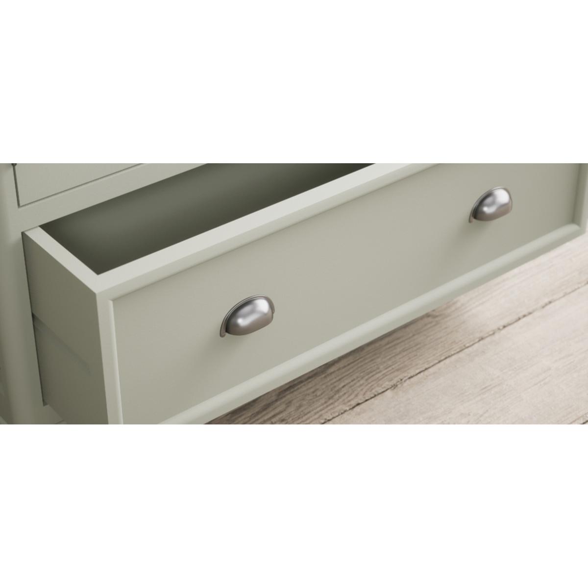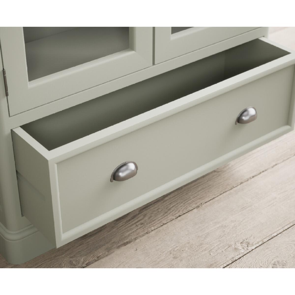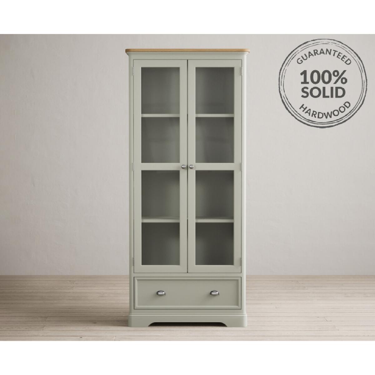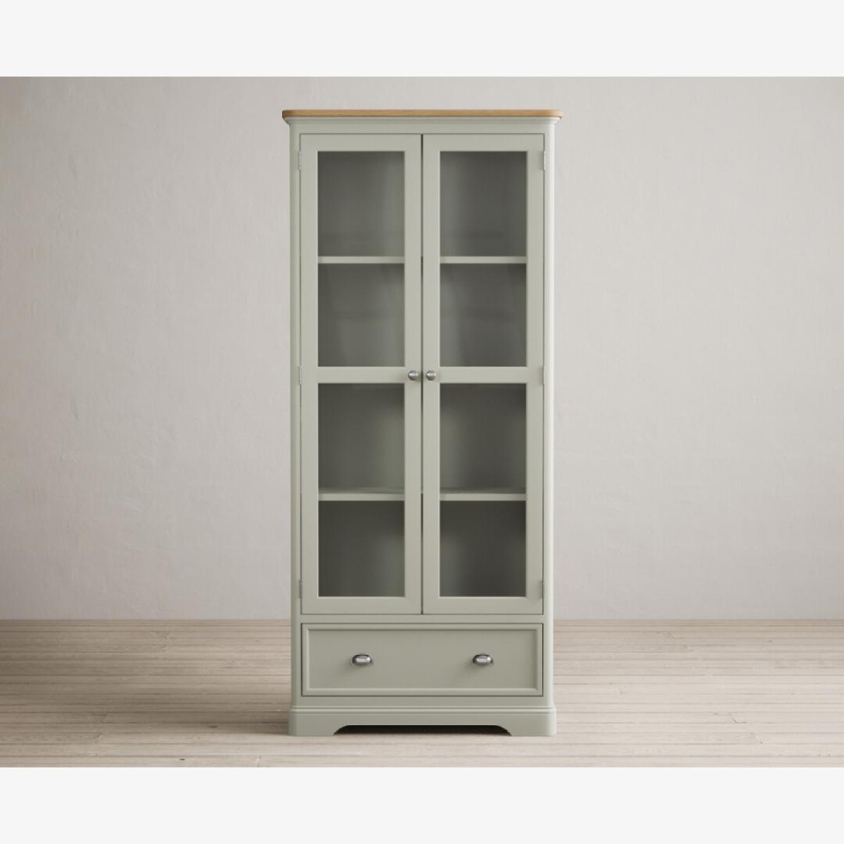 The Bridstow Soft Green Glazed Display Cabinet features a soft green painted solid hardwood frame, topped with 100% solid oak and complete with dovetail drawers.