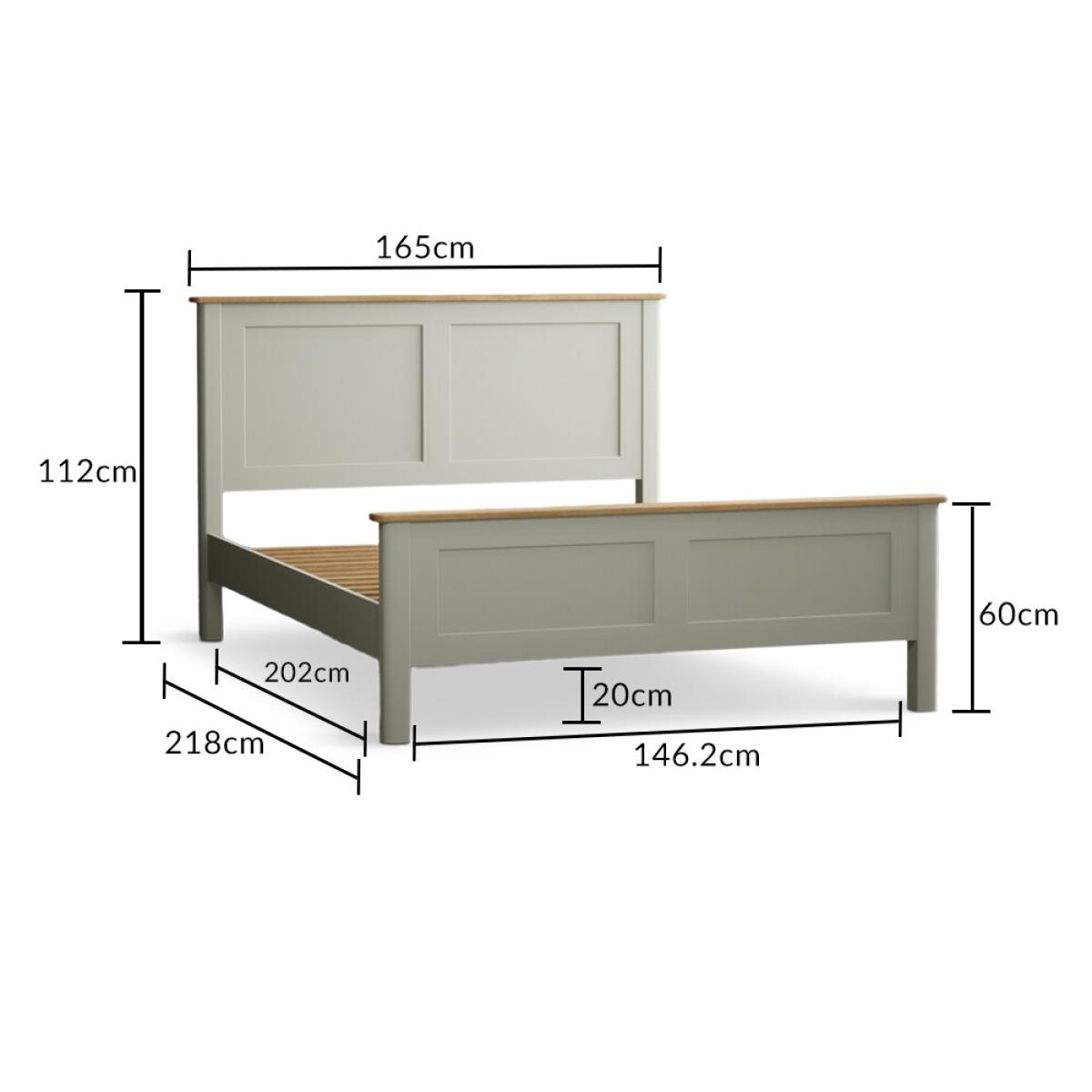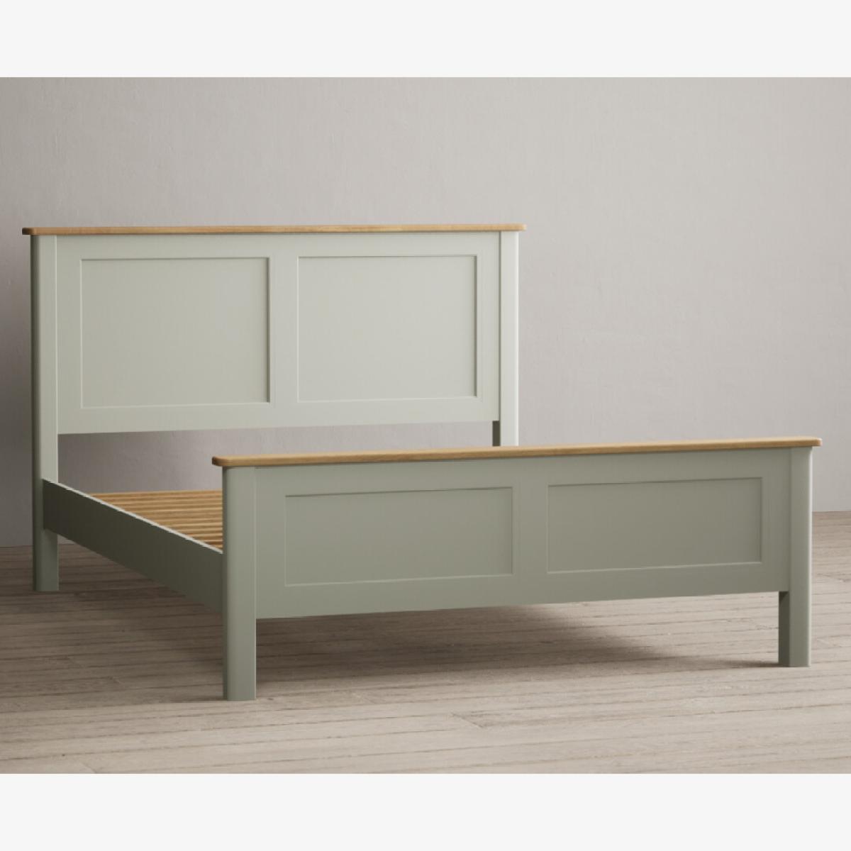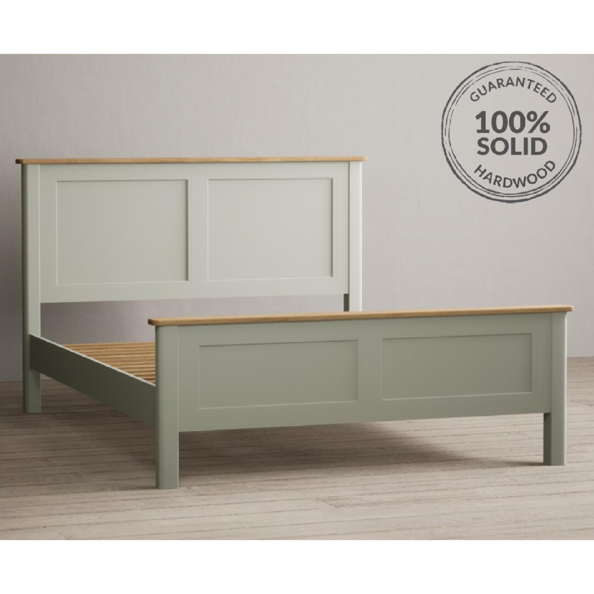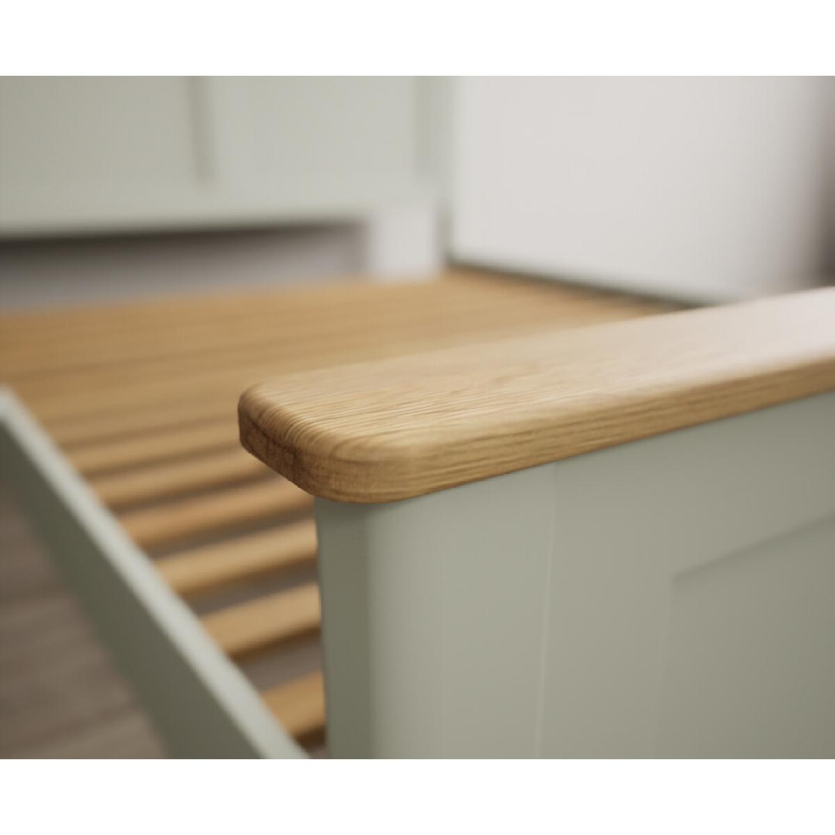 The Bridstow Soft Green Kingsize Bed is crafted from solid hardwood with a soft green painted finish, with solid oak on the headboard and footboard and complete with solid wood slats.