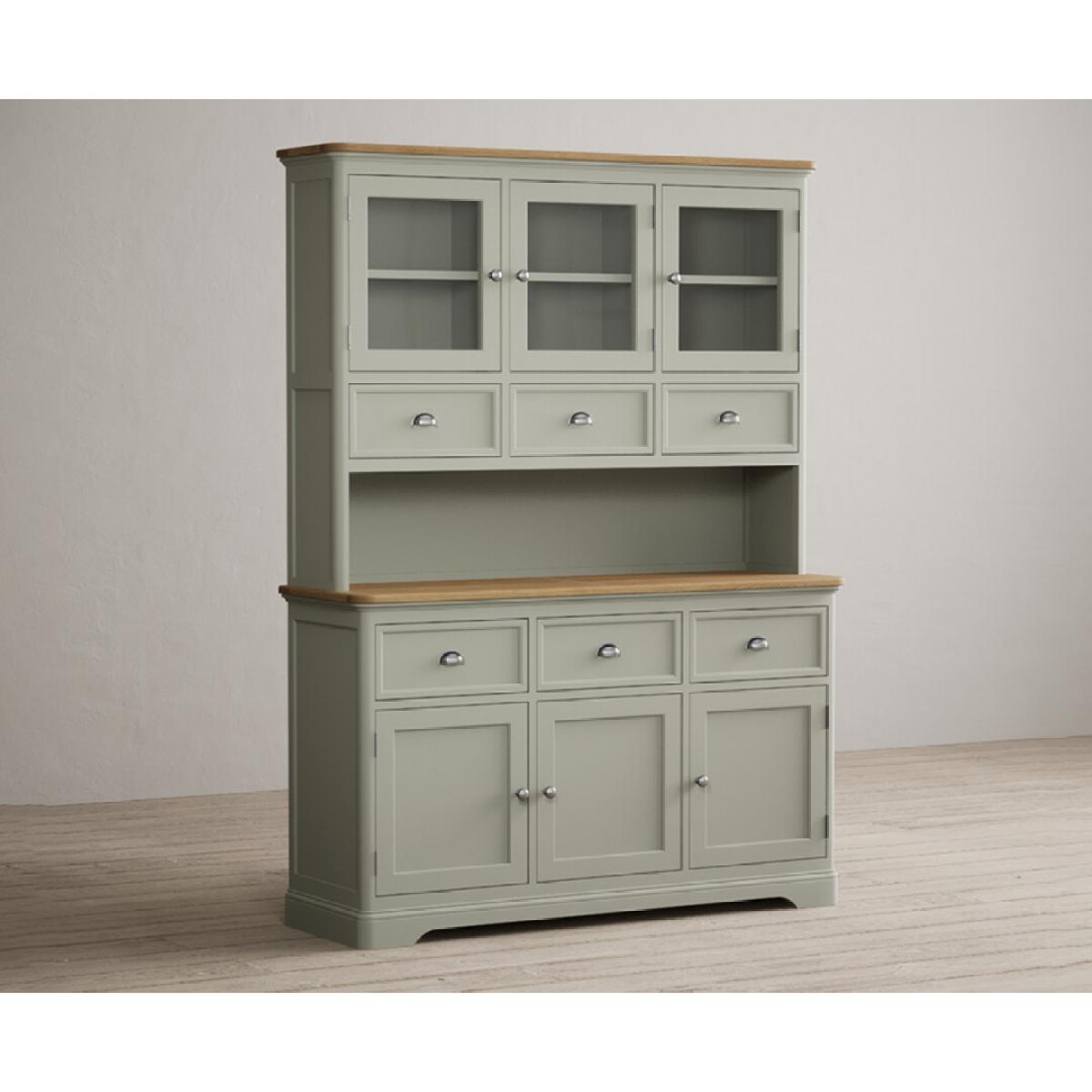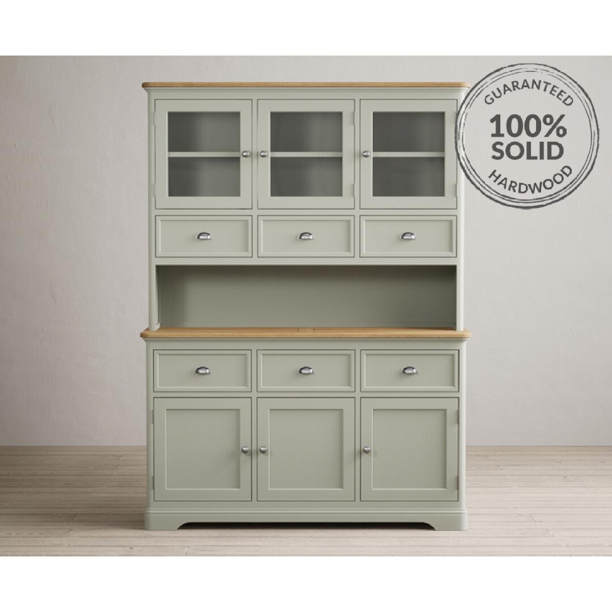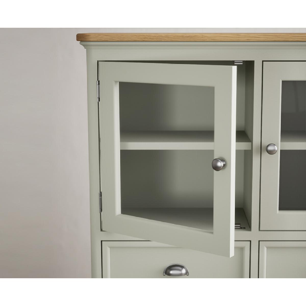 The Bridstow Soft Green Large Dresser is crafted from solid hardwood with a soft green painted finish and topped with solid oak, complete with dovetail drawers.