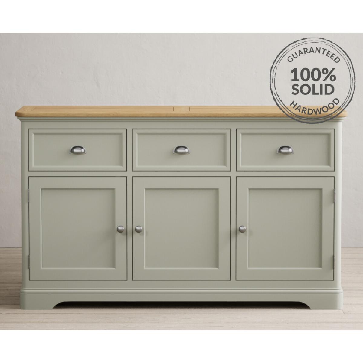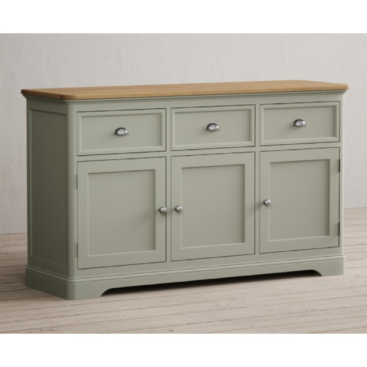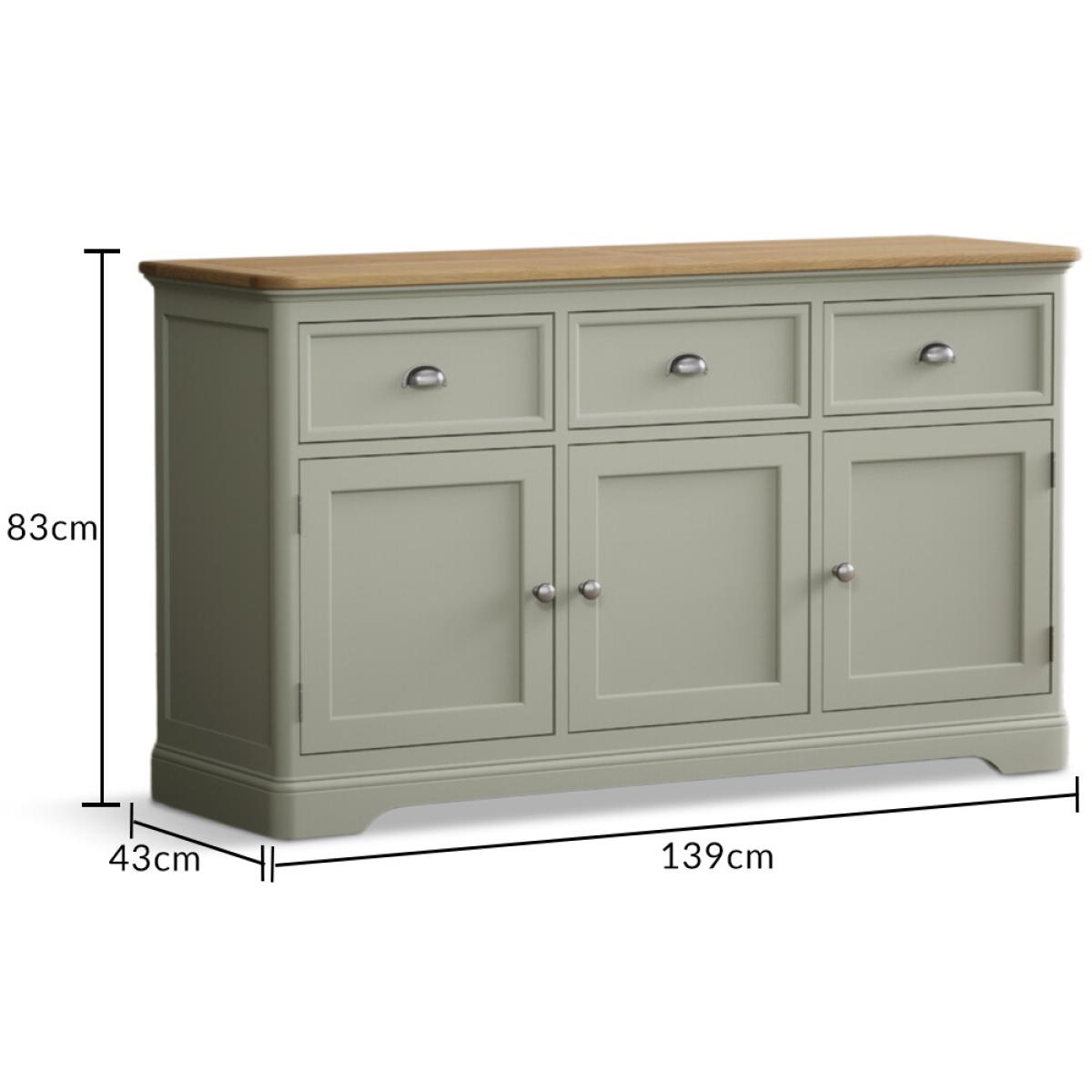 The Bridstow Soft Green Large Sideboard is crafted from solid hardwood with a sage green painted finish, topped with solid oak and complete with cupboards and dovetail drawers.