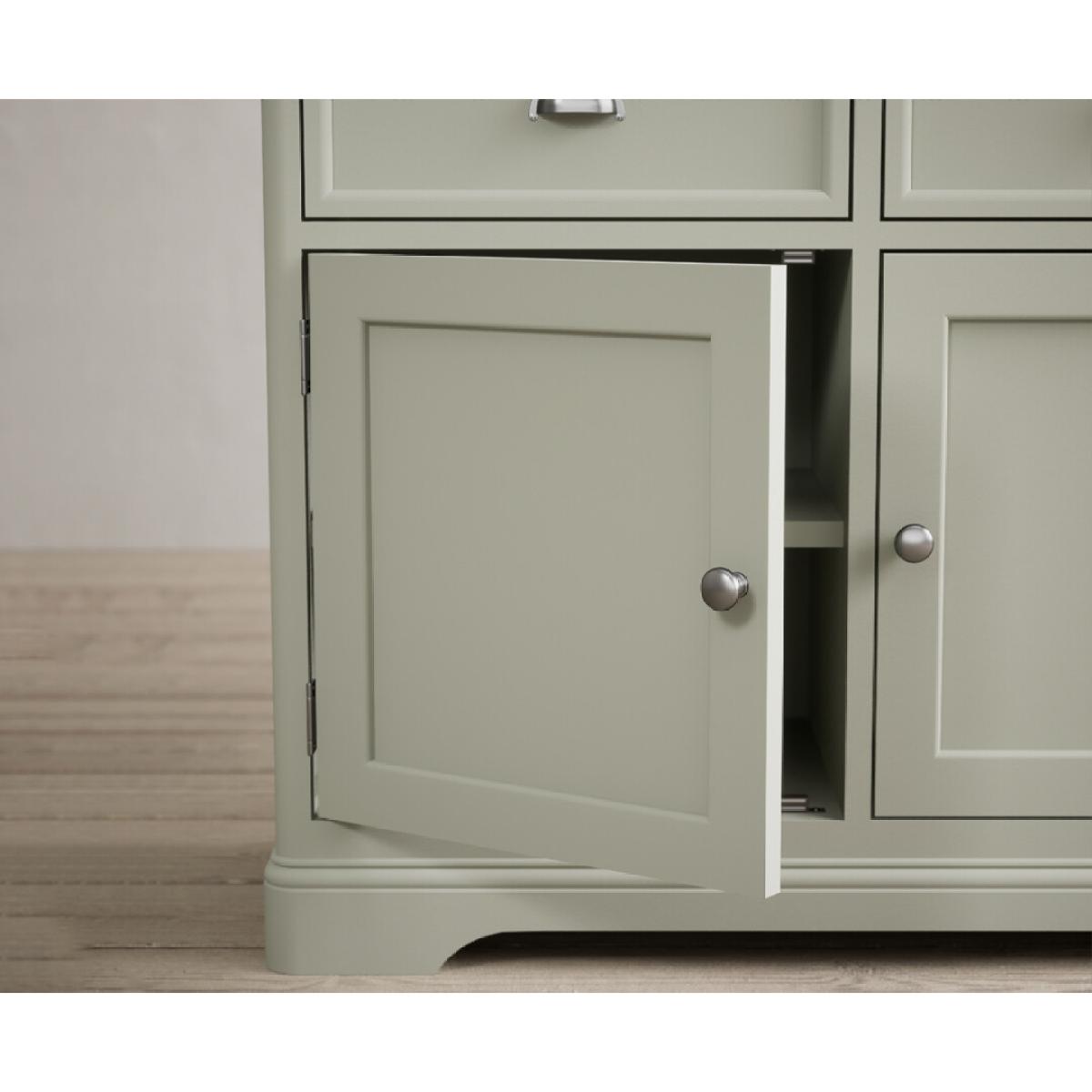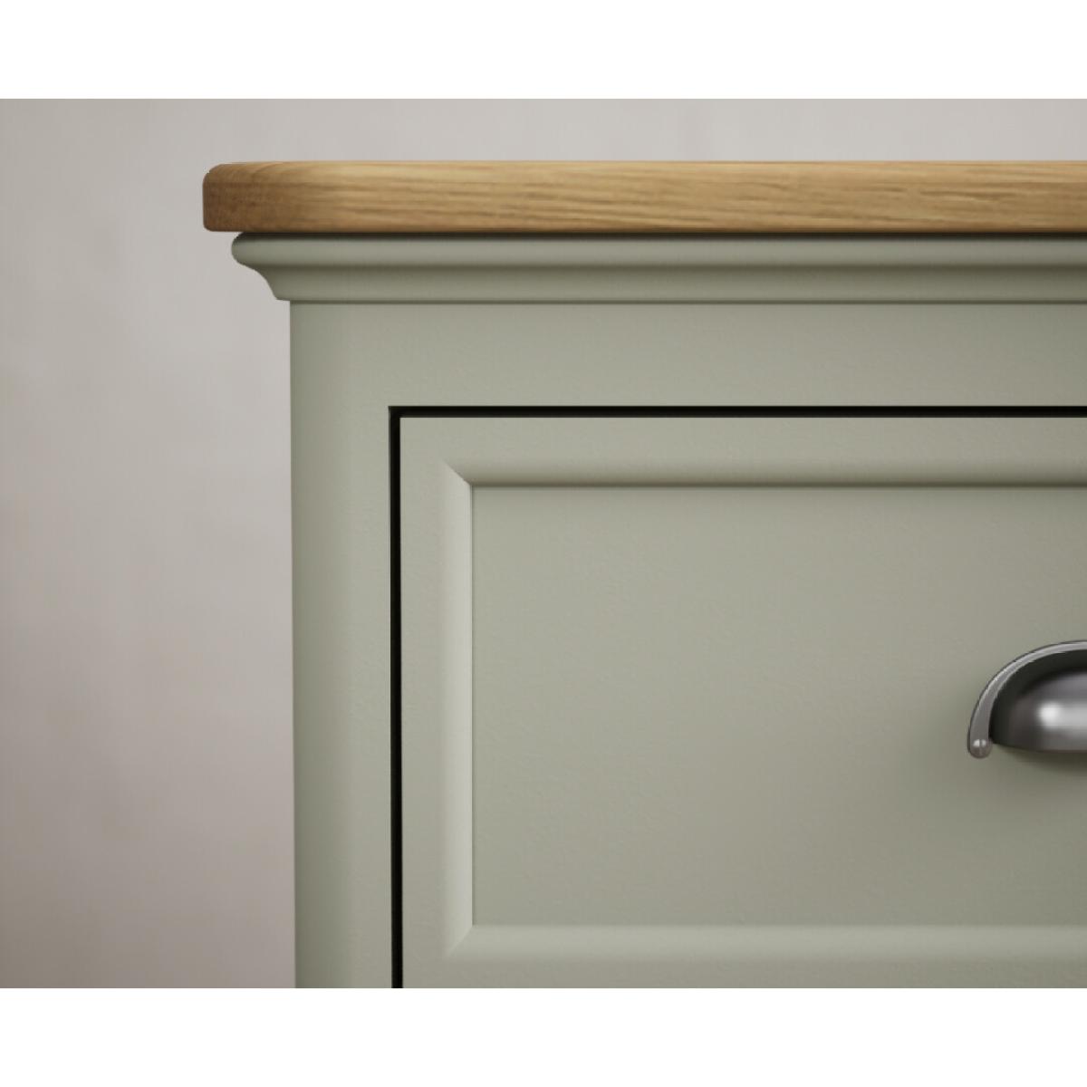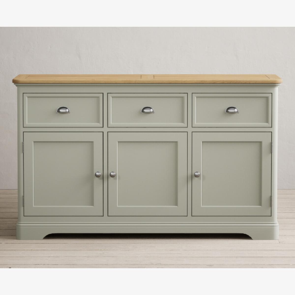The Bridstow Soft Green Large Sideboard is crafted from solid hardwood with a sage green painted finish, topped with solid oak and complete with cupboards and dovetail drawers.