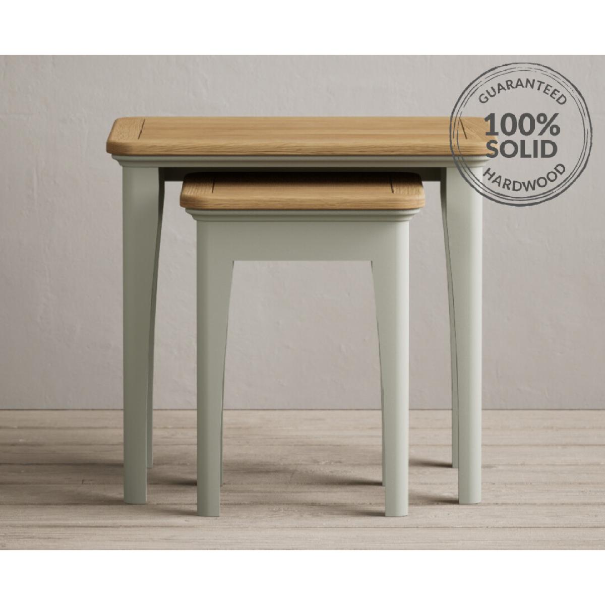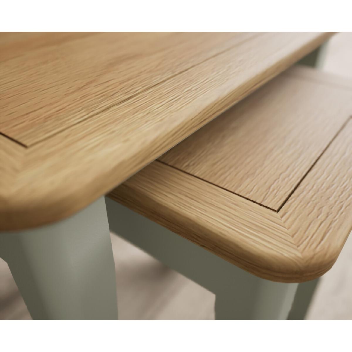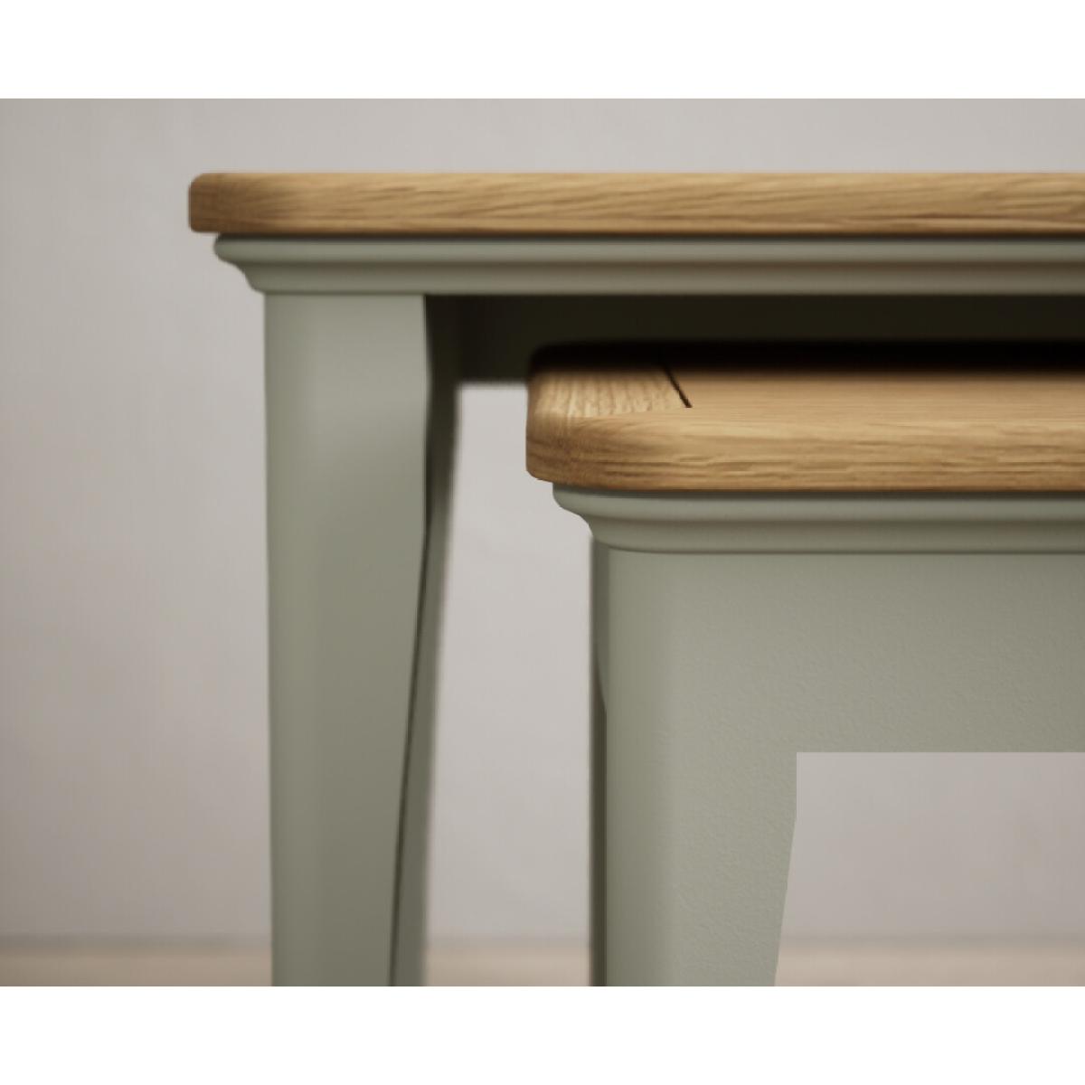 The Bridstow Soft Green Nest of Tables is a set of two versatile tables with solid hardwood legs with a soft green painted finish, topped with solid oak.