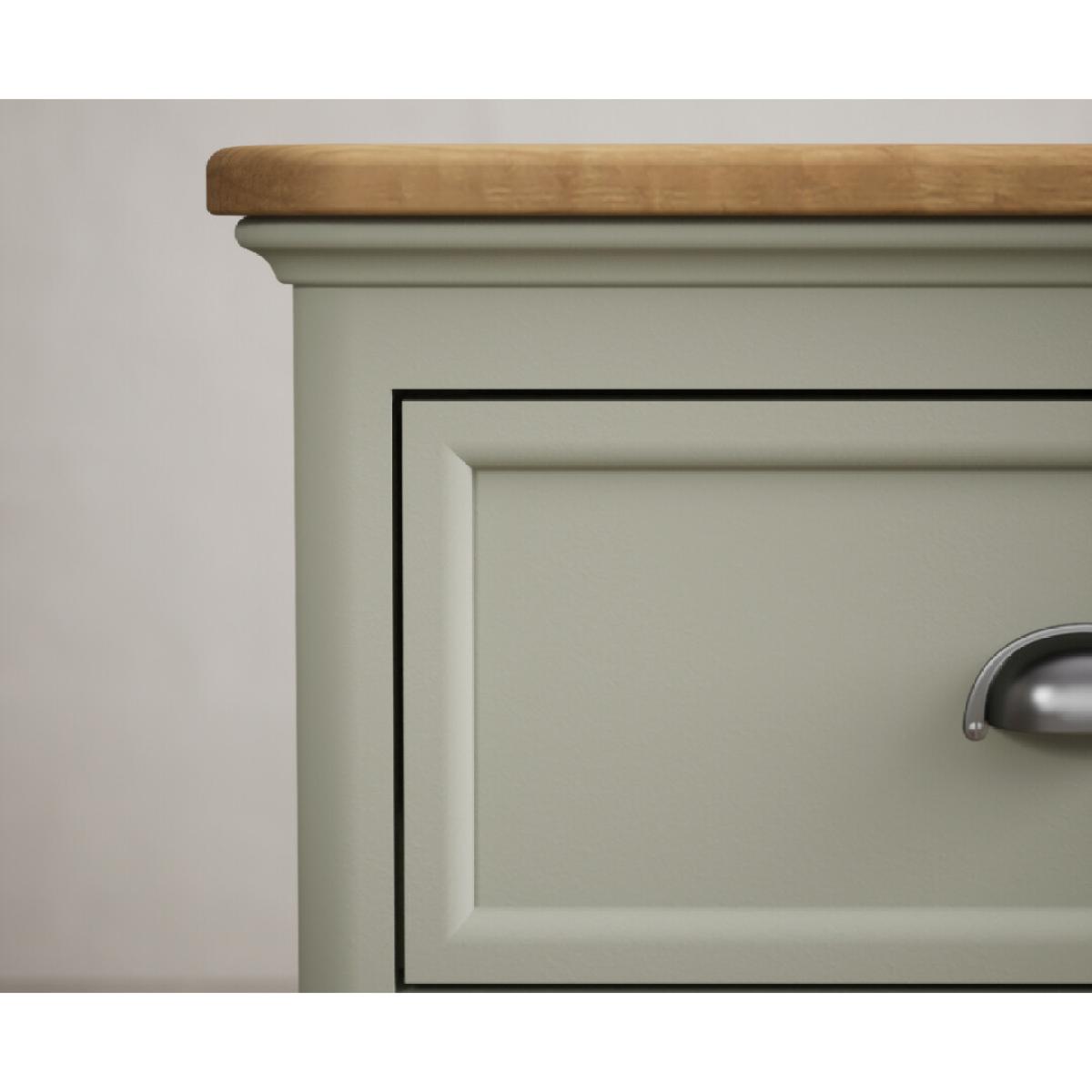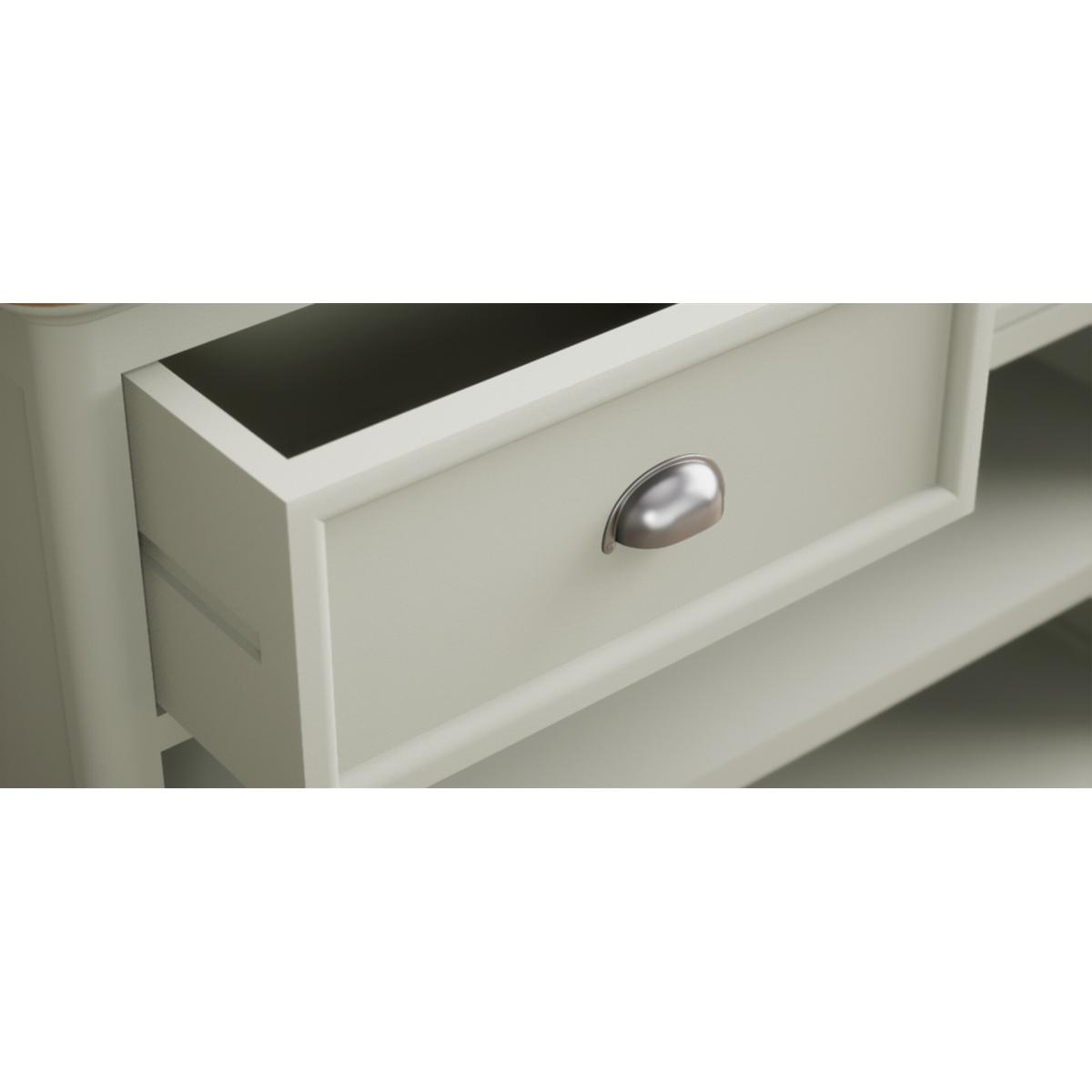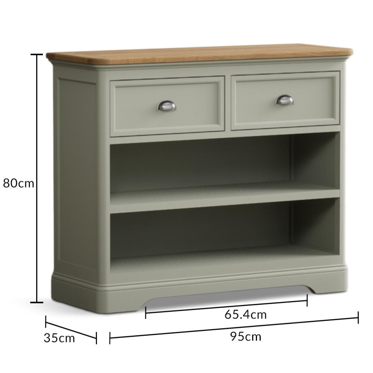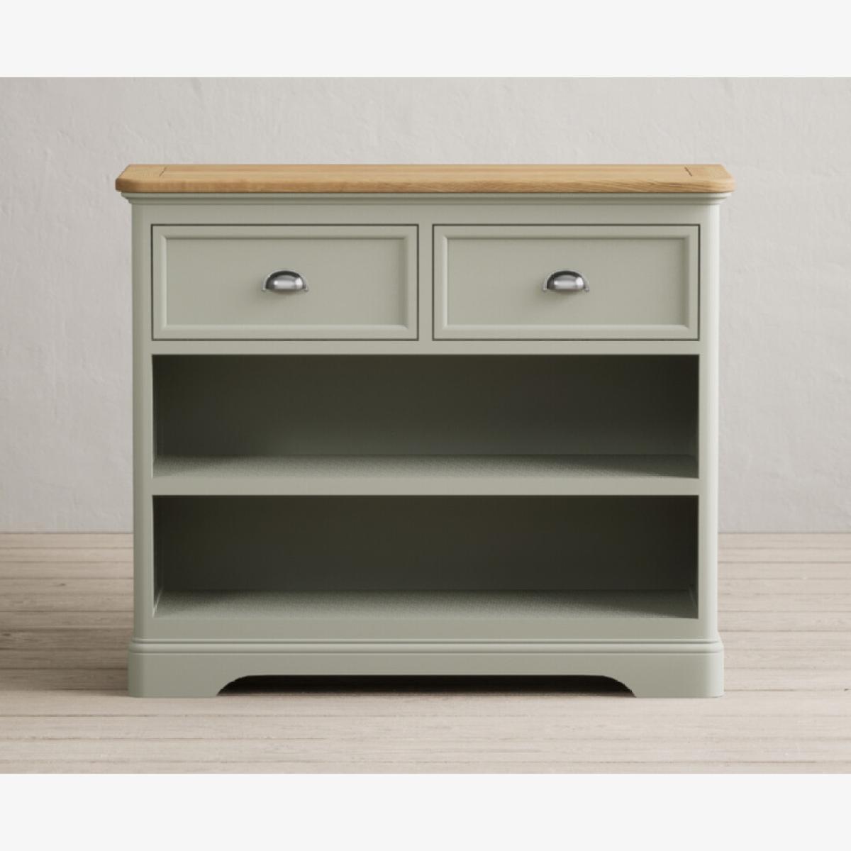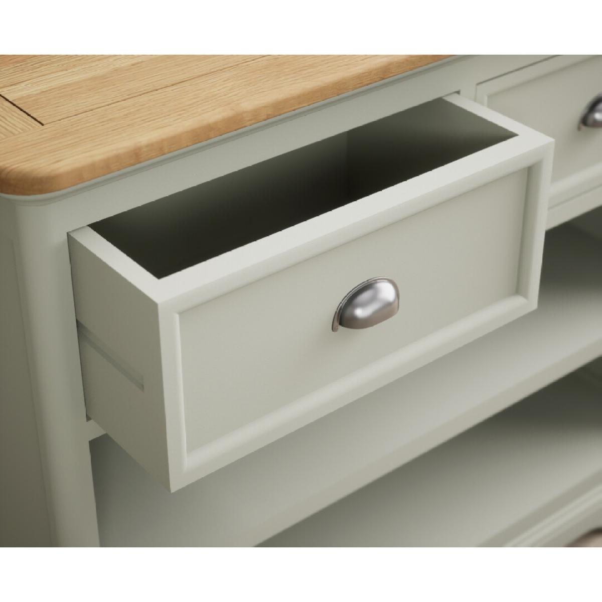 The Bridstow Soft Green Painted Storage Console Table features a soft green painted solid hardwood frame and 100% solid oak top, with shelves and Dovetail drawers.