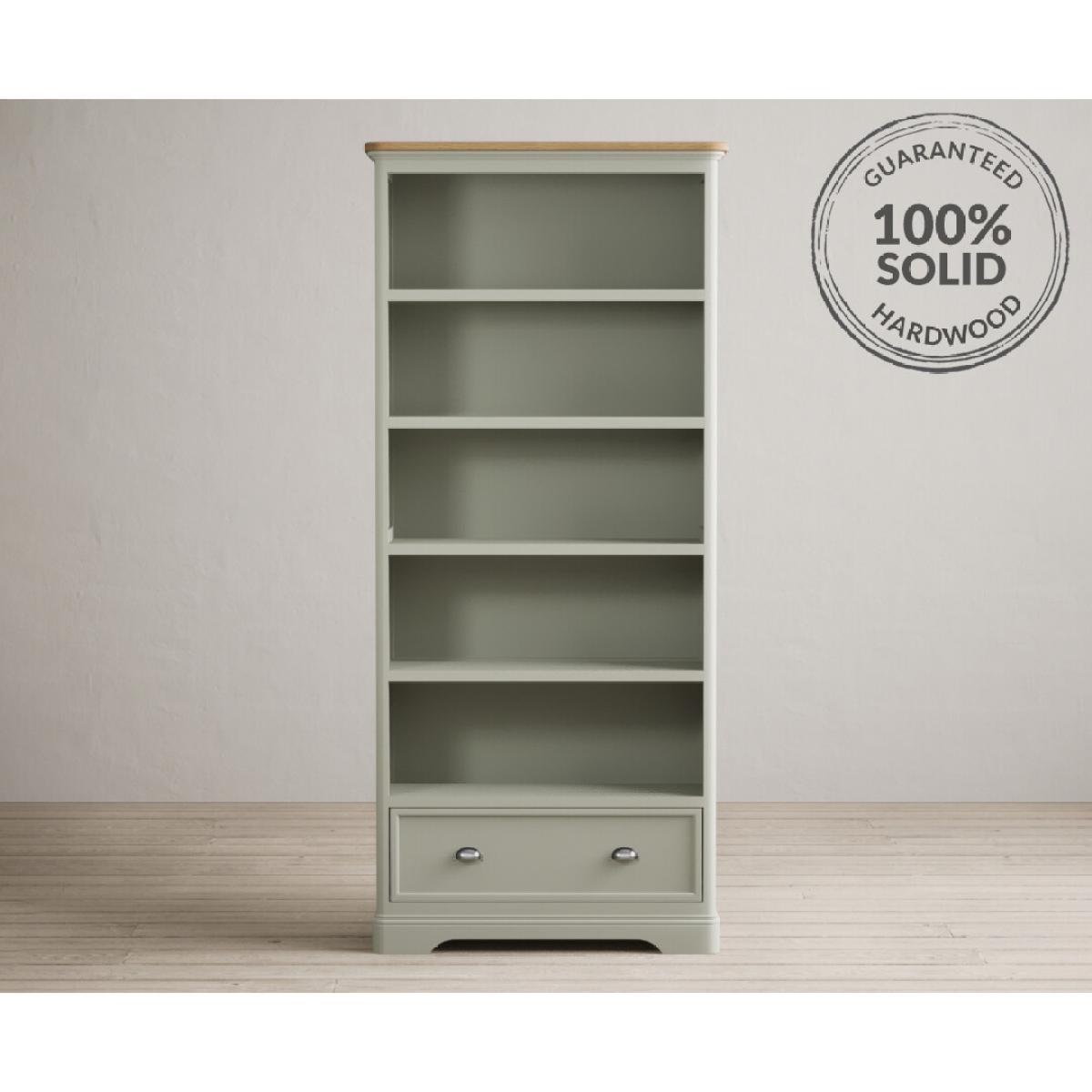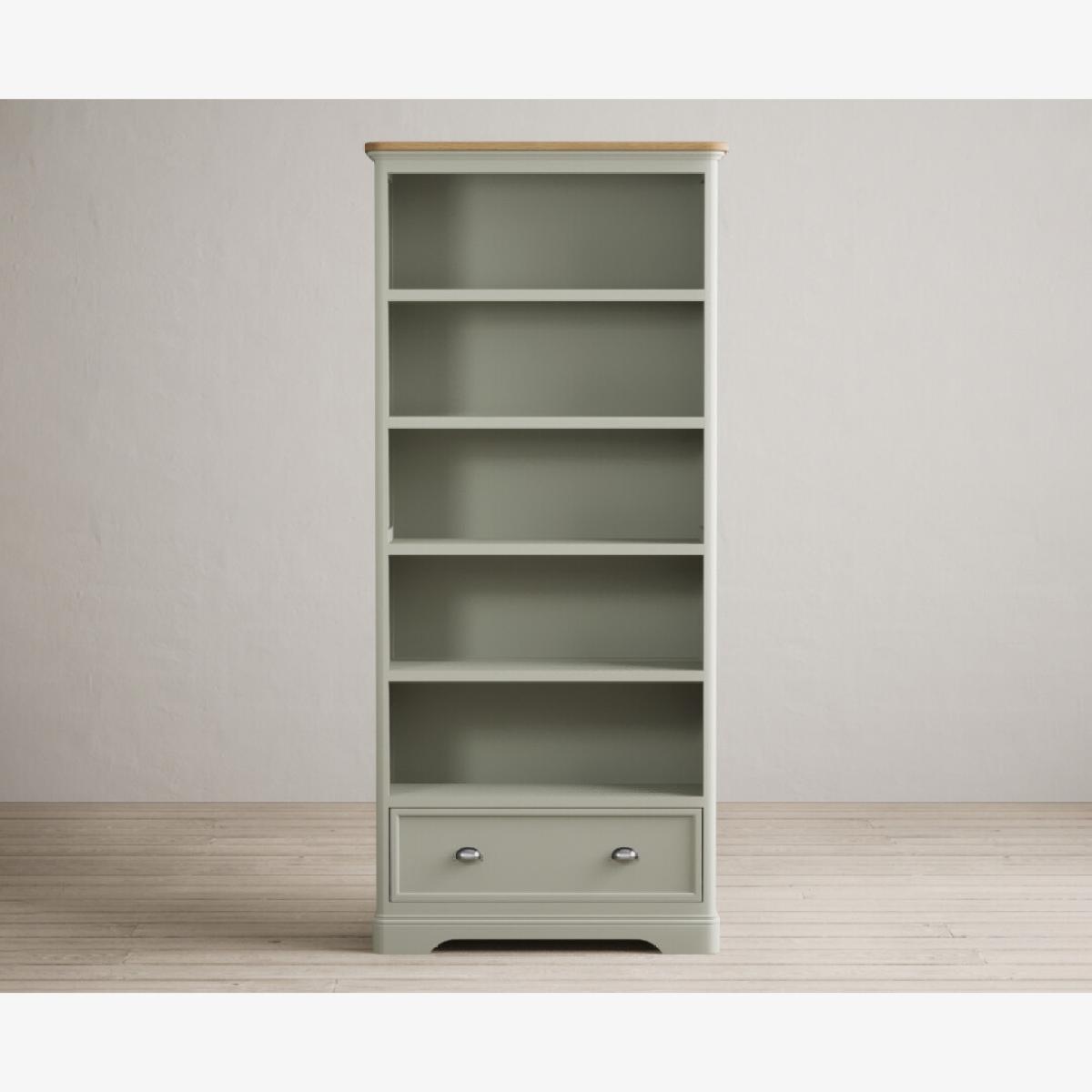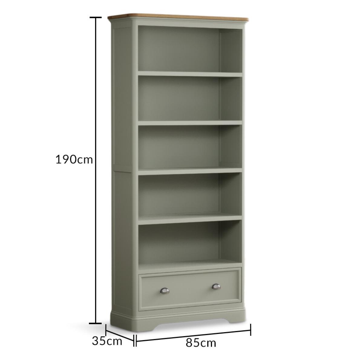The Bridstow Soft Green Tall Bookcase is crafted from solid hardwood with a soft green painted finish, topped with solid oak, with sturdy shelves and a lower drawer.