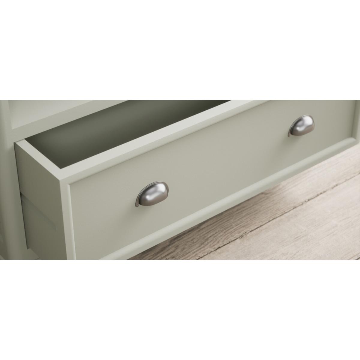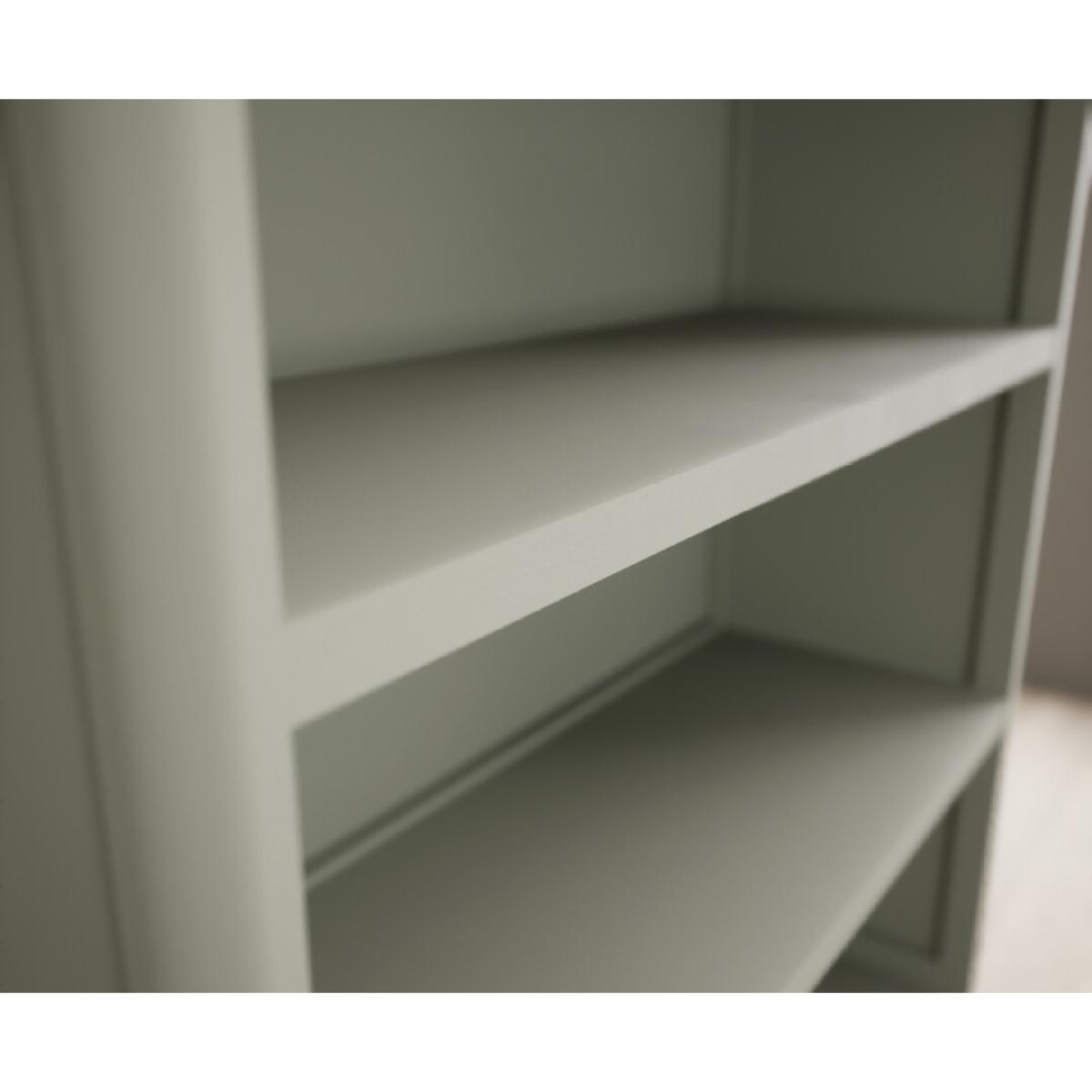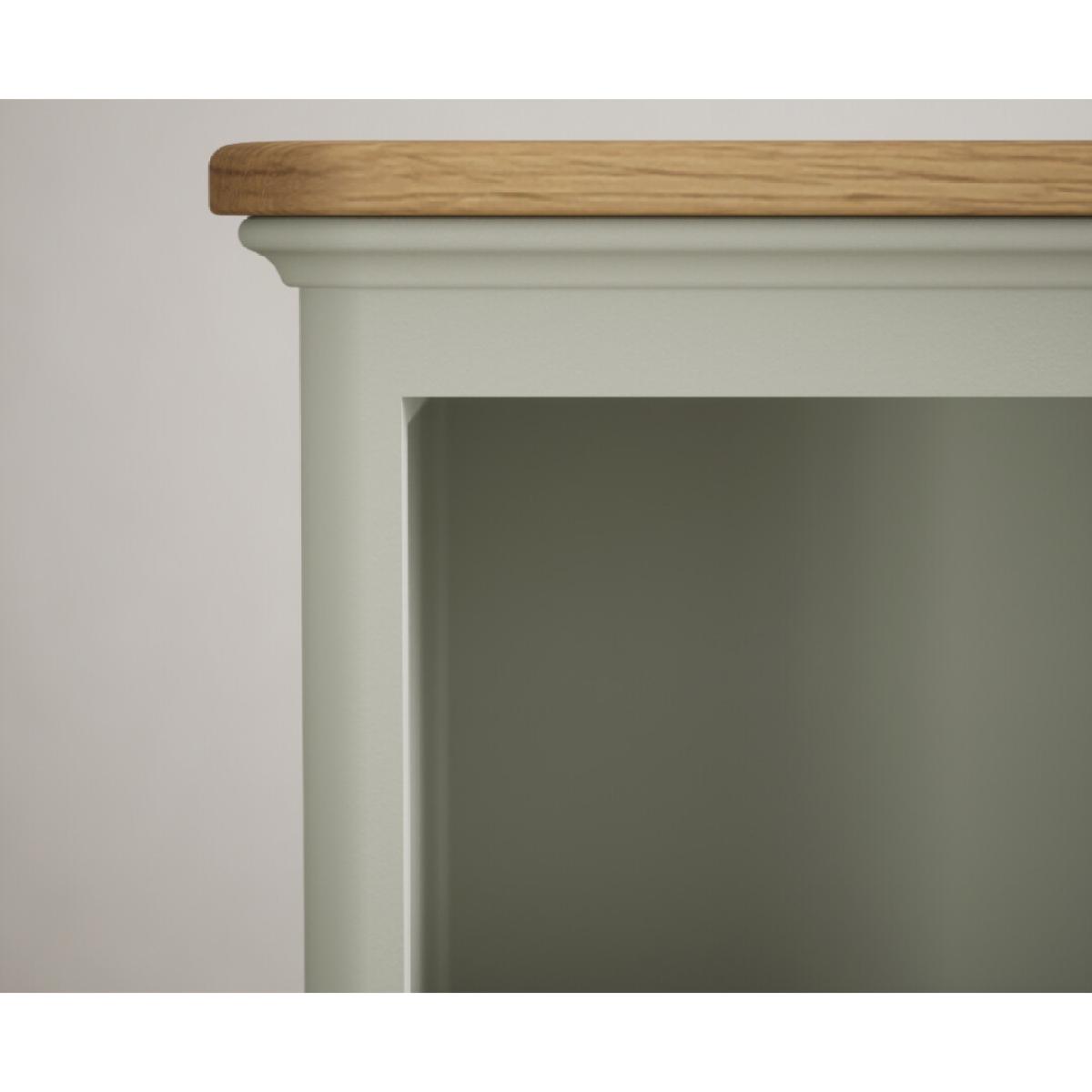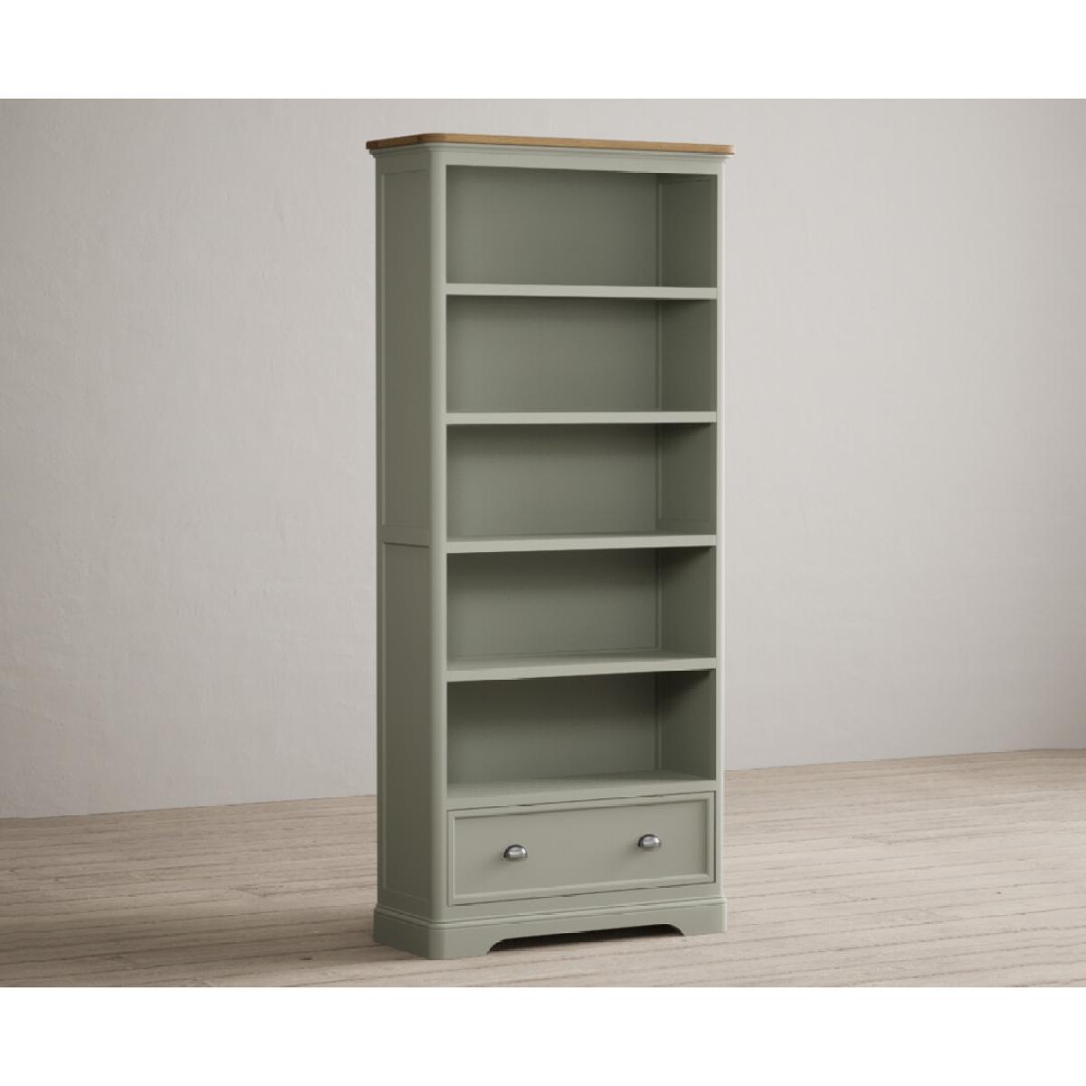 The Bridstow Soft Green Tall Bookcase is crafted from solid hardwood with a soft green painted finish, topped with solid oak, with sturdy shelves and a lower drawer.