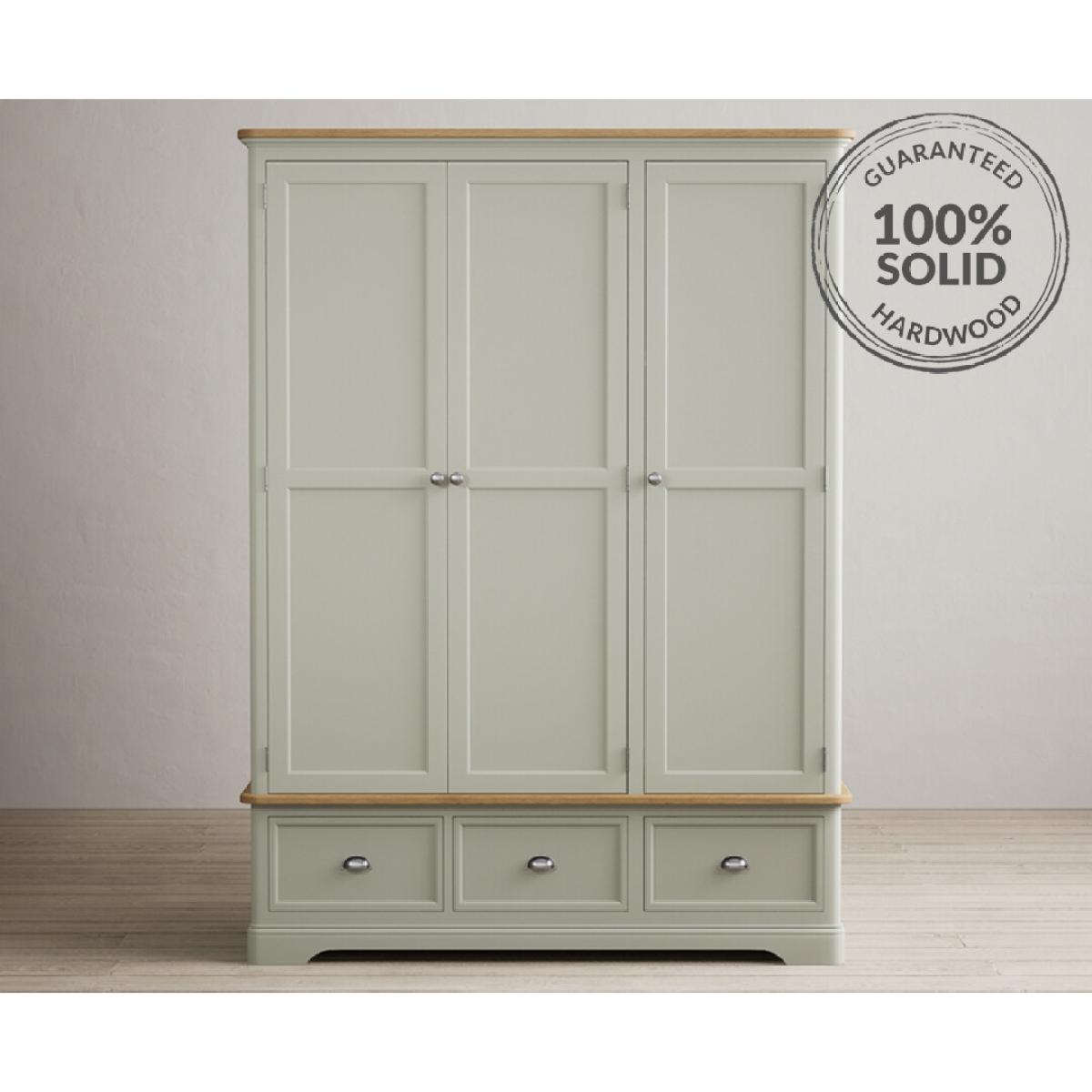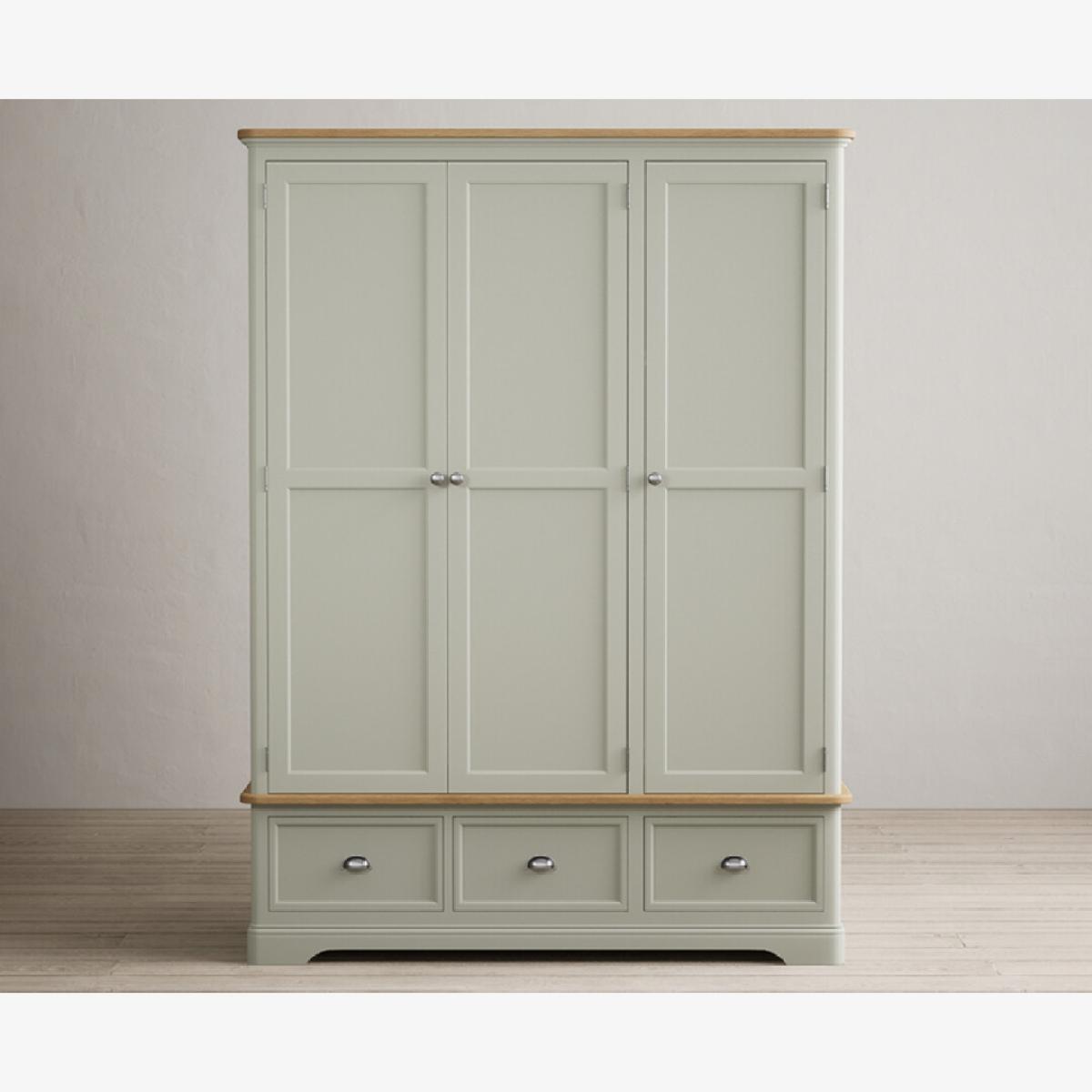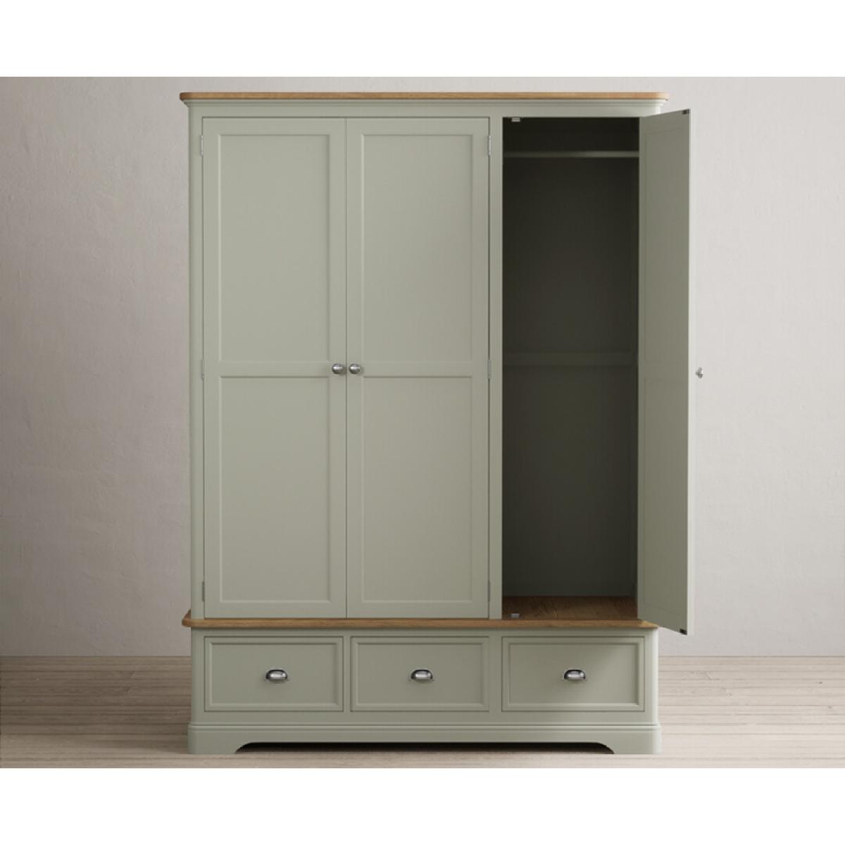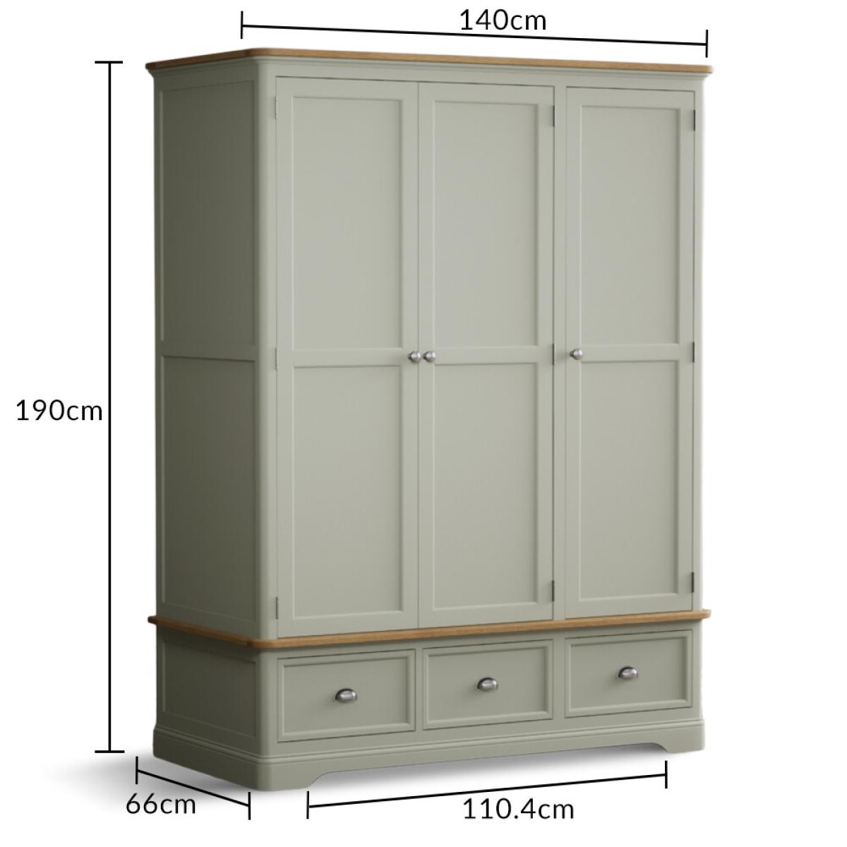 The Bridstow Soft Green Triple Wardrobe is made from soft green painted solid hardwood with a solid oak top, with hanging space, shelves and dovetail drawers.