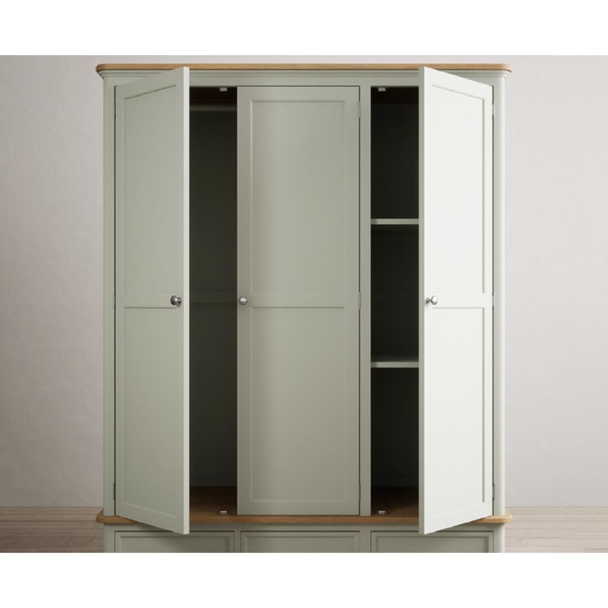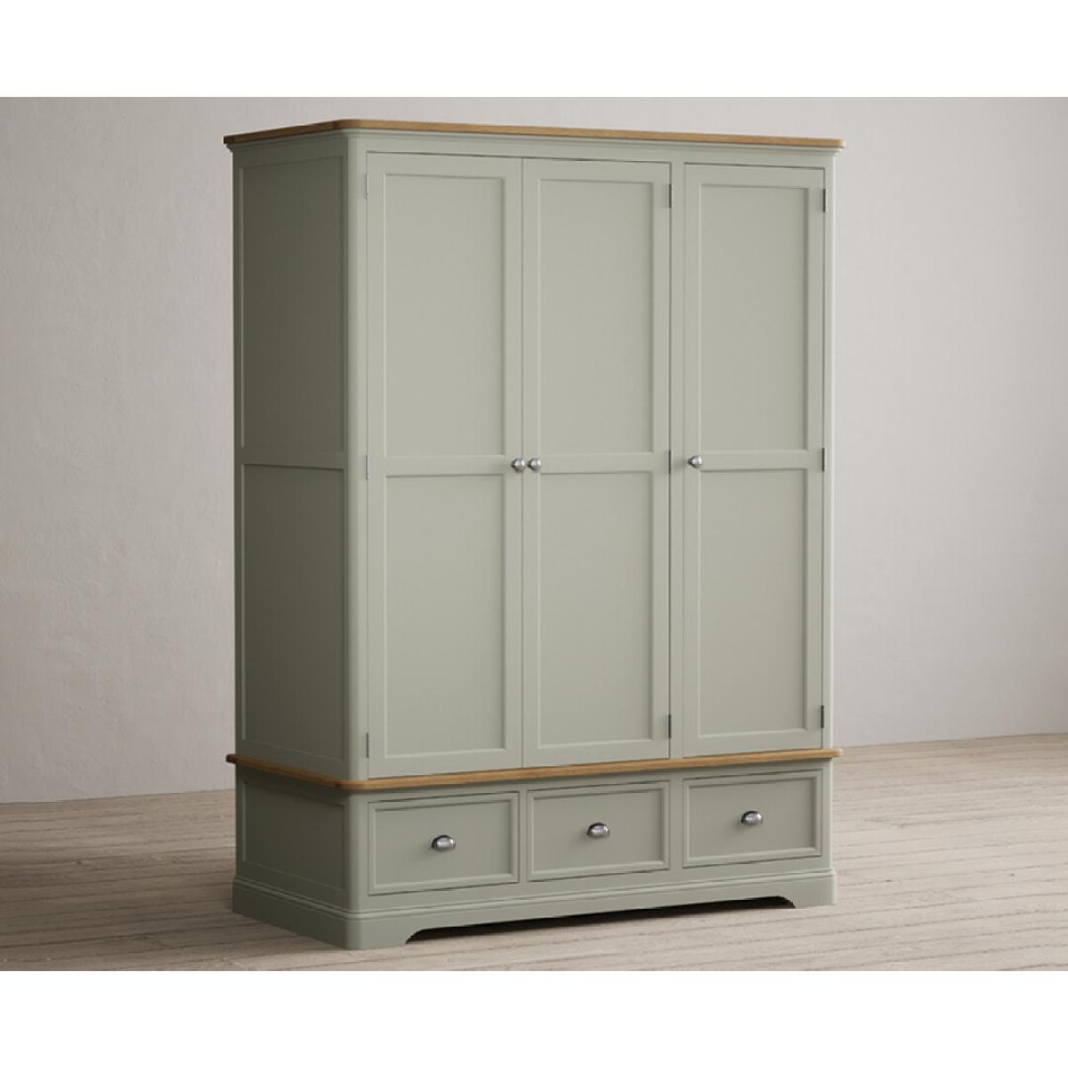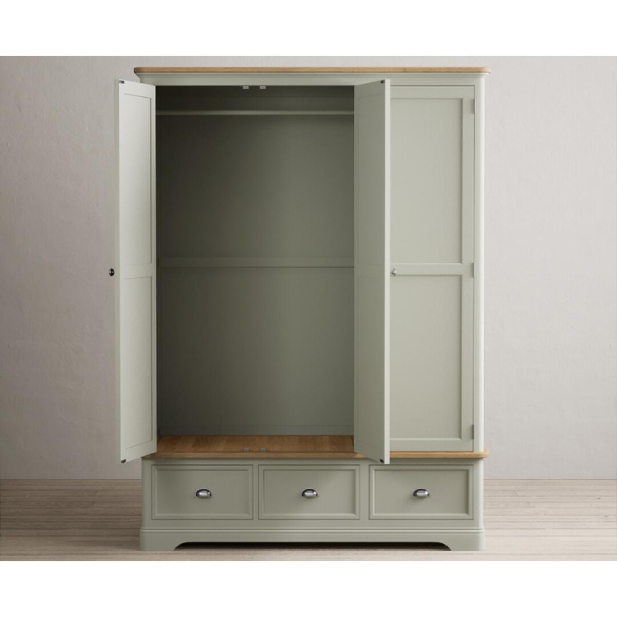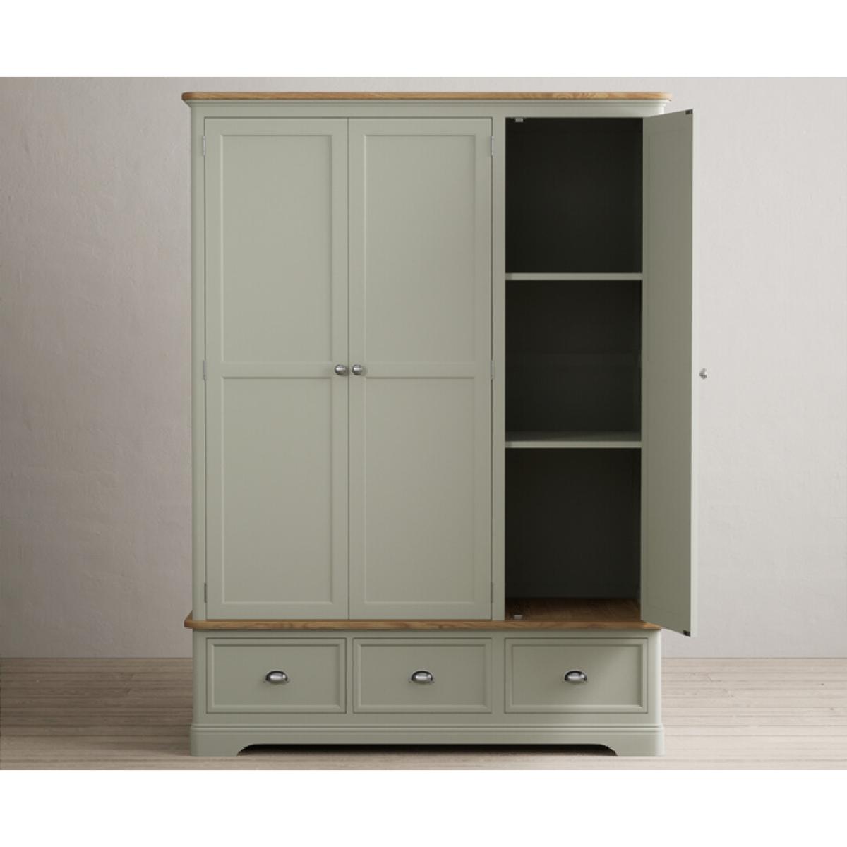 The Bridstow Soft Green Triple Wardrobe is made from soft green painted solid hardwood with a solid oak top, with hanging space, shelves and dovetail drawers.