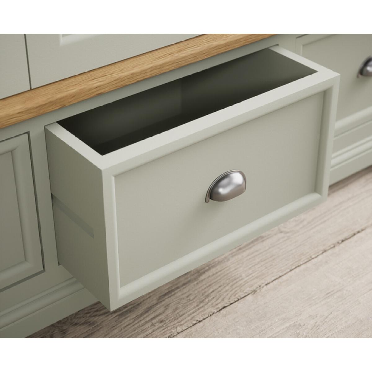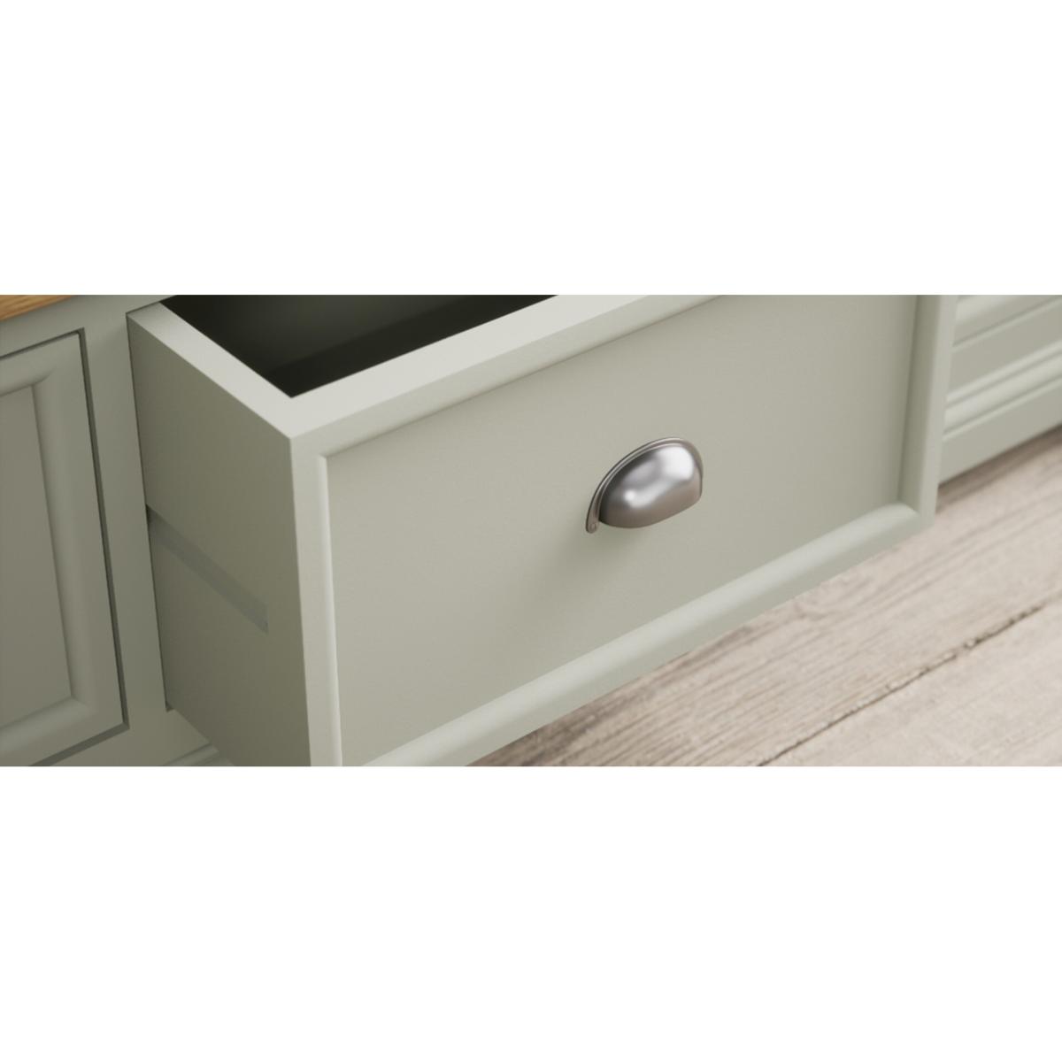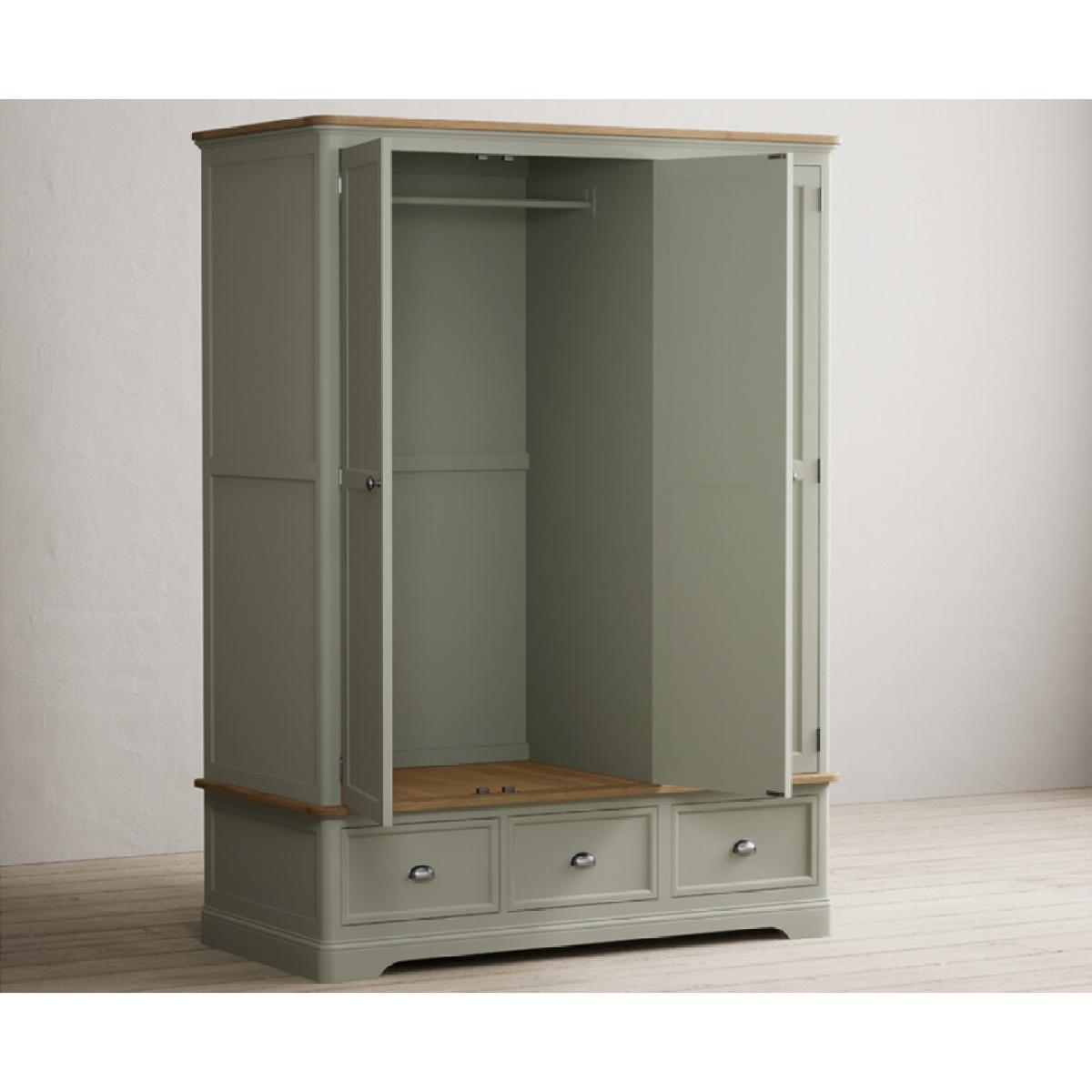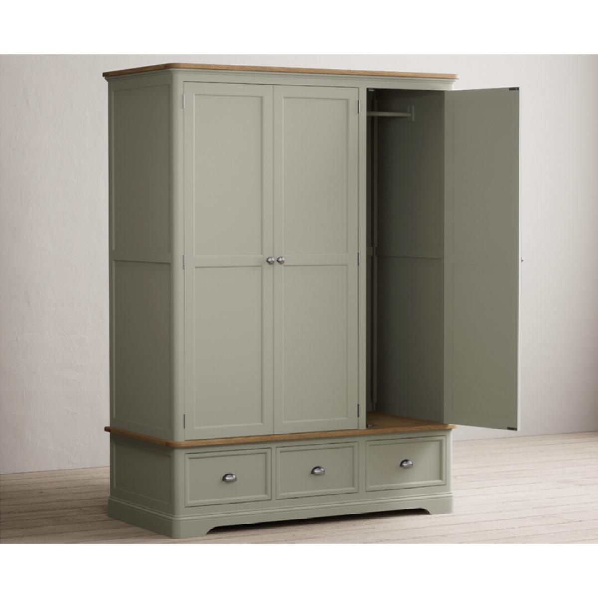 The Bridstow Soft Green Triple Wardrobe is made from soft green painted solid hardwood with a solid oak top, with hanging space, shelves and dovetail drawers.