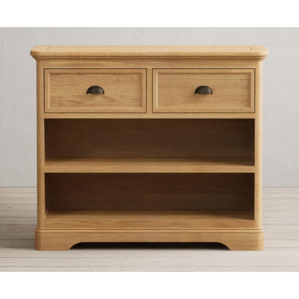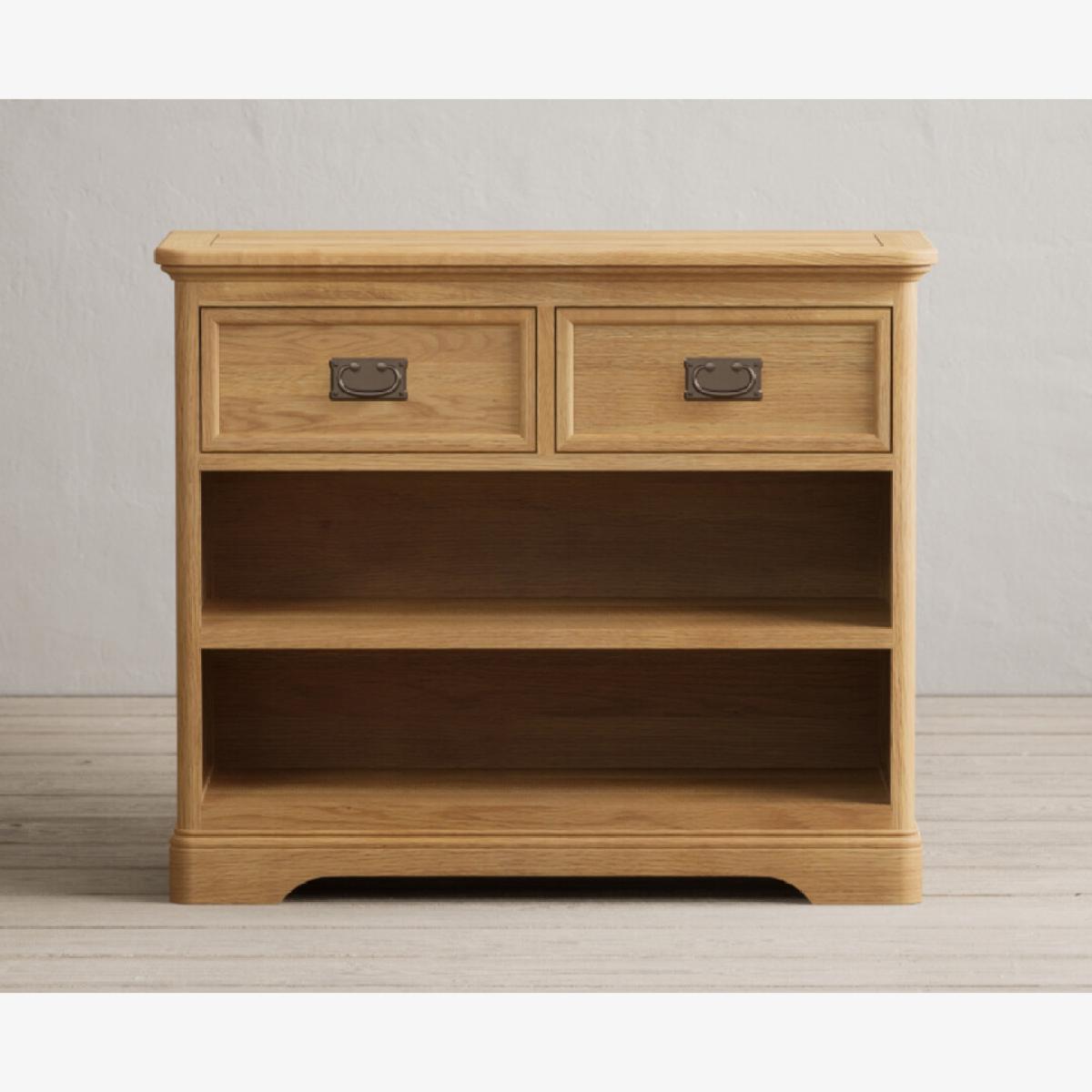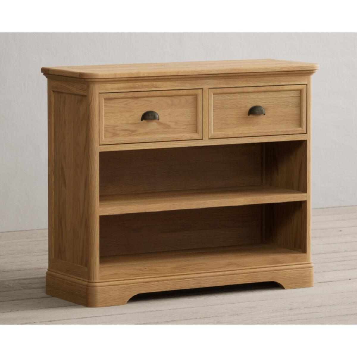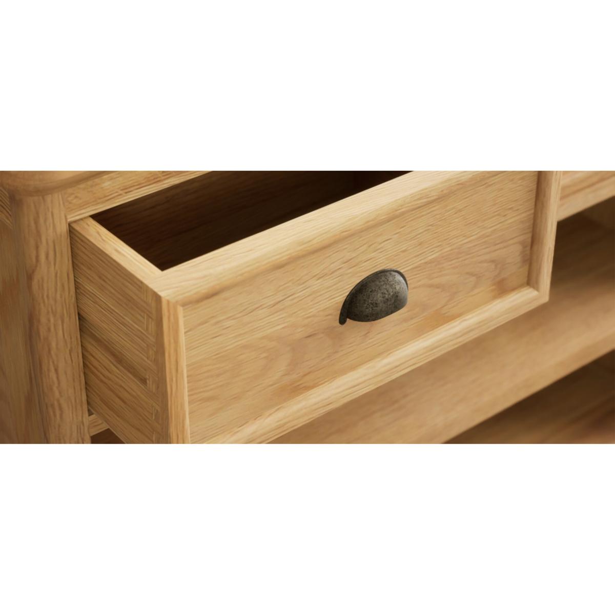 The Bridstow Natural Oak Storage Console Table has been crafted from solid oak and features shelves and Dovetail drawers.