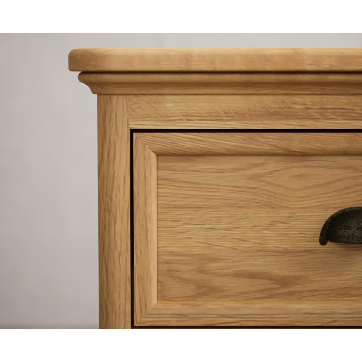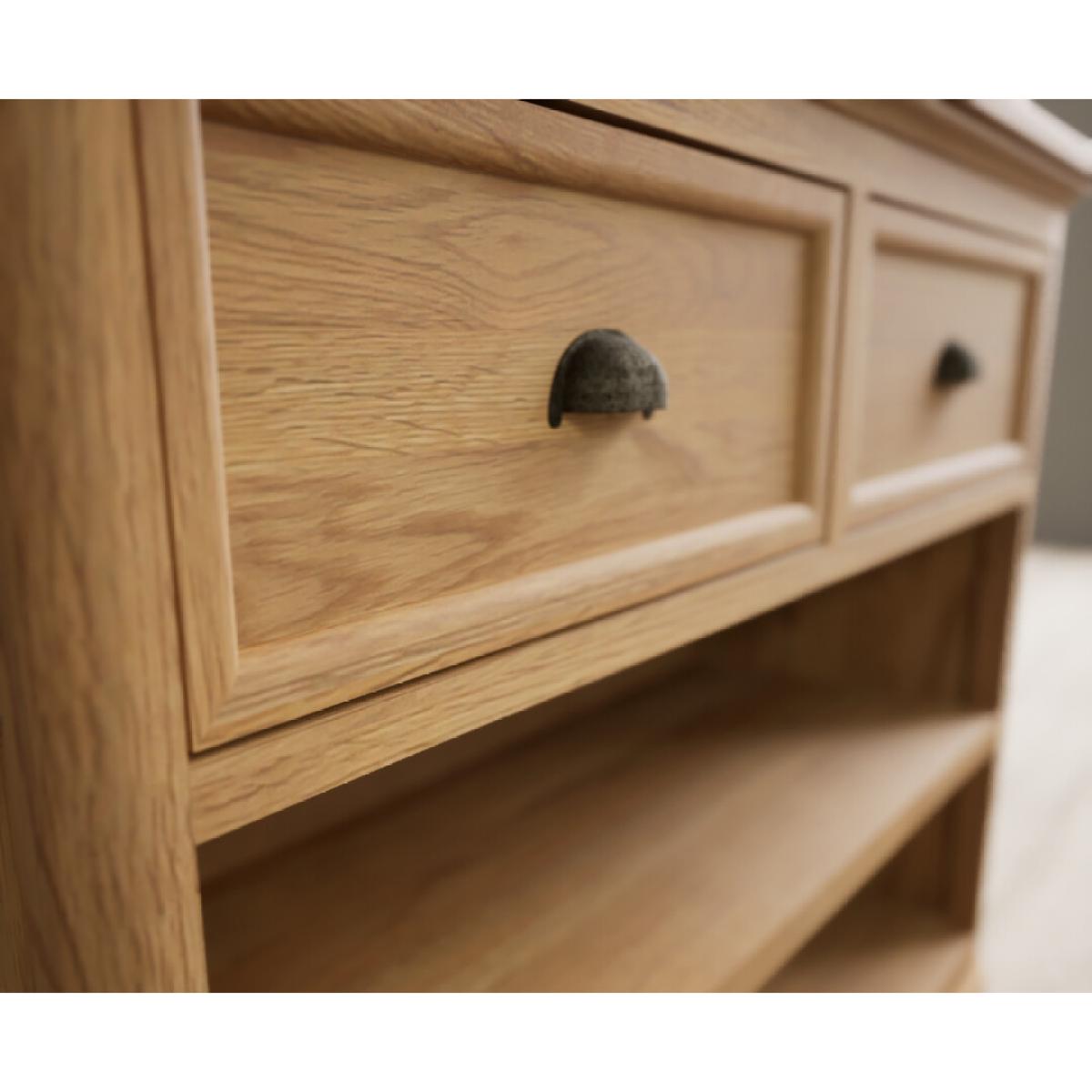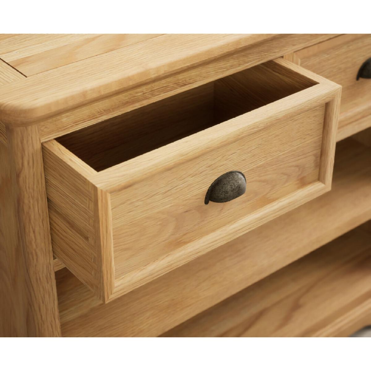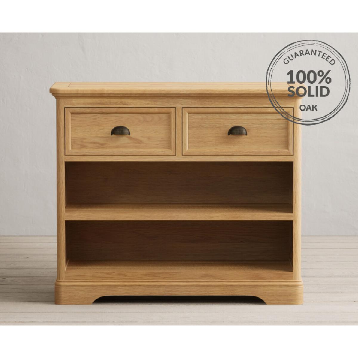 The Bridstow Natural Oak Storage Console Table has been crafted from solid oak and features shelves and Dovetail drawers.