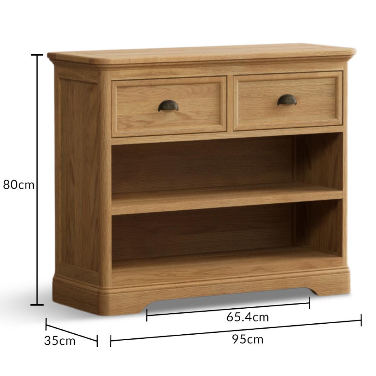 The Bridstow Natural Oak Storage Console Table has been crafted from solid oak and features shelves and Dovetail drawers.
