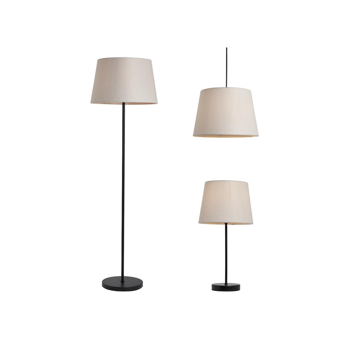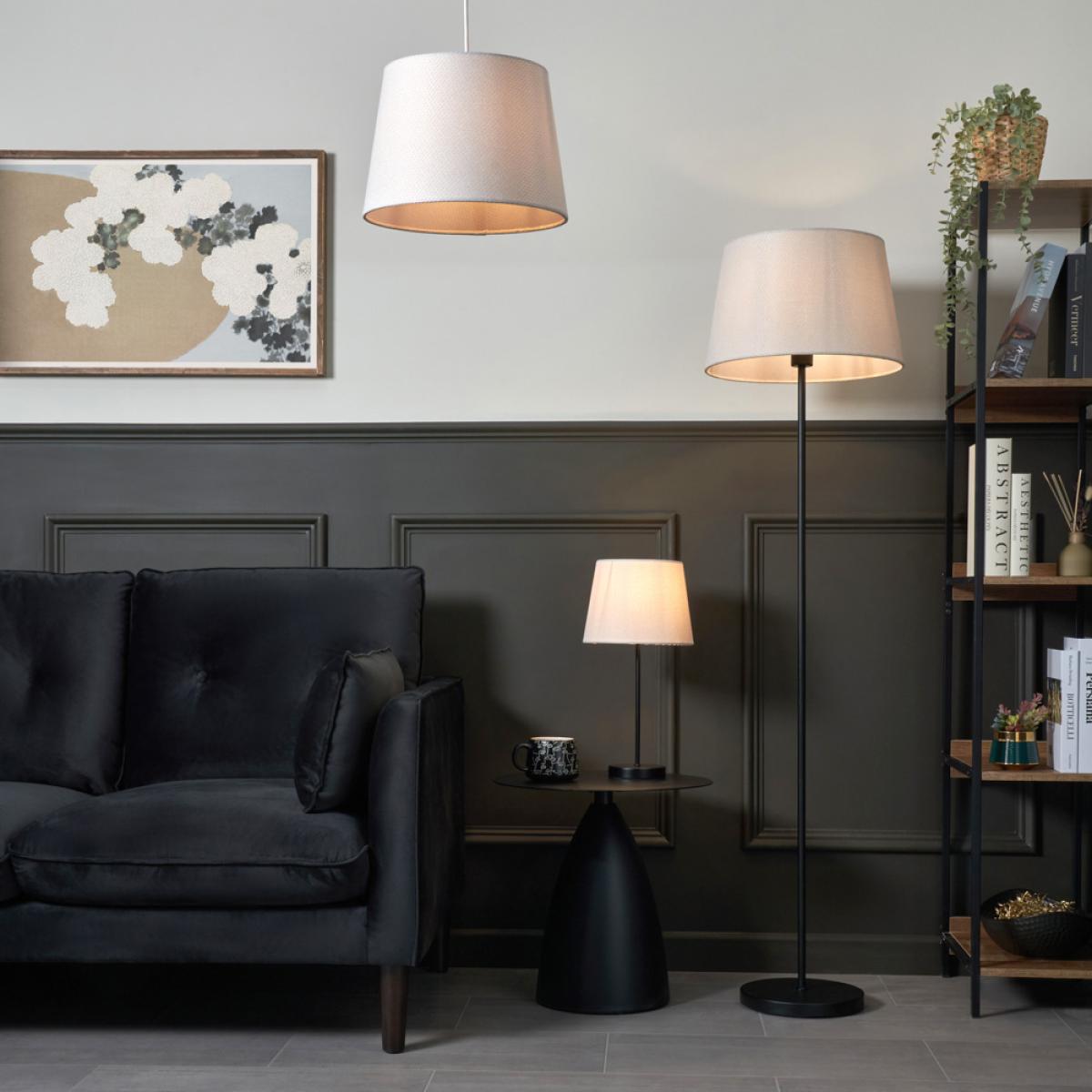 Transform your space with the Brie Floor and Table Lamp Set with Easyfit Shade in black. This set includes matching lamps and an easy-fit shade, creating a cohesive look for any room. The modern black finish and versatile grey tones suit a range of decor styles, making it perfect for bedrooms or living areas. Complete room set for a coordinated, stylish look; Black finish with grey tones for a modern aesthetic; Easy-fit shade for quick and hassle-free installation.