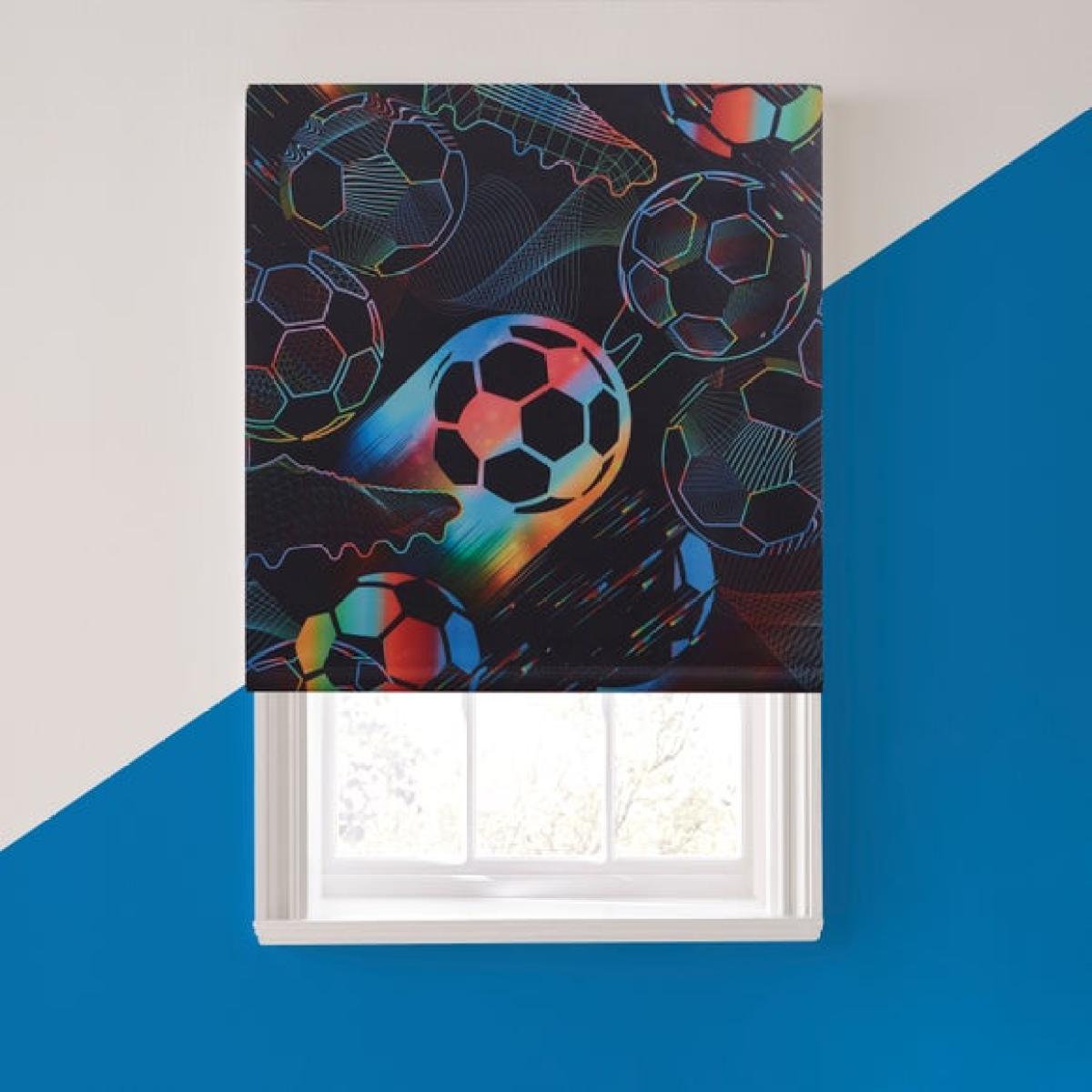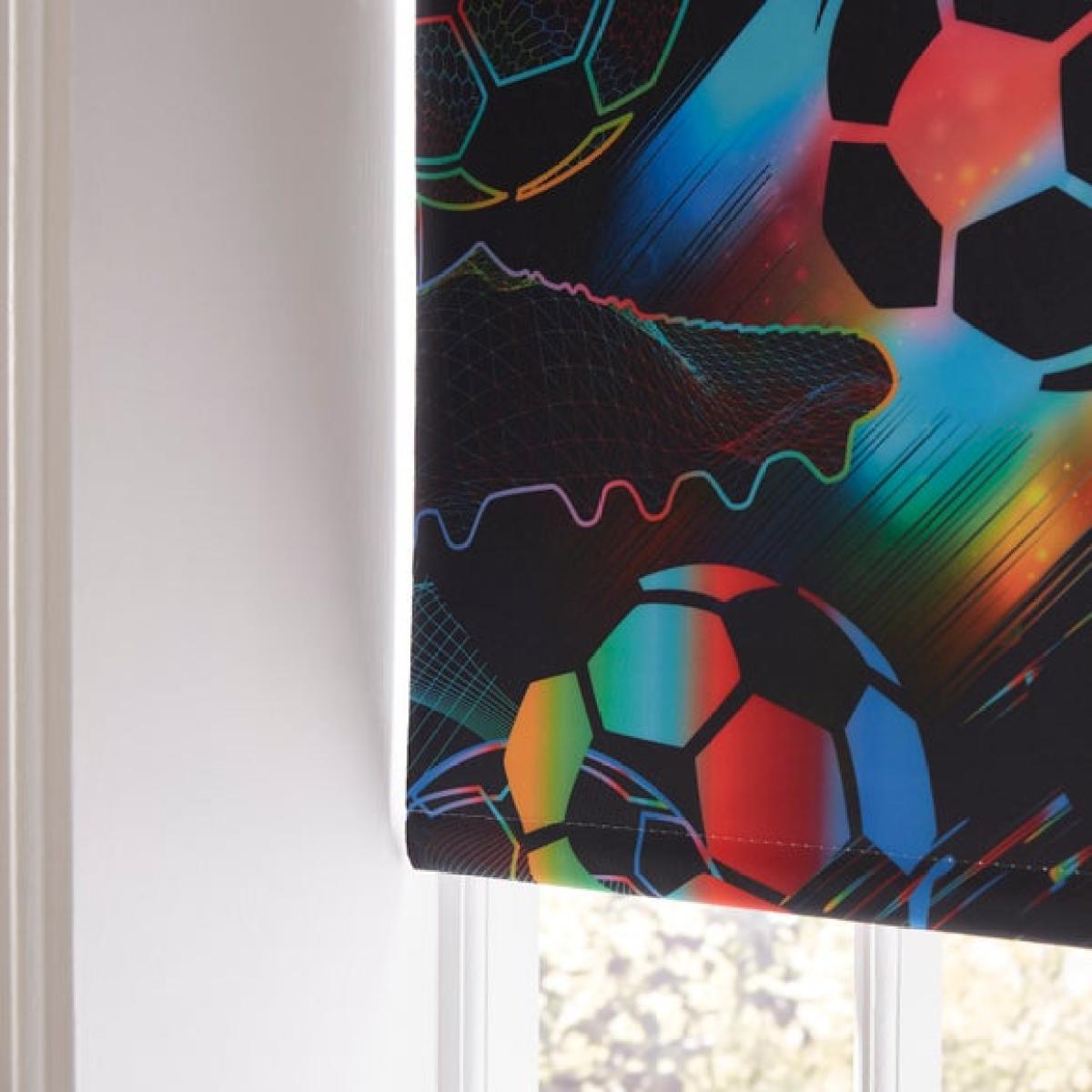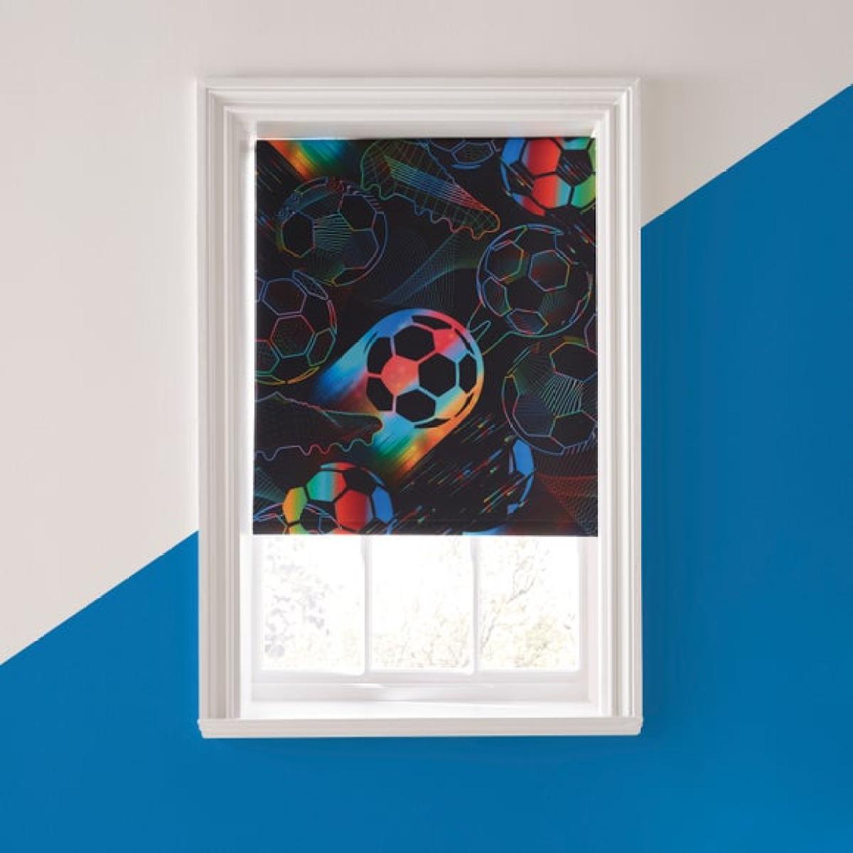 * Blackout blind * Multicoloured football print * Easy to fit and cut to size * Reduces unwanted noise * Temperature smart Score a winning look for your room with the Bright Football Blackout Roller Blind. Featuring a bold multicoloured football print on a black background, it’s perfect for sports fans. Available in multiple sizes and easy to fit, it can be trimmed to suit your window. Designed to block out light, reduce noise, and keep rooms cooler in summer and warmer in winter. Ideal for bedrooms, playrooms, or any space that needs a sporty touch.