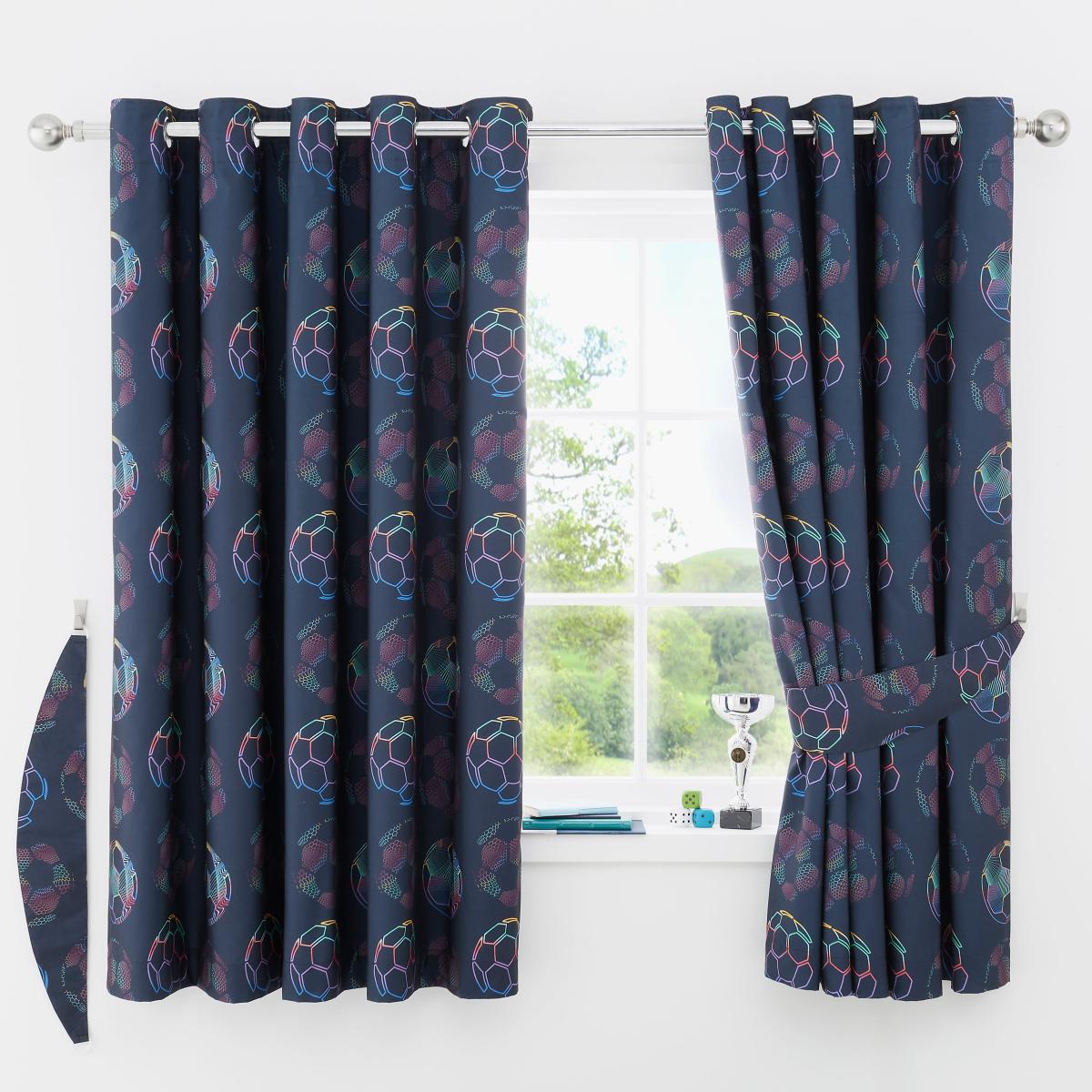 * Eyelet header* Blackout lining* Football design* Coordinating bedding available to purchase separately Enhance your bedroom decor with our eyelet header Bright Football themed curtains featuring a sleek and modern blackout lining to minimise unwanted light when sleeping. Perfect for young football enthusiasts, these curtains not only add a sporty touch to the room but also provide optimal light control and privacy. The eyelet header ensures easy installation, while the blackout lining enhances the quality of your sleep by blocking out unwanted light. Complete the look with our coordinating Bright Football bedding, available to purchase separately. This collection is verified by OEKO-TEX and independently tested for harmful substances as well as manufactured using sustainable processes under socially responsible working conditions.