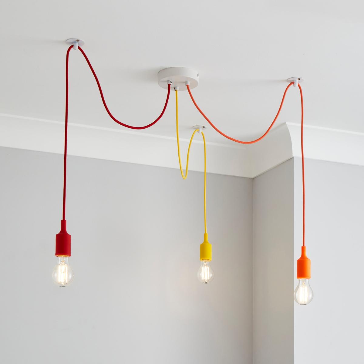 This fun multicolour Flex 3 Light Spider Cluster Ceiling Fitting has a simple yet contemporary design that will complement an array of home decors beautifully. Featuring a white base with three height adjustable multicoloured silicone rubber flex, perfect for adding a unique touch to your kids room. This piece is dimmable compatible and matching family items are available, helping to coordinate your home to create your desired look.