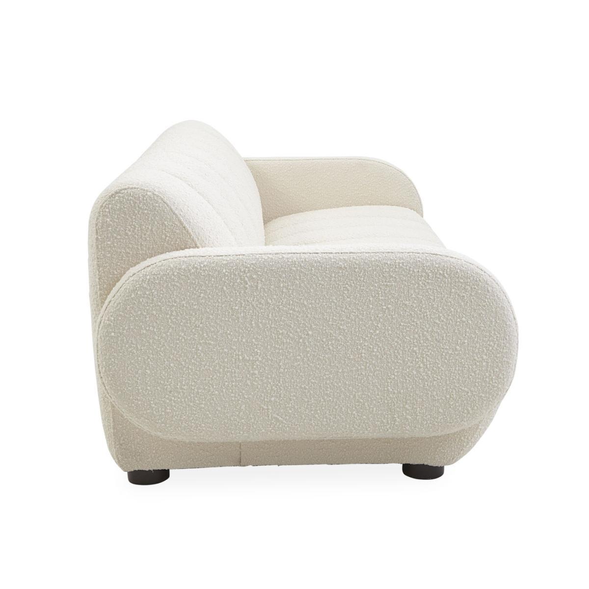 I love this sofa for its clean, streamlined look combined with a touch of retro charm thanks to its rounded arms and vertical stitching. The neutral beige and white palette makes it versatile, easily fitting into both modern and eclectic interiors. It works particularly well in light, airy living spaces or against bold, colourful walls for visual contrast. Practical styling tips include pairing it with textured cushions or throws in earthy or pastel tones to soften the look, or layering with a neutral or patterned rug underneath. Its size is ideal for medium to large living rooms, offering comfortable seating without overwhelming the space. Keep accessories minimal for a sleek, contemporary vibe, or add statement art and plants nearby to create a welcoming, styled corner.