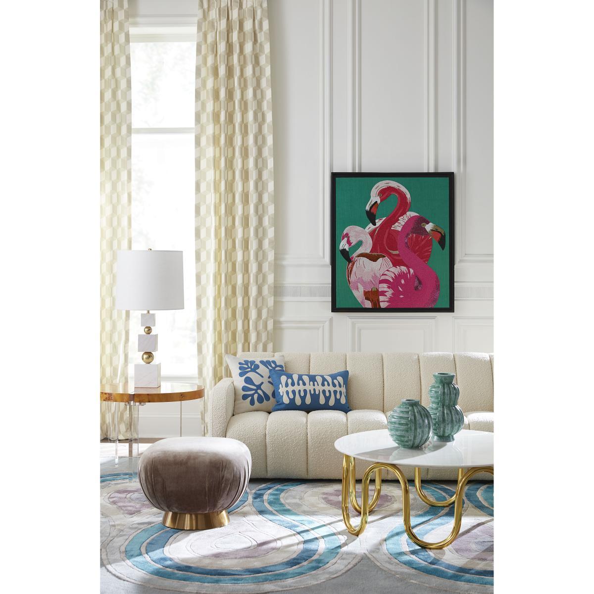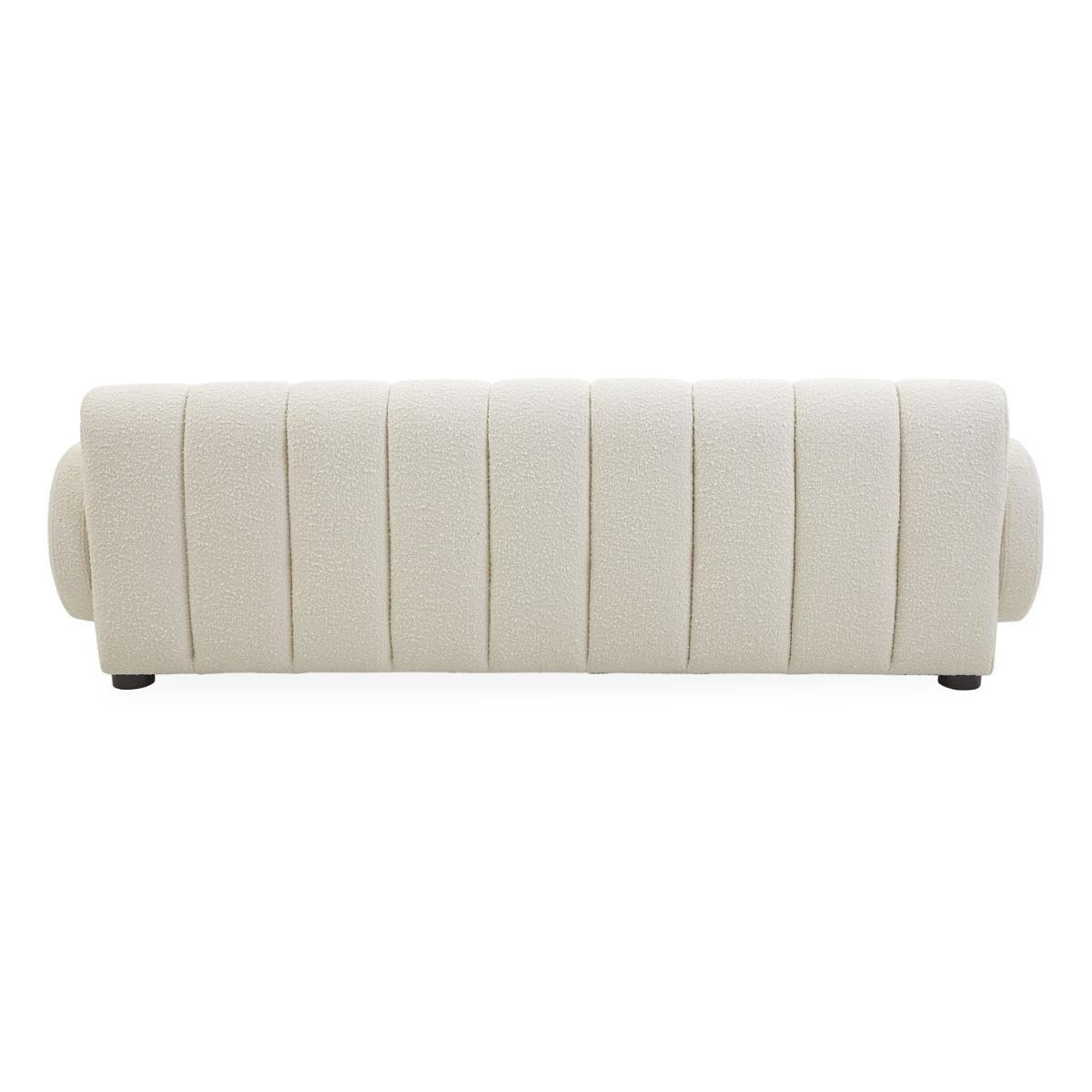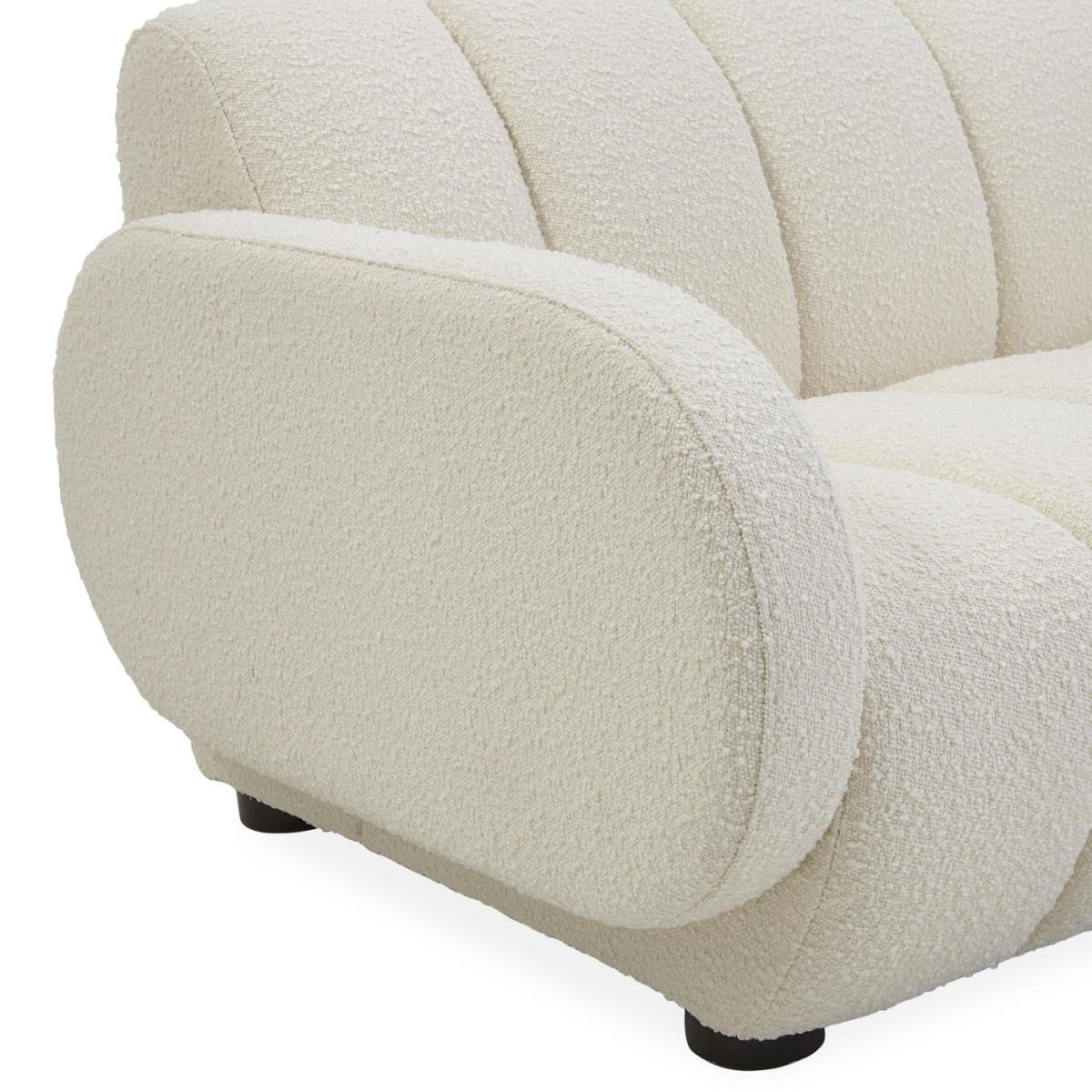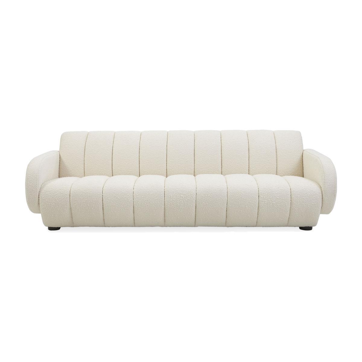 Contemporary upholstery. Glamorous and chic, the Brigitte sofa by Jonathan Adler is designed in a very couture spirit with superb work on the material and patterns. The padded seat and back are fully adorned with topstitching which draws a dynamic succession of vertical lines. The surface is sculpted by these seams which draw strong, rhythmic lines and form a light relief. This model is covered with looped wool, a tactile, voluptuous, comforting material.