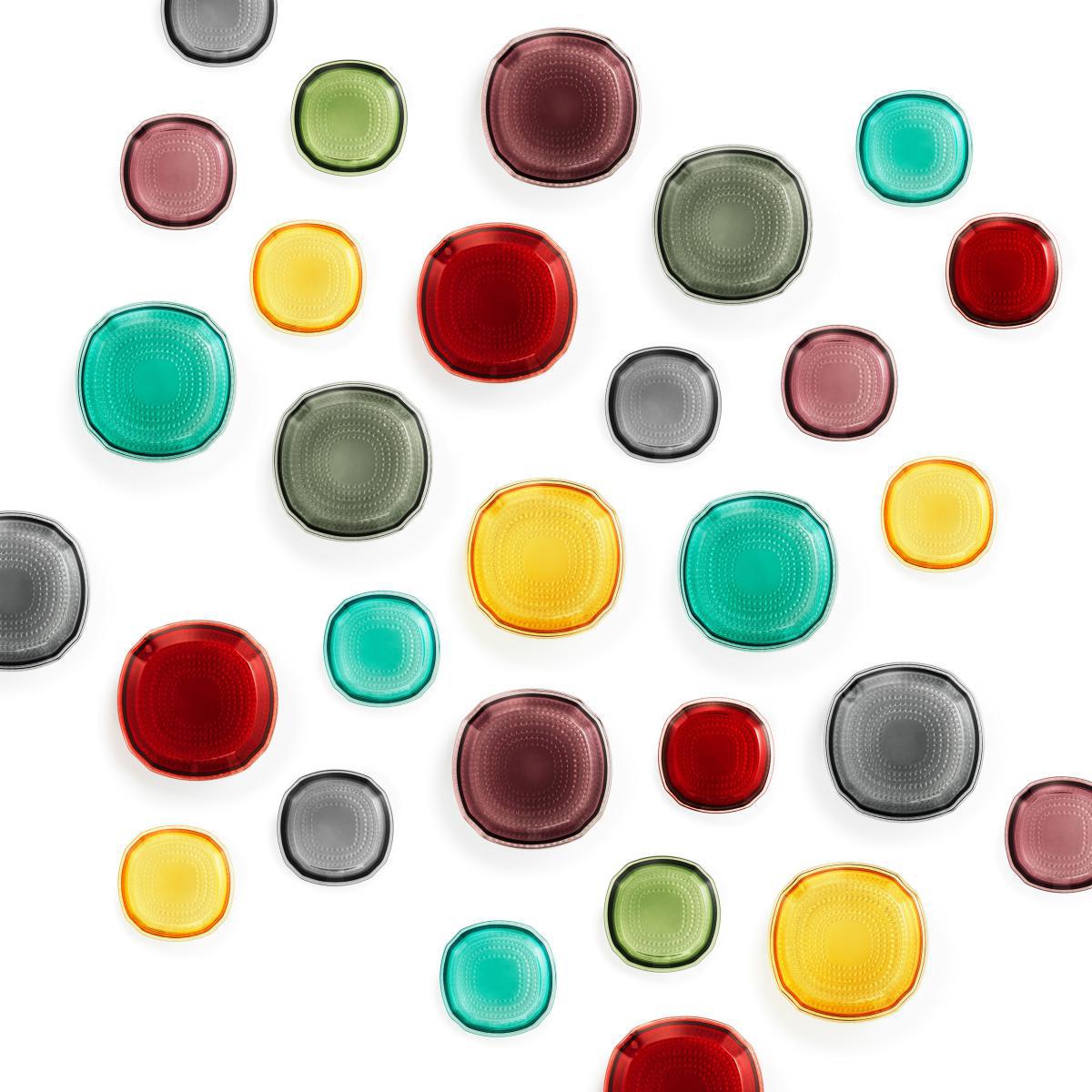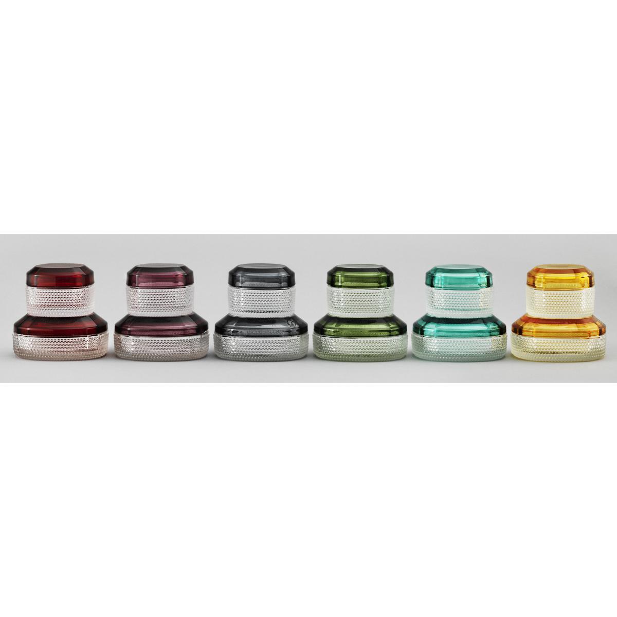 Brilliant is a range of small glass boxes with lids in colors inspired by gems and precious stones. A patterned bottom part creates a camouflage effect while the transparent lid lets you get a peek of what is inside.