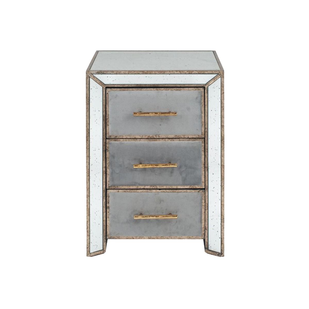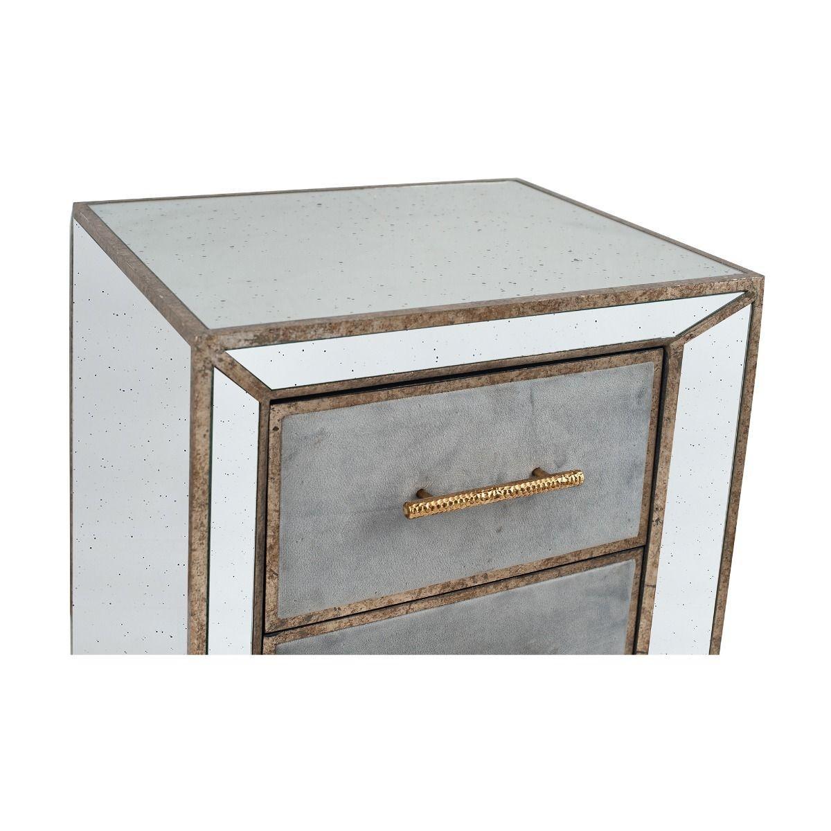 Antique Metal and velvet Bedside Unit. Update your bedroom with this stunning bedside drawer set. Finished with antique metal and mirror surrounding velvet drawers, this beautiful design is ideal for bedroom storage. Pair it with the rest of the Brindisi range for a unique and interesting theme throughout the room.