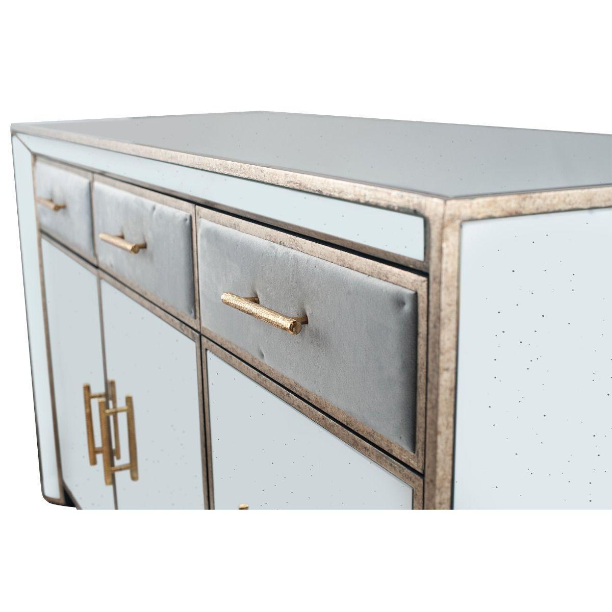 Antique Metal and velvet Sideboard. Update your home with this stunning sideboard unit. Finished with antique metal and mirror surrounding velvet drawers, this beautiful design is ideal for bedroom storage. Pair it with the rest of the Brindisi range for a unique and interesting theme throughout the room.