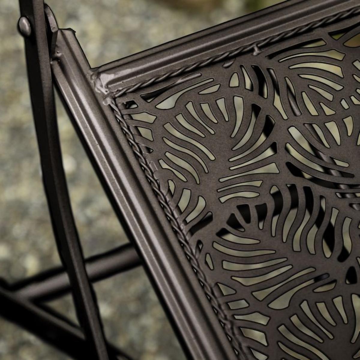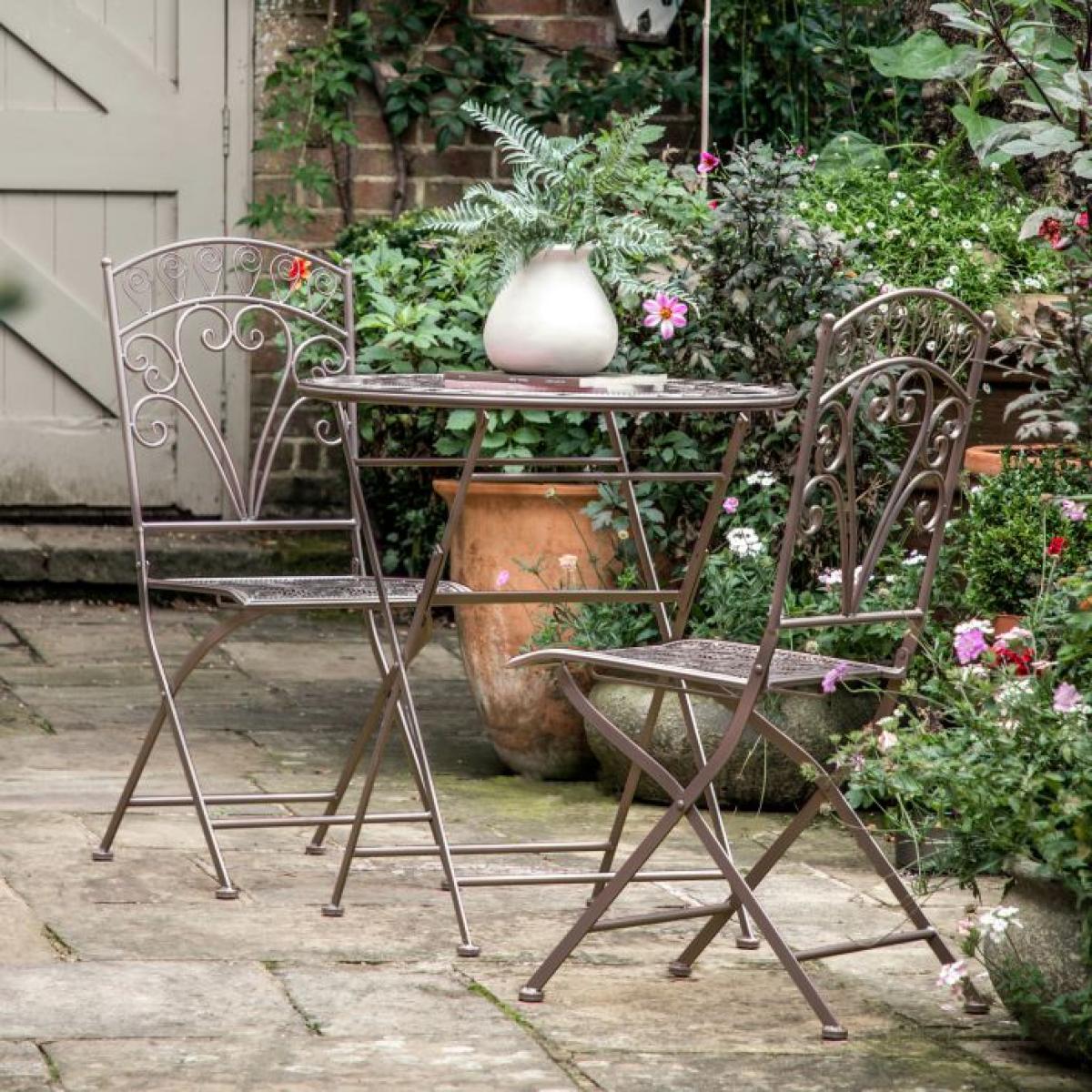Ideal for balconies, smaller outdoor spaces and cosy garden corners, this lovely set offers a bistro café style. Crafted from metal in a lovely deep metal patina finish, the design is inspired by nature, with the pattern on the table top and chair seats evocative of leaves and trees. The table and chairs fold for easy storage when not in use. It is also available in an unusual pink finish.
