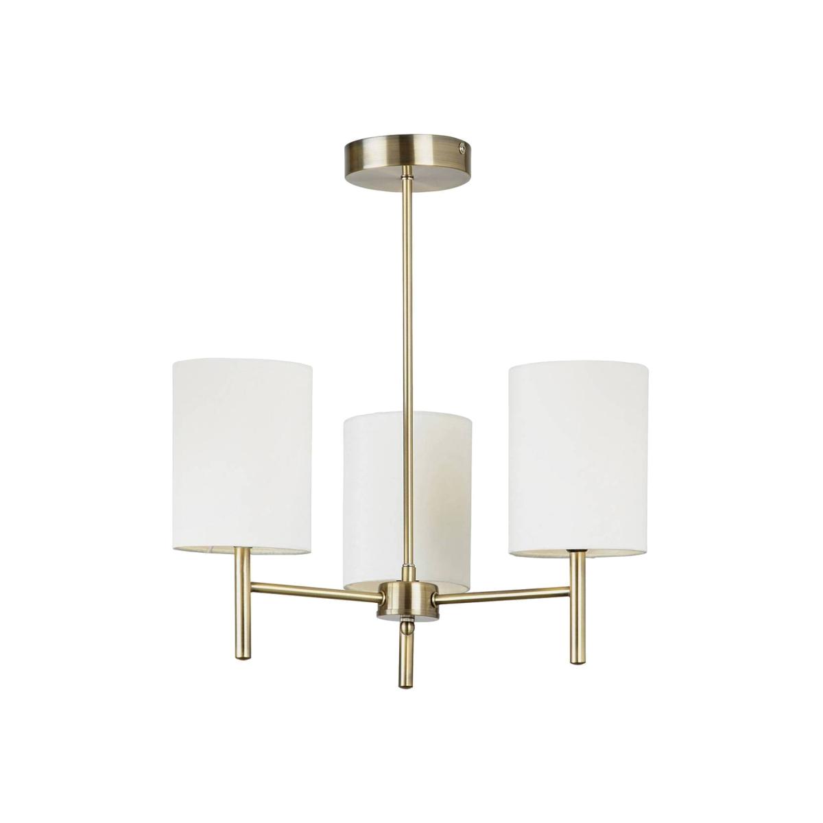 This 3 light ceiling fitting has an antique brass finish and is complemented with 3 cream faux silk shades. suitable for use with LED lamps and dimmable. Matching items and other colour options available.