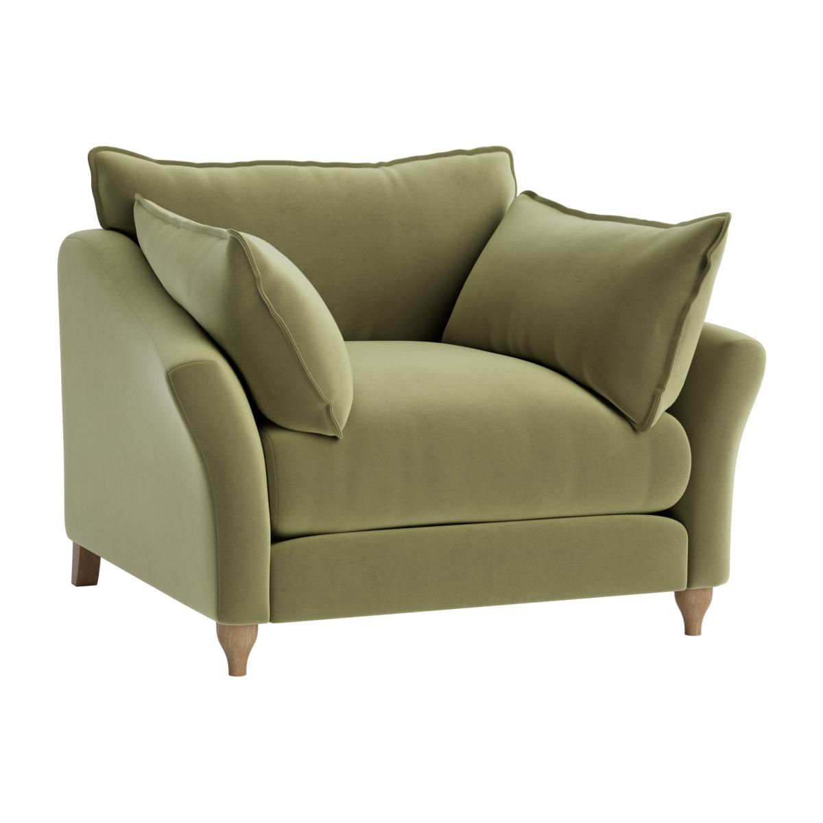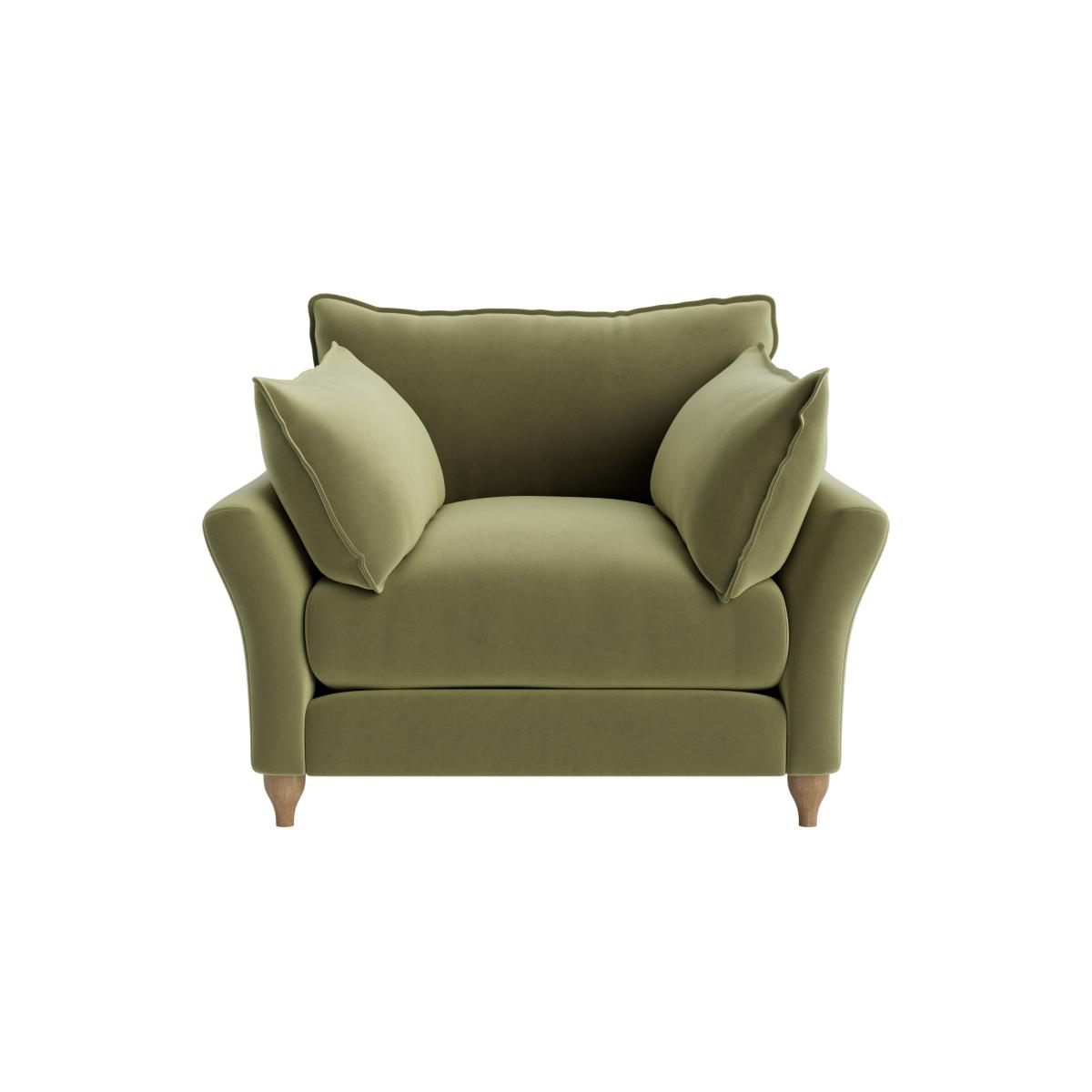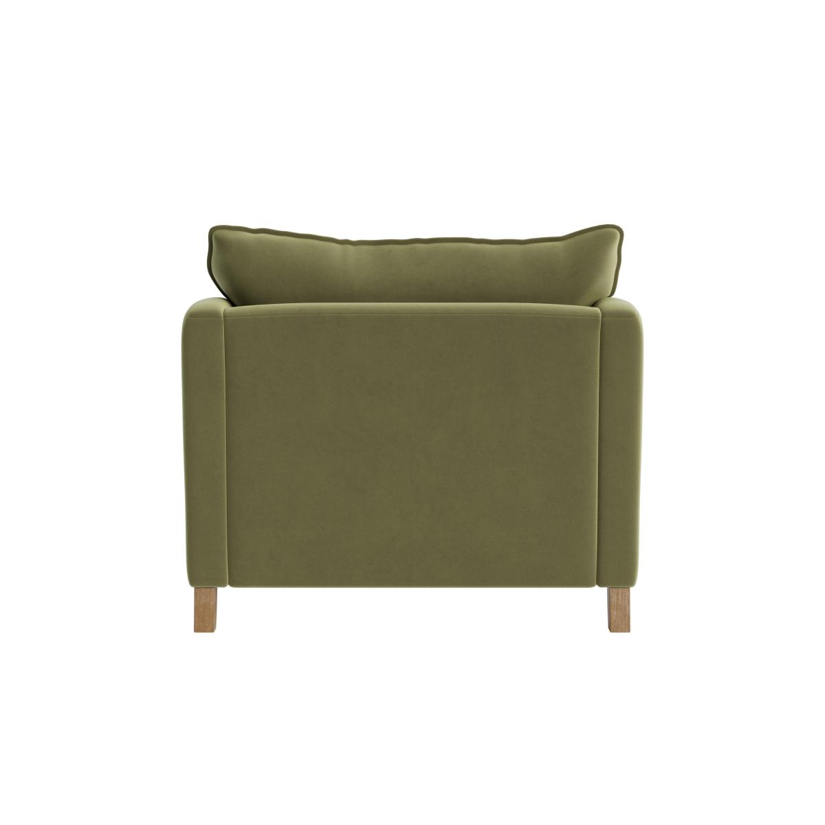 I love this armchair for its inviting, rounded shape and chic olive hue, which brings both softness and a subtle pop of colour to a space. It works especially well in cosy living rooms or as a statement piece in a neutral scheme. To style it effectively, consider pairing with a mixed palette of cushions-think textured fabrics or patterned prints to add visual interest. Practical tips include placing it near a side table with a reading lamp for a comfortable nook, and it pairs nicely with wooden or metallic accents to balance its plush, vintage-inspired look. Its versatile size makes it suitable for smaller spaces or as an accent chair in larger rooms, making it a stylish and functional addition to various interiors.