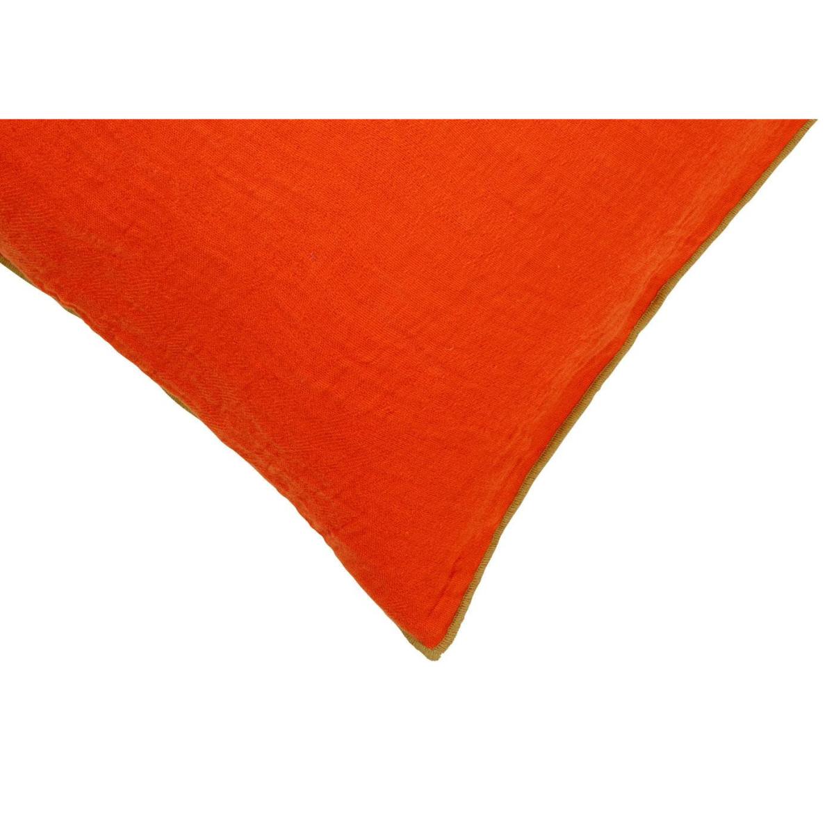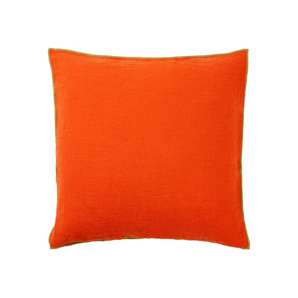 A vibrant red cushion made from 60% European linen and 40% recycled cotton. The cushion is woven with a lush texture and has a decorative stitched hem in a contrasting beige colour and closes with a zipper on the back.