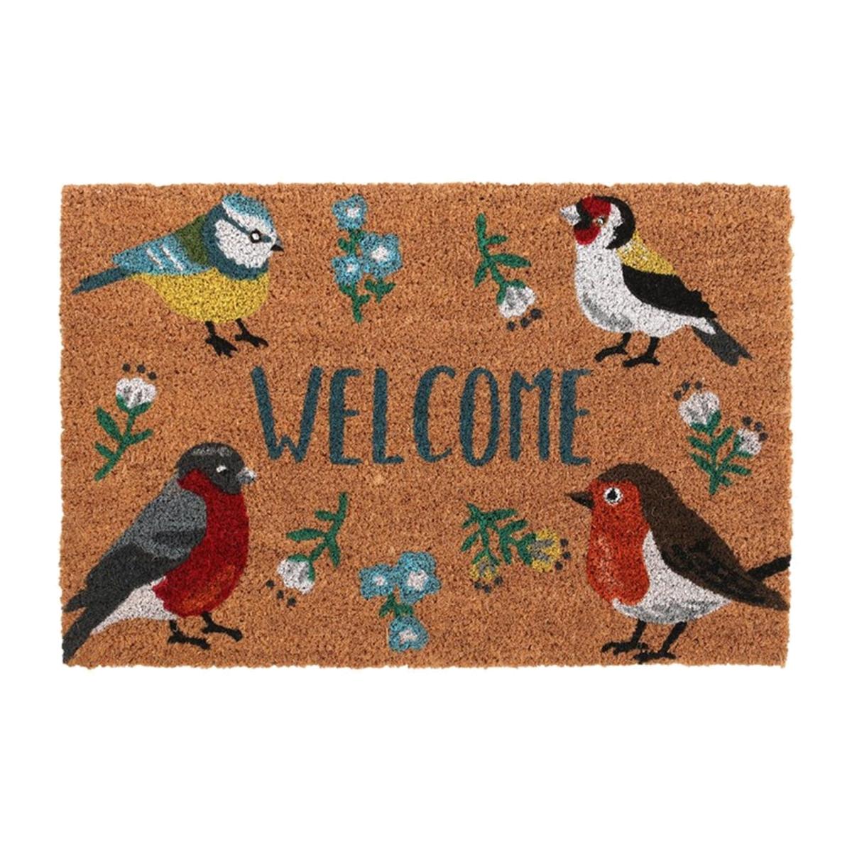Welcome guests of all varieties with this charming coir doormat. Features classic 'Welcome' text and adorable illustrations of common British garden birds a Blue Tit, Robin, Goldfinch and Bullfinch. Perfect for covered porches and back garden entrances. Please note that the printed design may fade when left outside in extreme weather.