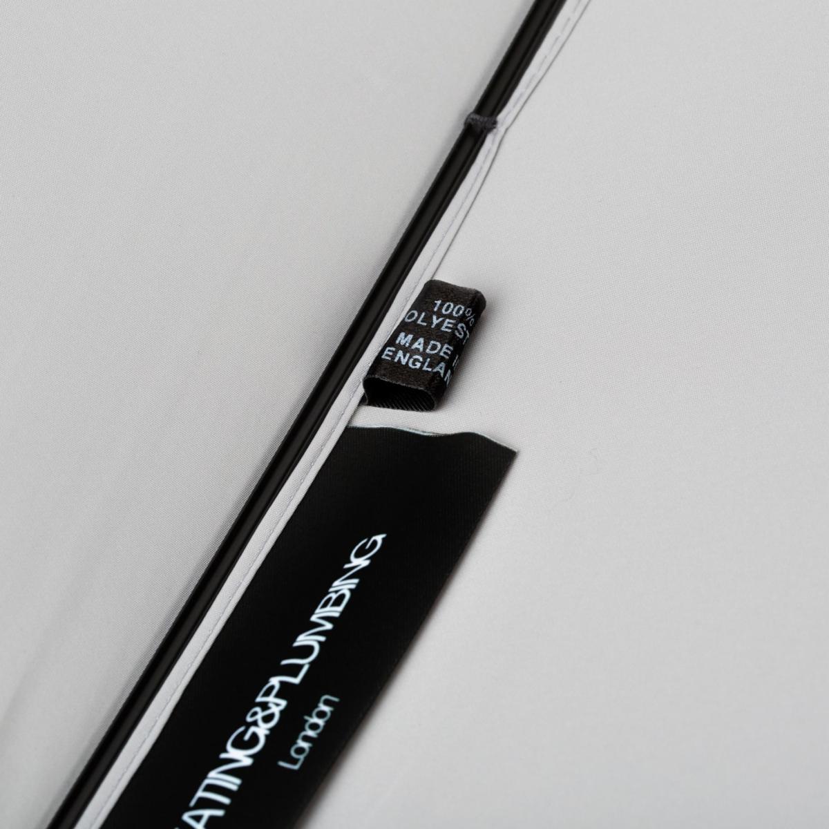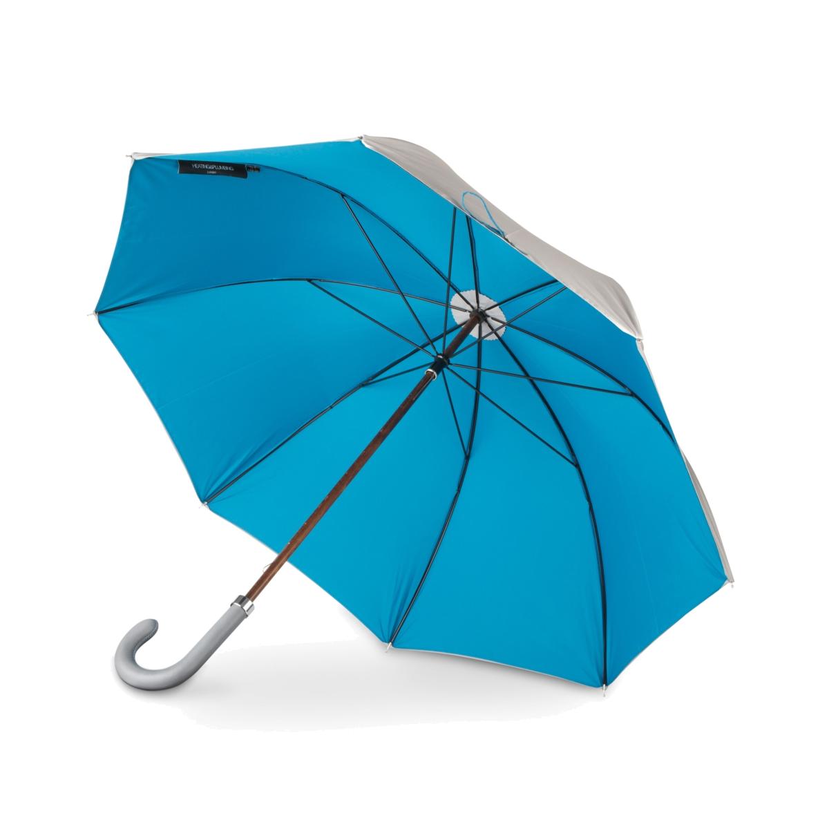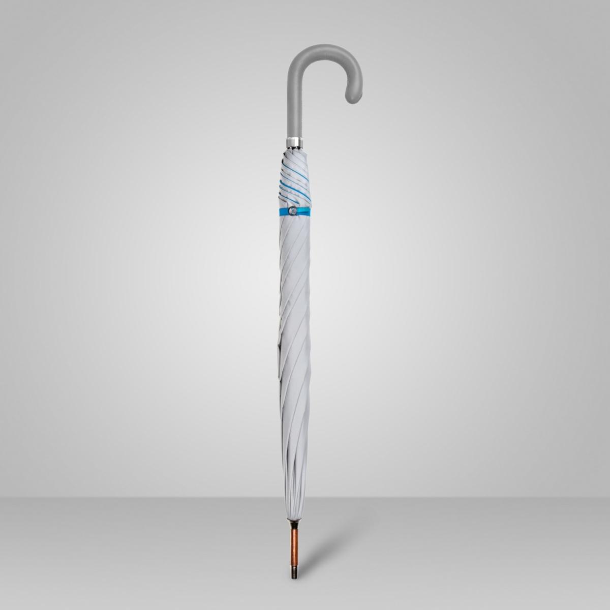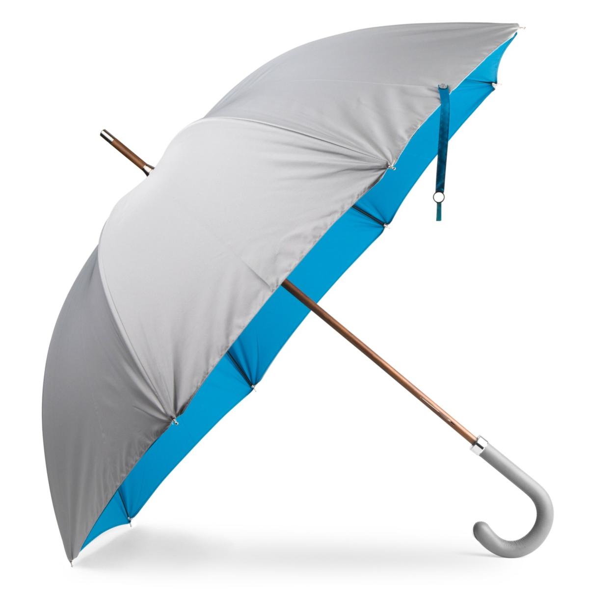 All our umbrellas are lovingly made and assembled in London, England. Our canopies are manually cut and each umbrella is hand finished. With its grey exterior canopy, its beech wood tip and shaft and its leather handle, this umbrella has an instant classic look with a feel of British luxury when it is closed. The blue tie brings a slight twist to the overall look, which takes its full swing once the umbrella is fully opened revealing a second blue canopy and bringing a stunning splash of colour on a rainy day.