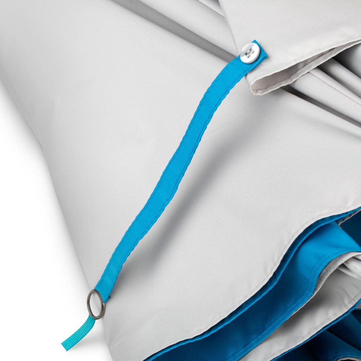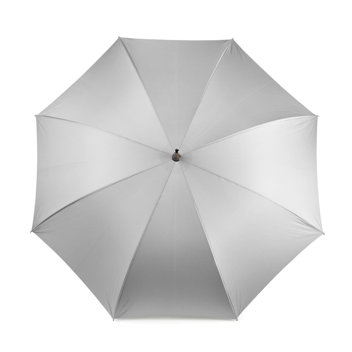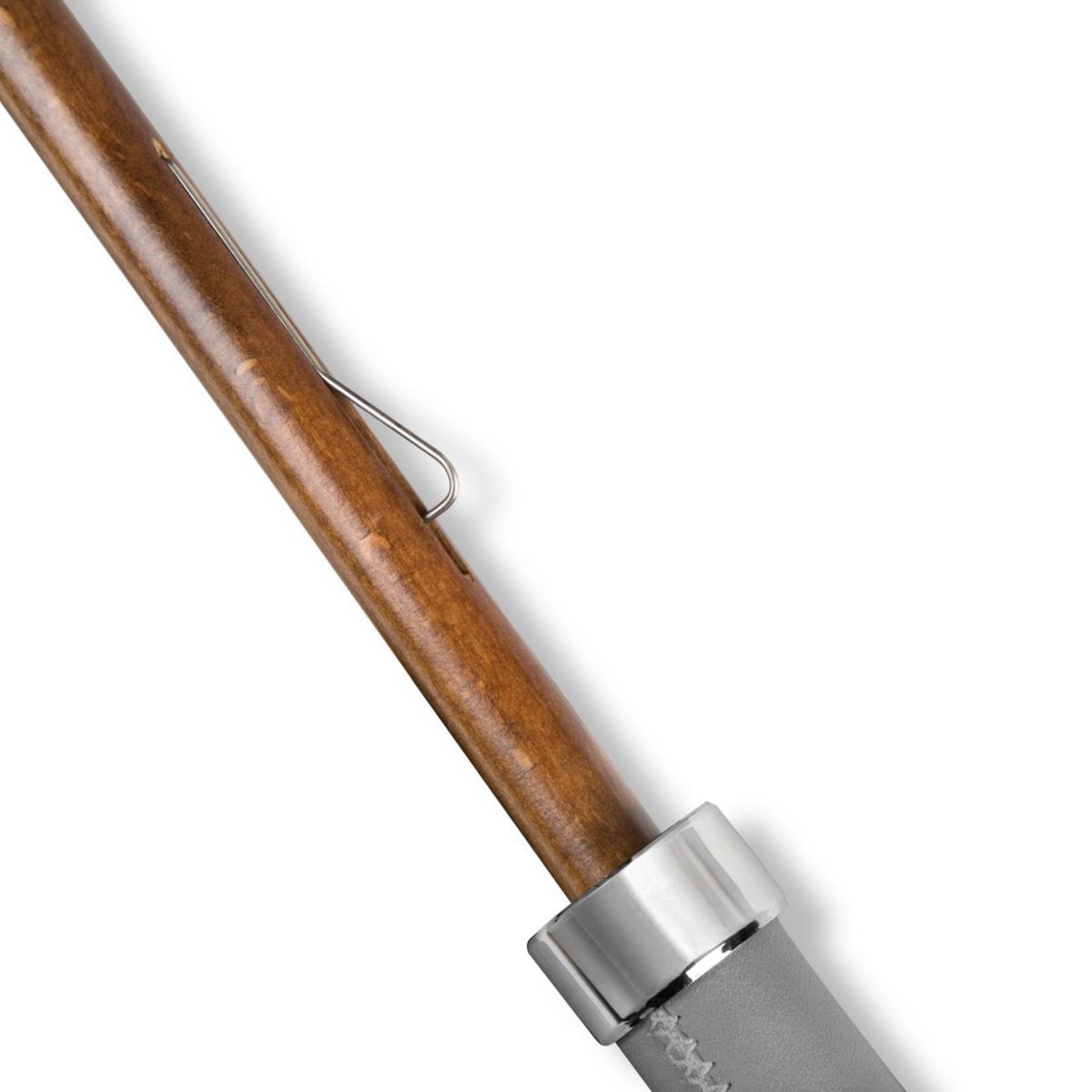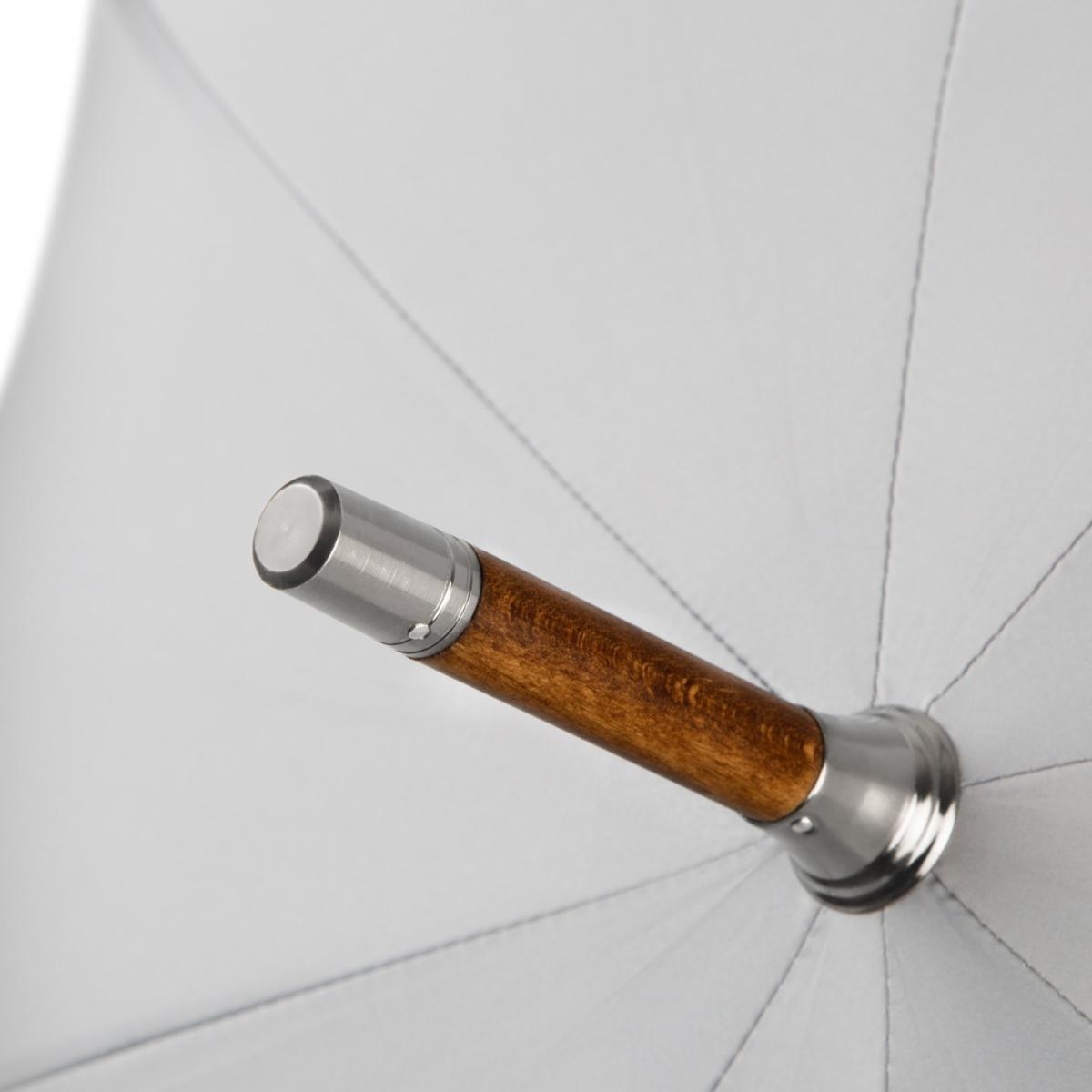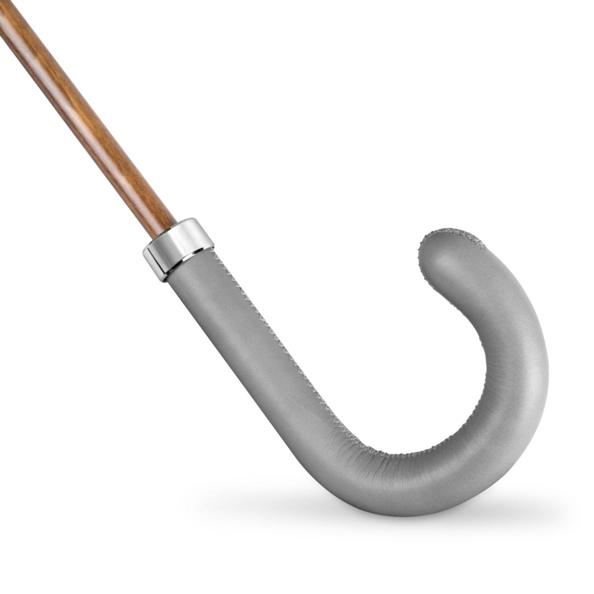 All our umbrellas are lovingly made and assembled in London, England. Our canopies are manually cut and each umbrella is hand finished. With its grey exterior canopy, its beech wood tip and shaft and its leather handle, this umbrella has an instant classic look with a feel of British luxury when it is closed. The blue tie brings a slight twist to the overall look, which takes its full swing once the umbrella is fully opened revealing a second blue canopy and bringing a stunning splash of colour on a rainy day.