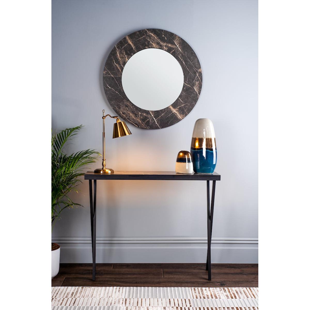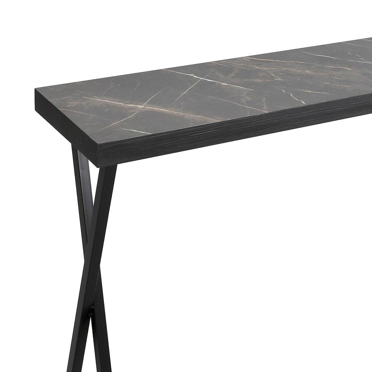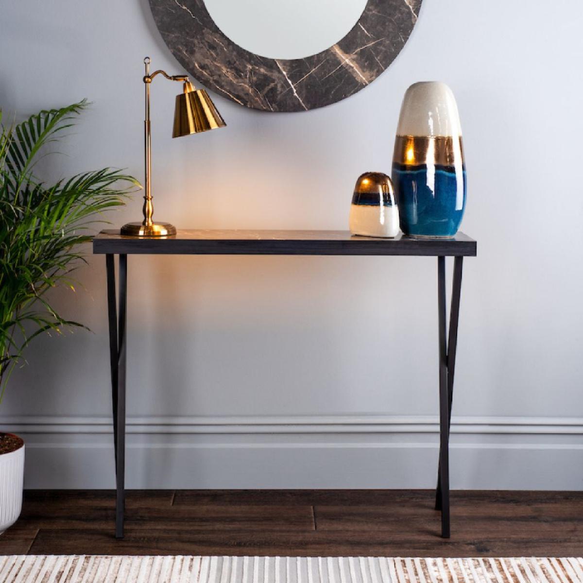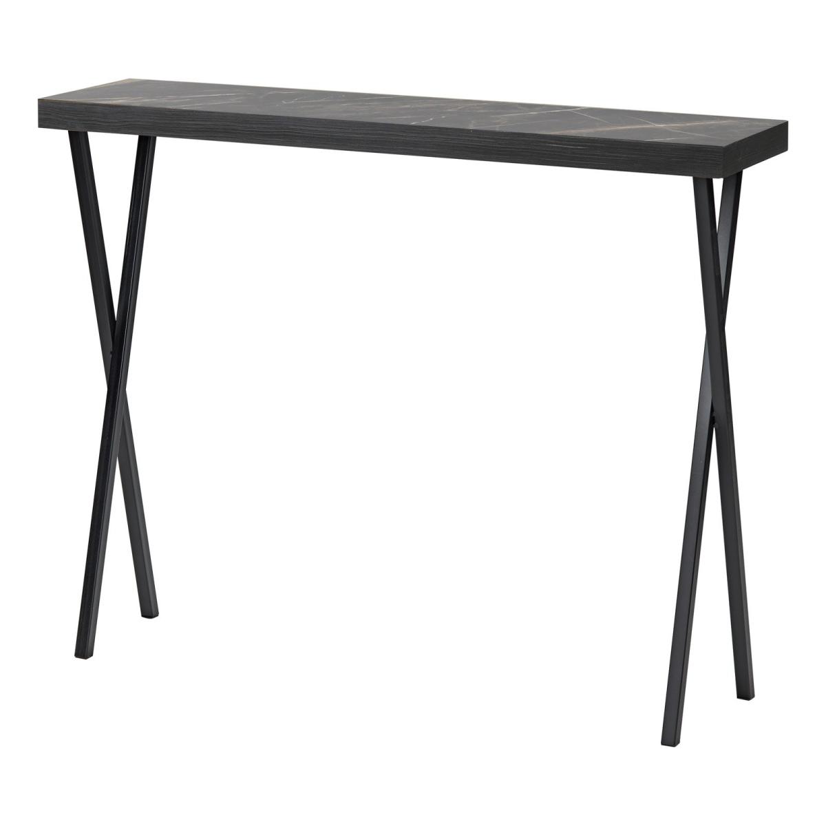 The versatile Brito console table is ideal for small rooms and hallways thanks to its narrow depth. Featuring a dark marble effect finish with black metal legs.. Please note that some light assembly is required.