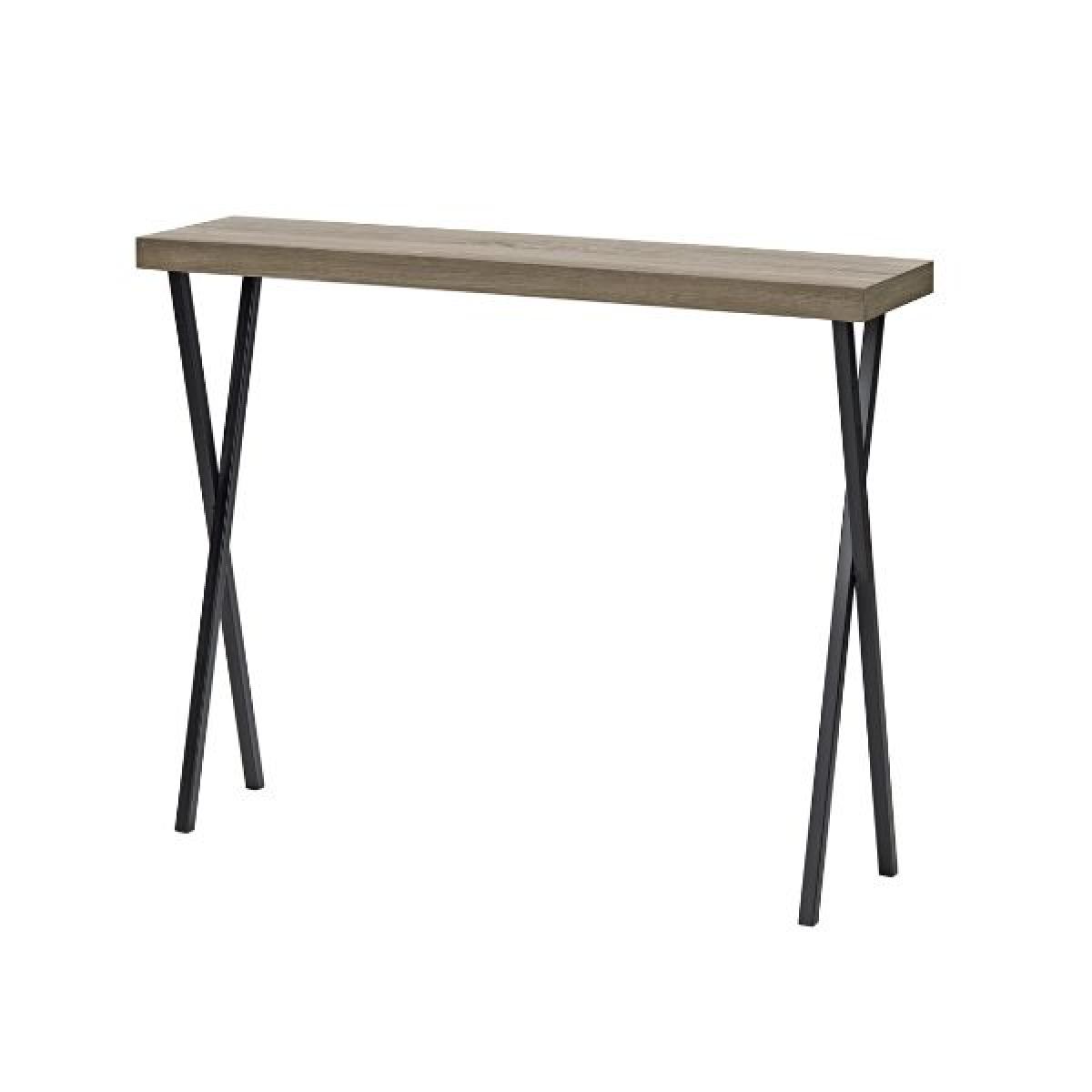 Oak effect console table featuring matt black legs The Brito console table features a modern oak effect design and matt black legs. The perfect piece to complement any hallway or lounge. Oak effect console table featuring matt black legs The Brito console table features a modern oak effect design and matt black legs. The perfect piece to complement any hallway or lounge.