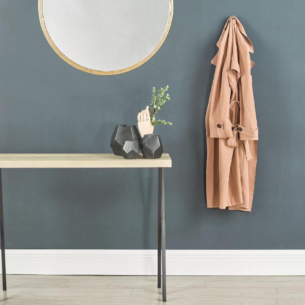 I really rate this oak console for its slim, pared-back silhouette and light oak top set against slim black metal legs - it feels right at home in both modern Scandi and industrial-leaning spaces. In a hallway it won’t dominate the room, yet it offers just enough surface area for a lamp, a decorative tray for keys or a small planter. For styling, balance its linear form with round or organic items: a circular mirror above, a woven basket tucked underneath for shoes or magazines, and perhaps a ceramic vase with fresh foliage. Keeping the colour palette muted - greys, soft greens or off-whites - will let the wood grain and metal frame really stand out.