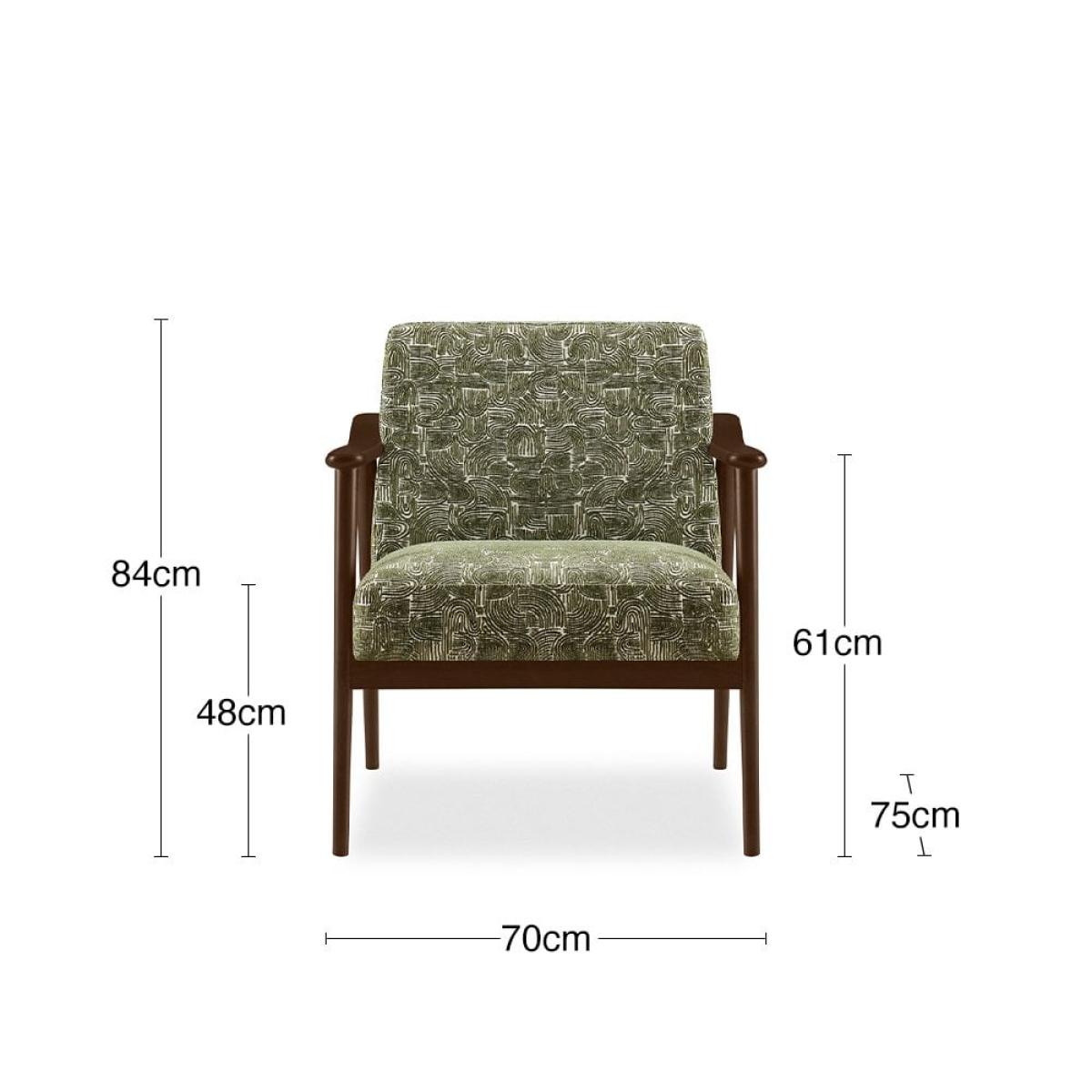 The Britta Armchair is full of mid century charm with a deep padded seat upholstered in our exclusive Bauhaus Wave soft fabric framed in a walnut-stained ash wood. We love the vintage feel of the soft waves in olive green on a cream background. Combined with the walnut-stained wood, this seat is to die for.
