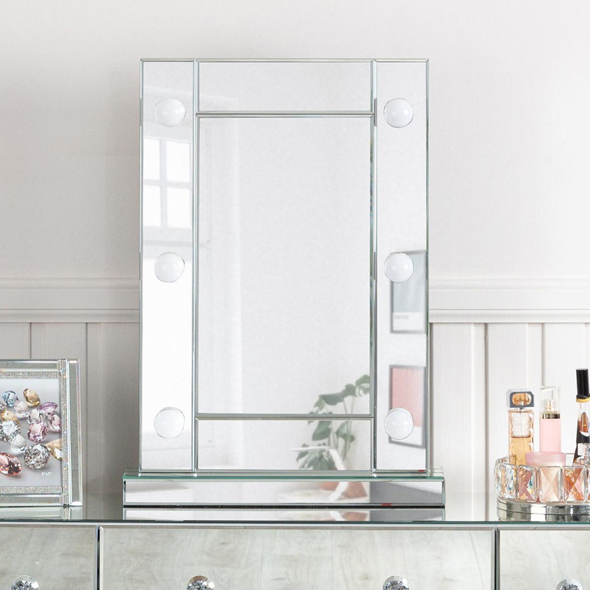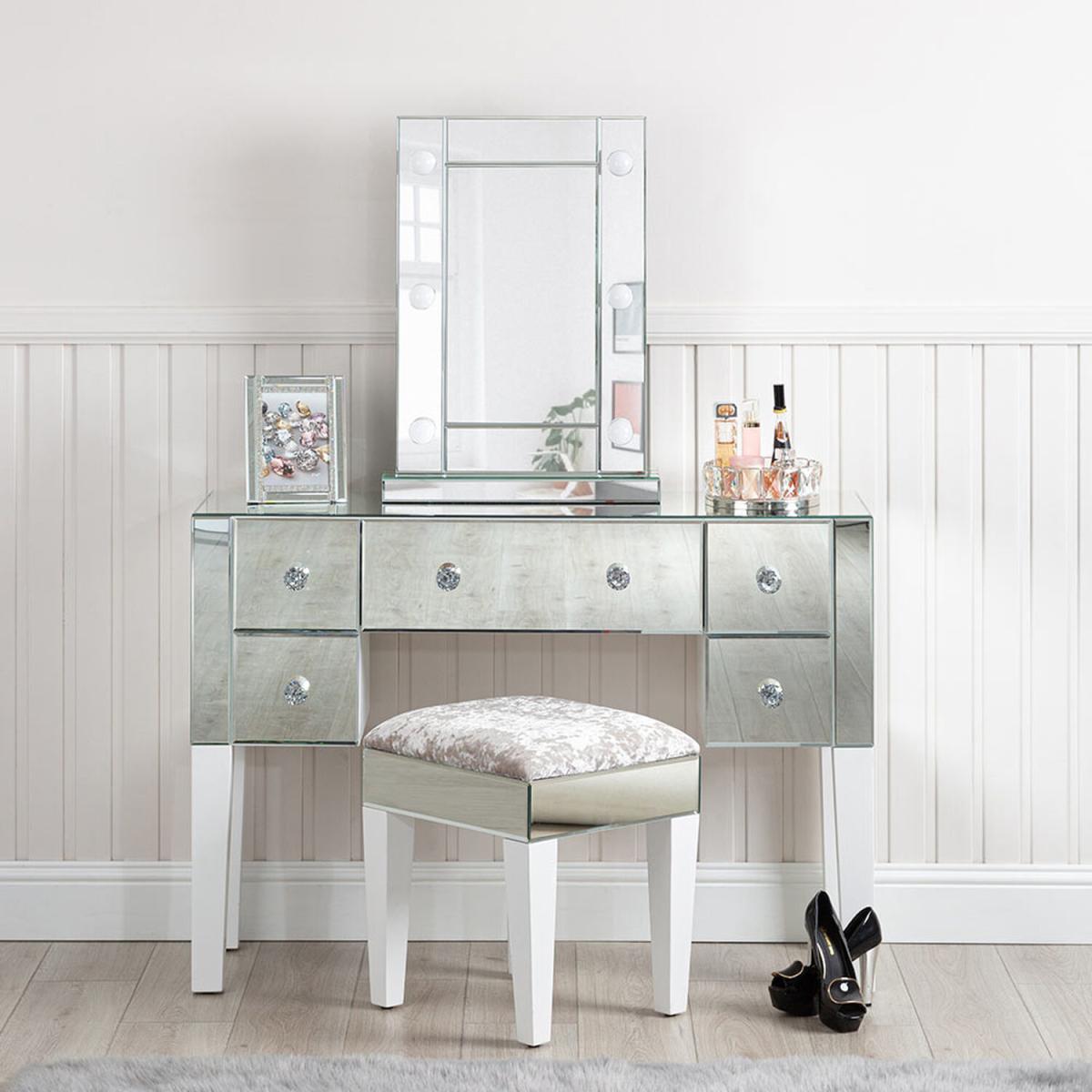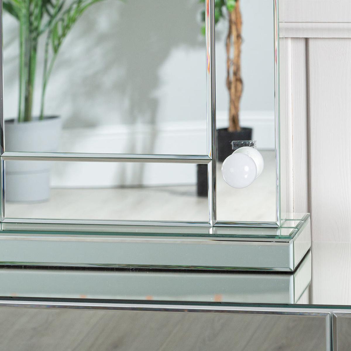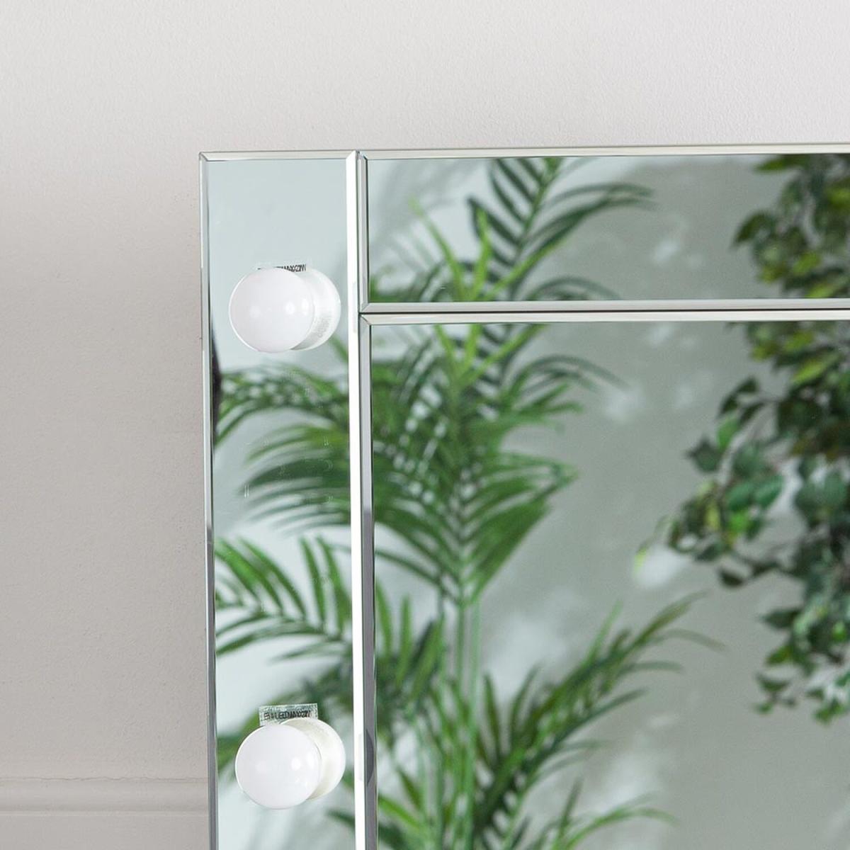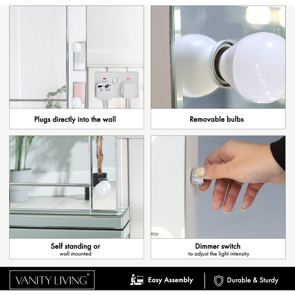 The Broadway 6 light vanity make-up mirror with clear mirror surround is the epitome of dressing room chic. Complete with energy-efficient LED bulbs (E14 screw fitting, 2W energy consumption) and a dimmer switch to adjust the light intensity. (not suitable for bathrooms)
