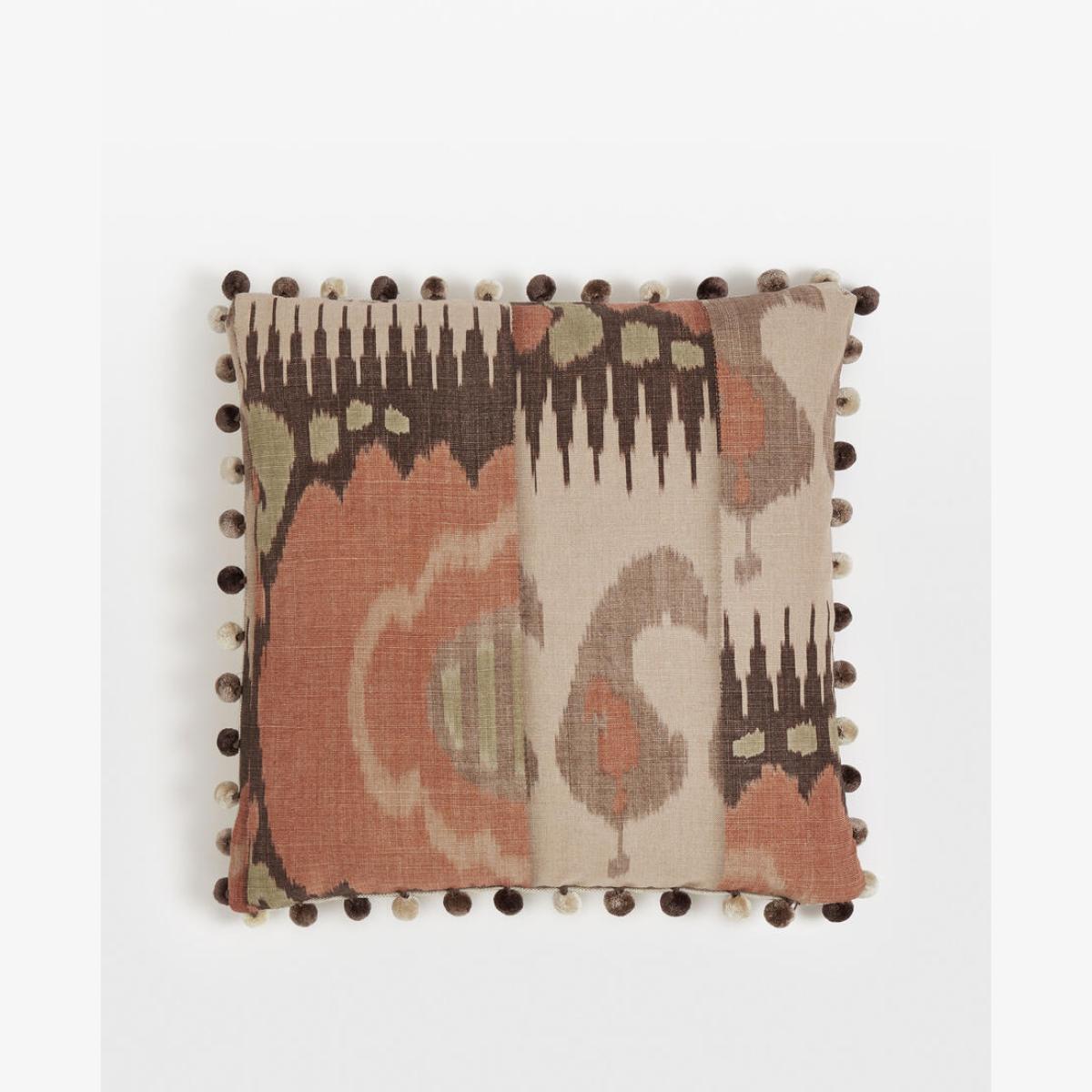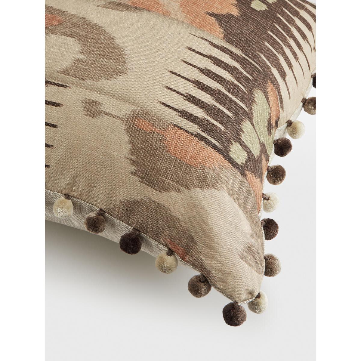 Inspired by the cushions found in our bar area at Soho House 76 Dean Street, the Broadwick cushion features a traditional ikat print in partnership with British family-run business, Lewis & Wood. Tonal pom-pom trim detail completes this style with a decorative touch to enliven any bed or sofa. Mix and match with other cushions from our collection. Digital-print ikat cushion Lewis & Wood fabric Pom-pom trim detail Finished in the UK Placement will vary due to the repeat nature of the design Inspired by cushions seen at Soho House 76 Dean Street