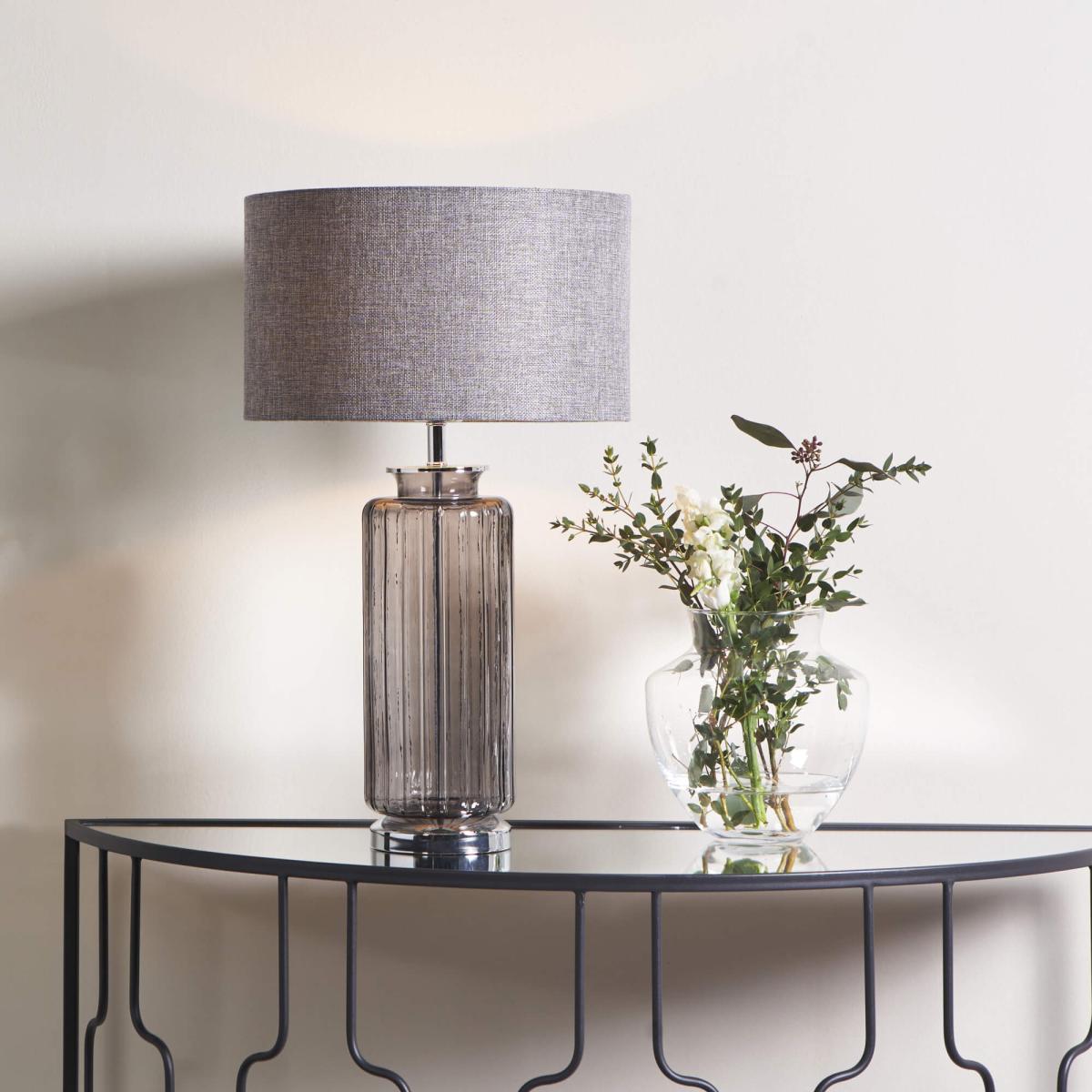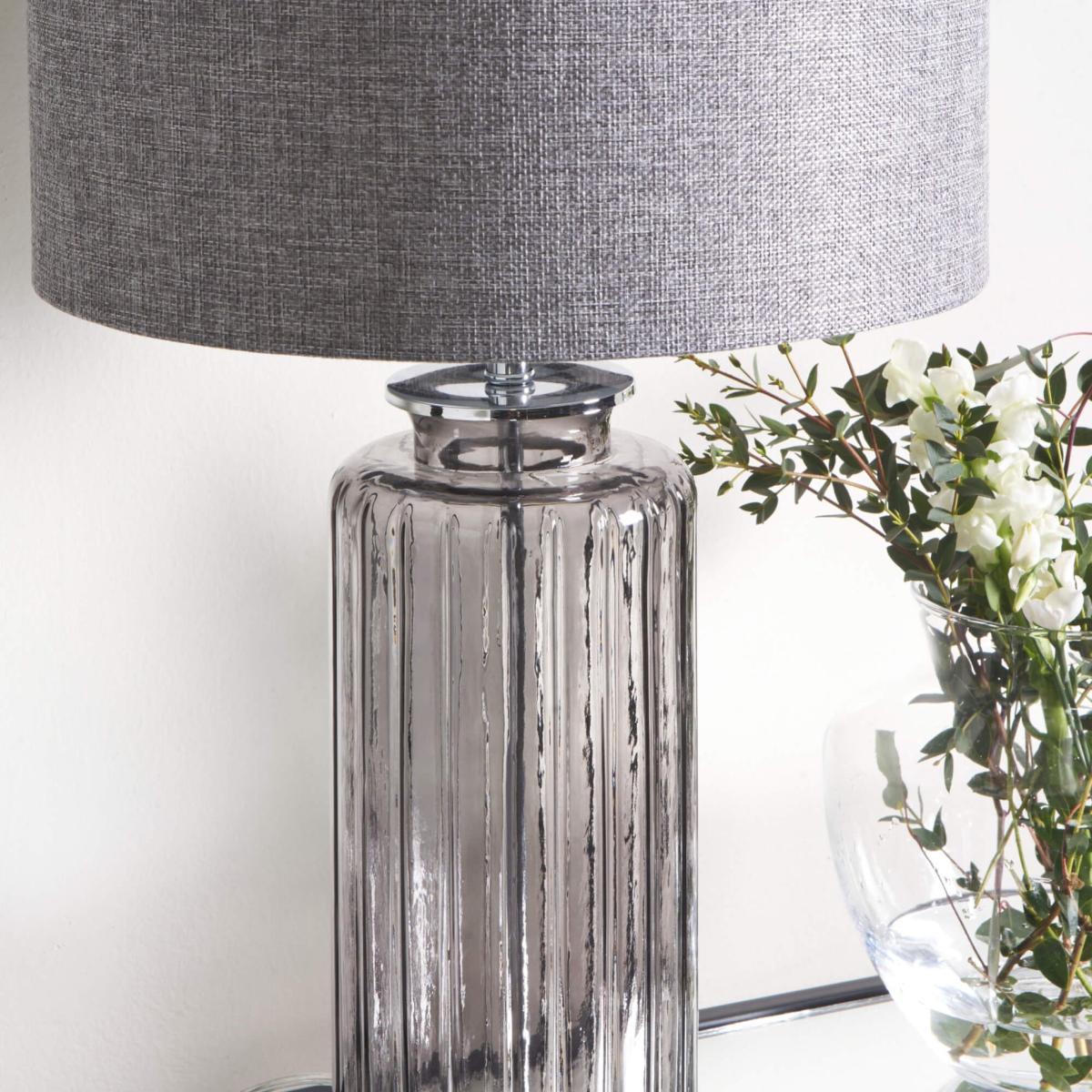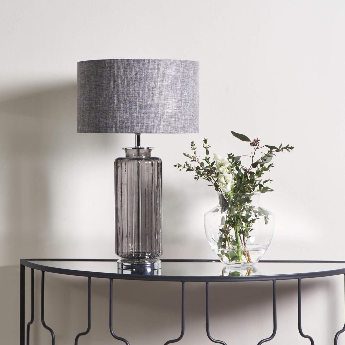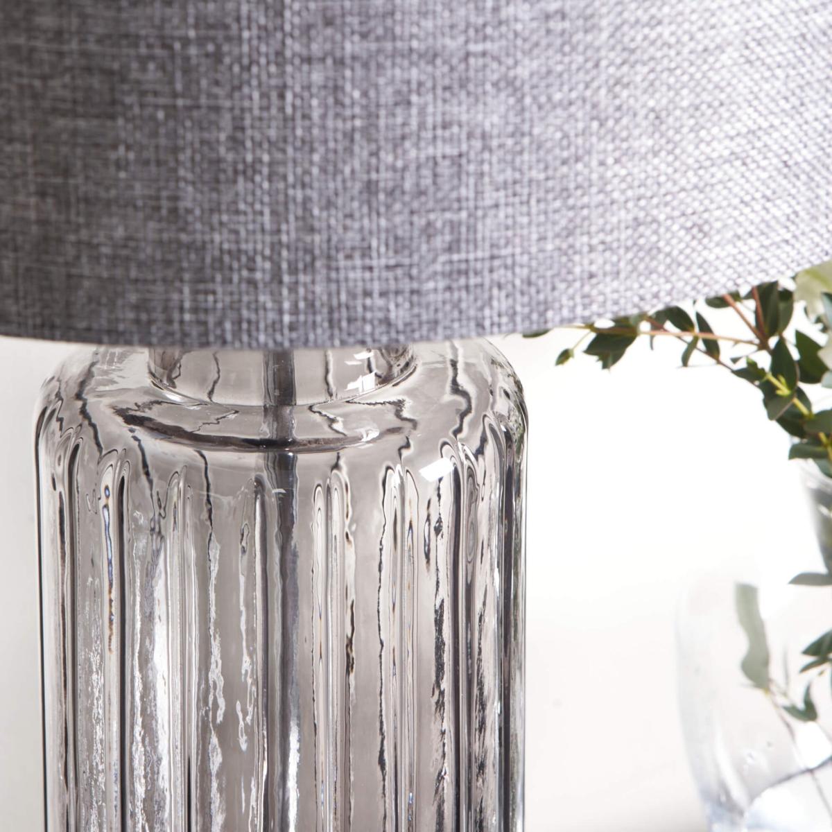 A traditional table lamp with classic modern edge. The Brock Glass Table Lamp features a stylish ribbed glass base, paired with a gorgeous grey shade. Perfect for a hall console or living room side table or as a beautiful bedside lamp too. - Requires 1x ES27 GLS bulb (Max 12 watts) - Shade Dimensions: H20xD34xL3. 4 cm. - Base Dimensions: H44xD13.5xL13.. 5 cm. A traditional table lamp with classic modern edge. The Brock Glass Table Lamp features a stylish ribbed glass base, paired with a gorgeous grey shade. Perfect for a hall console or living room side table or as a beautiful bedside lamp too. - Requires 1x ES27 GLS bulb (Max 12 watts) - Shade Dimensions: H20xD34xL3. 4 cm. - Base Dimensions: H44xD13.5xL13.. 5 cm.