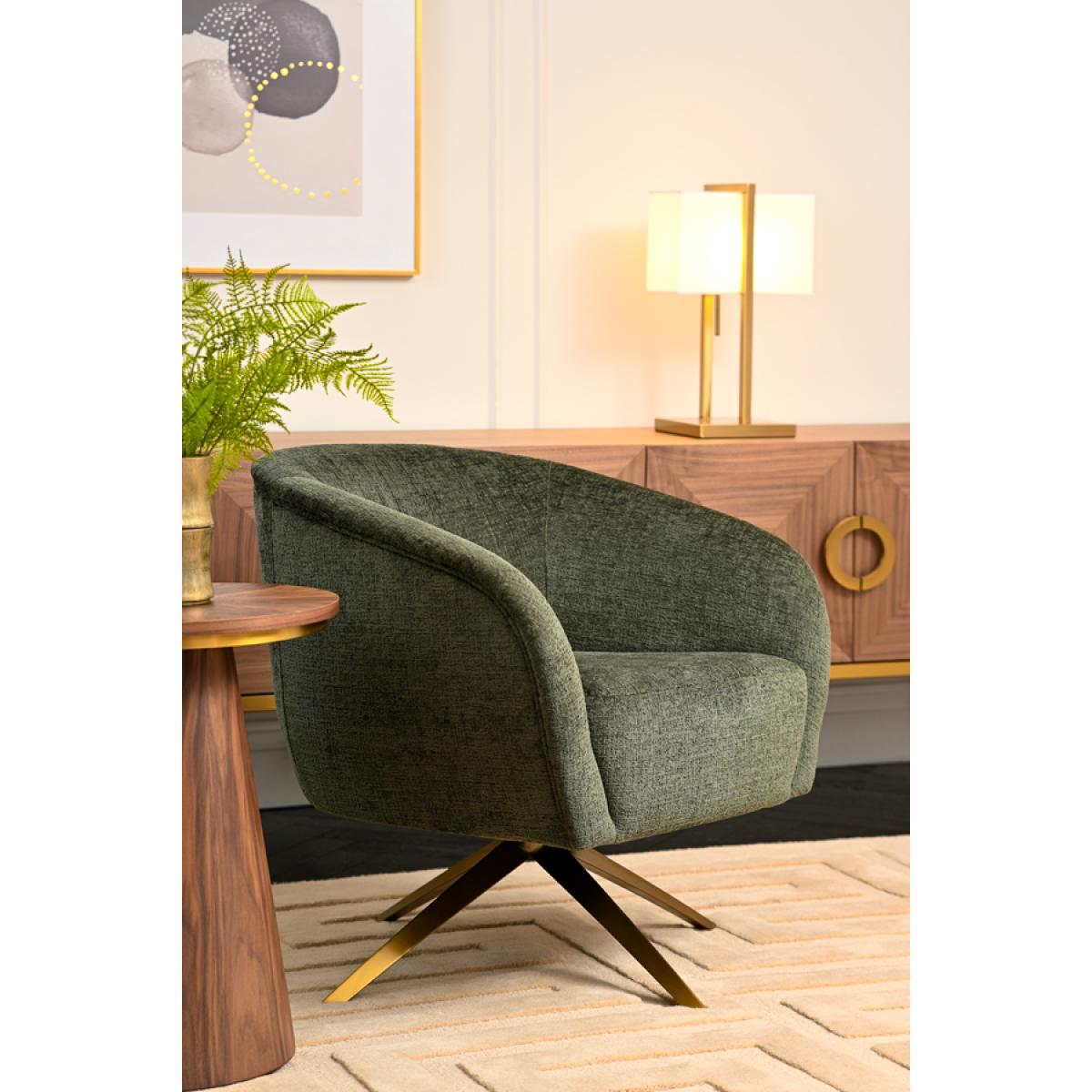 I’m a fan of this forest-green swivel chair for its smart blend of texture and sleek brass legs, which makes it an easy fit in mid-century, art-deco or contemporary schemes. The deep, curved seat invites you in, while the rich green hue adds depth without overpowering the room. For styling, pair it with warm timber accents or a marble-topped side table to echo the brass base. A soft wool throw or a simple patterned cushion will lift the look and introduce a cosy layer. Because it swivels, it works brilliantly in a study corner or alongside your sofa as a flexible extra seat.