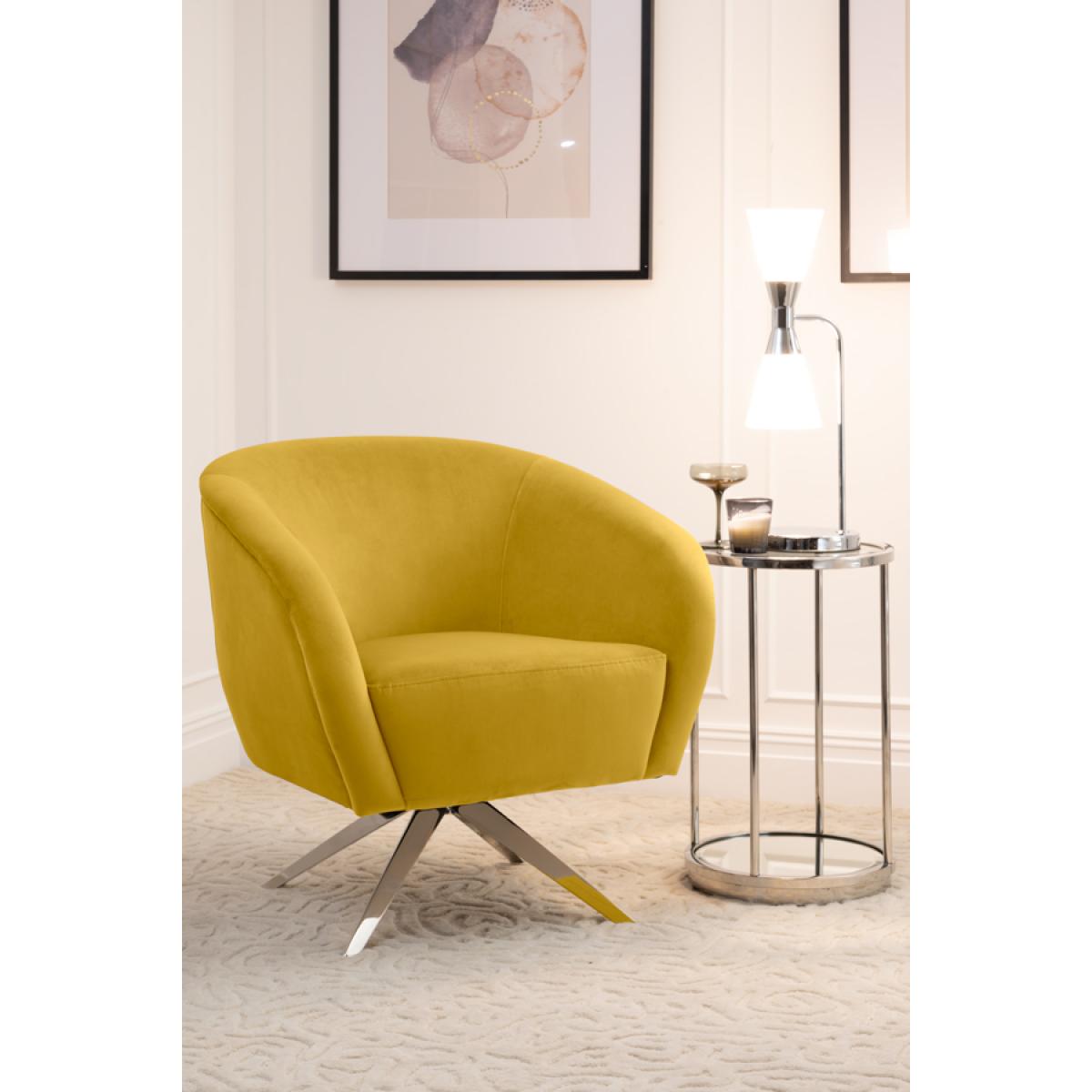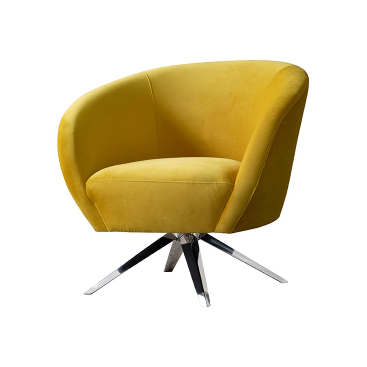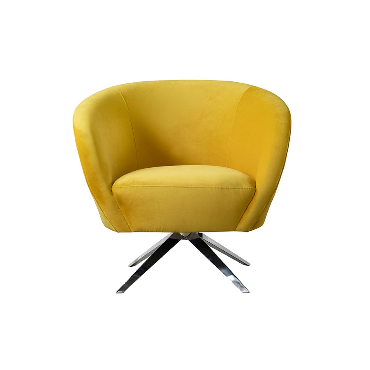 A striking lounge chair inspired by highly collectable Mid-Century American furniture. Sculptural swivel base with polished chrome finish. Comfortable sprung seat. Velvet upholstery fabric.