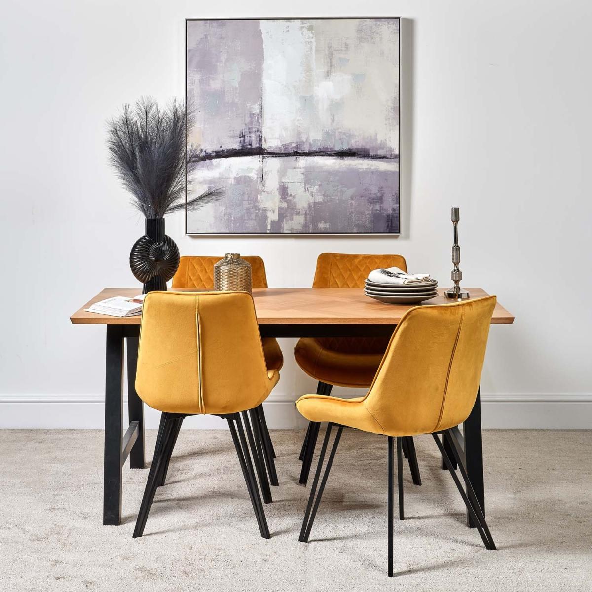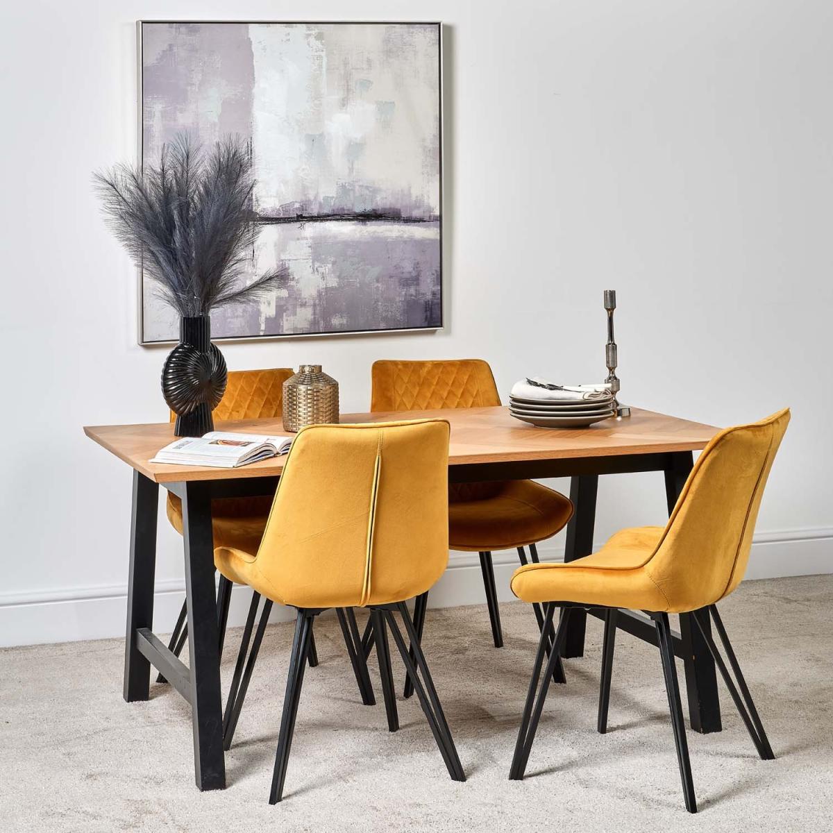 The Bromley Dining Table pairs a beautiful herringbone wood finish on the top with contrasting black painted legs for an industrial look. The table top is solid core with a veneer top, and has an exceptionally high build quality producting a sturdy dining table for any home. Finish the look off with our colourful Chase dining chair; a soft and sumptuous chair featuring a slightly bucketed seat with quilted upholstery and piping details, and industrial style black powder coated metal legs for support.