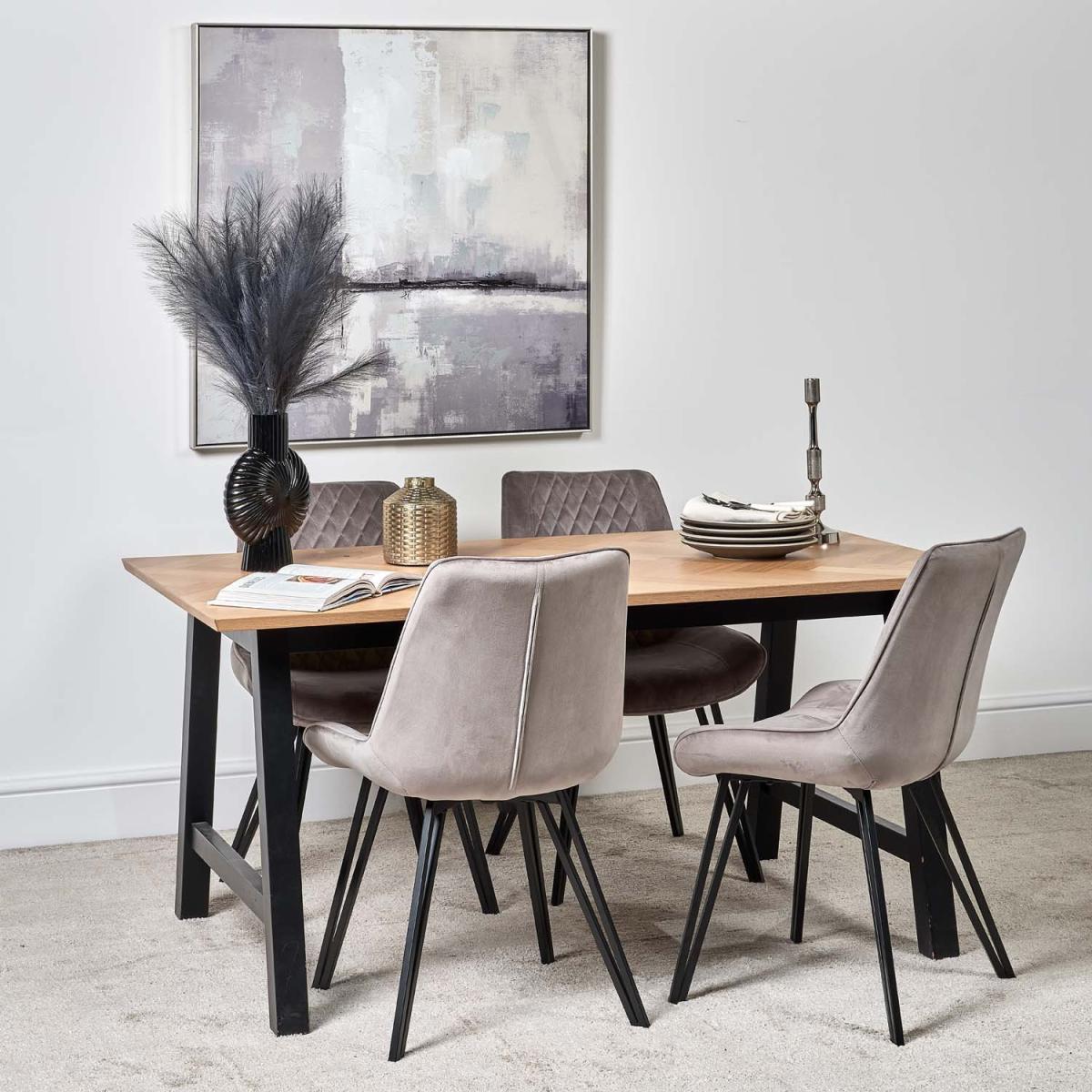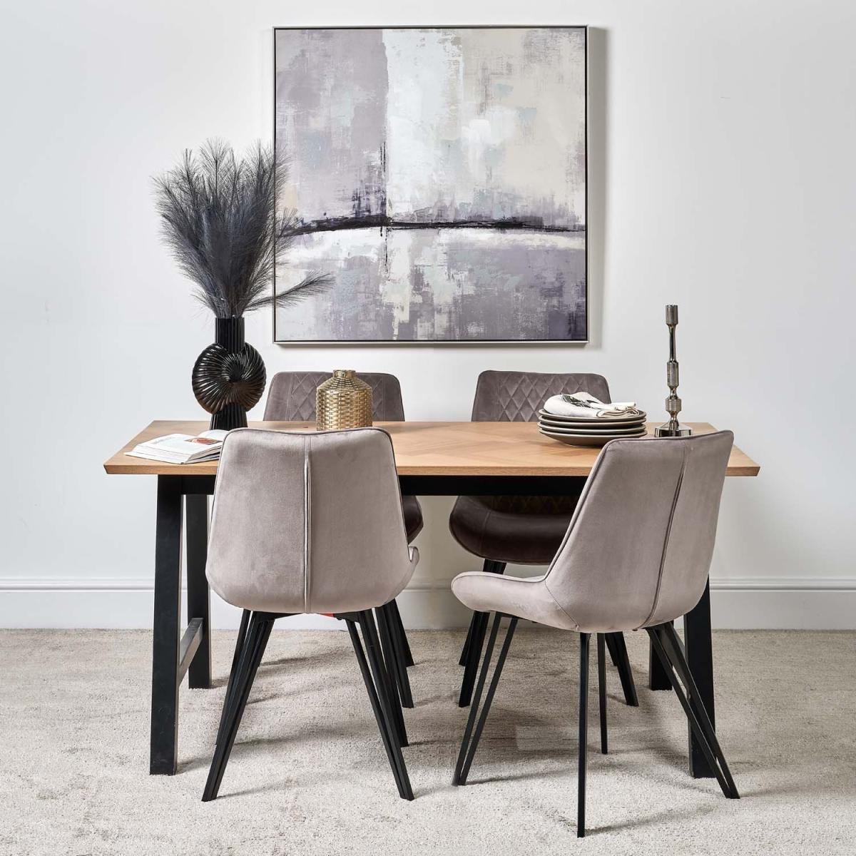 The Bromley Dining Table pairs a beautiful herringbone wood finish on the top with contrasting black painted legs for an industrial look. The table top is solid core with a veneer top, and has an exceptionally high build quality producting a sturdy dining table for any home. Finish the look off with our colourful Chase dining chair; a soft and sumptuous chair featuring a slightly bucketed seat with quilted upholstery and piping details, and industrial style black powder coated metal legs for support.