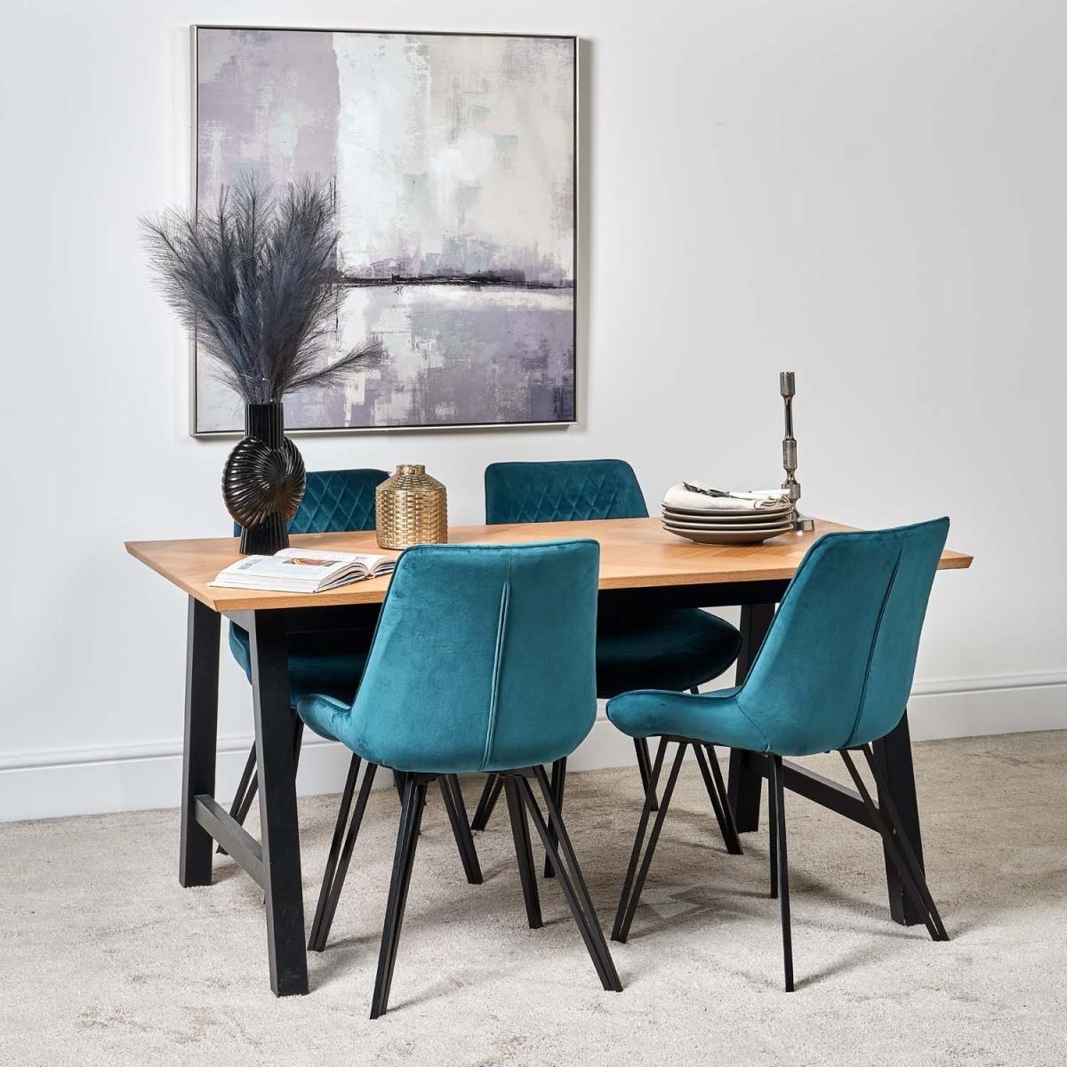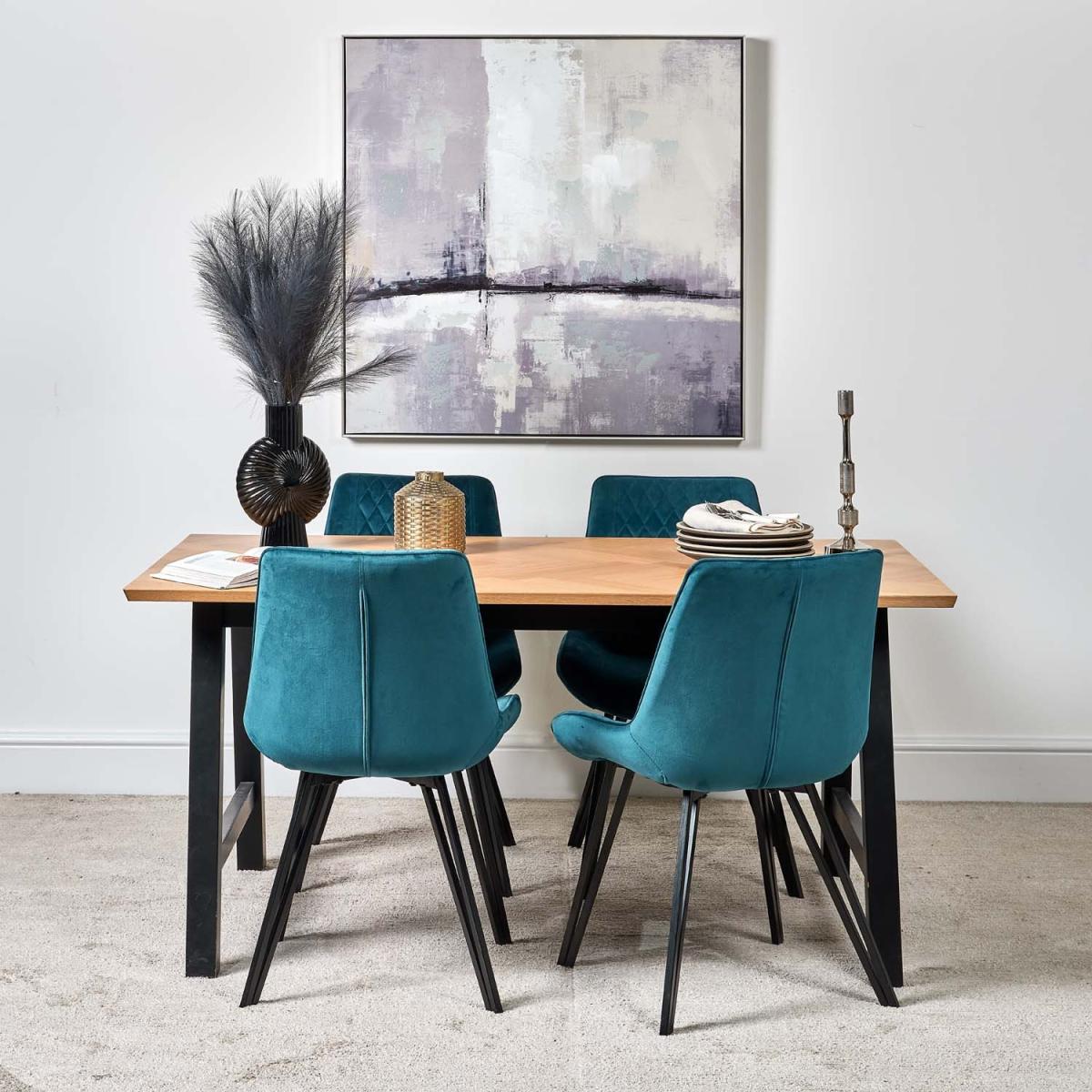 The Bromley Dining Table pairs a beautiful herringbone wood finish on the top with contrasting black painted legs for an industrial look. The table top is solid core with a veneer top, and has an exceptionally high build quality producting a sturdy dining table for any home. Finish the look off with our colourful Chase dining chair; a soft and sumptuous chair featuring a slightly bucketed seat with quilted upholstery and piping details, and industrial style black powder coated metal legs for support.