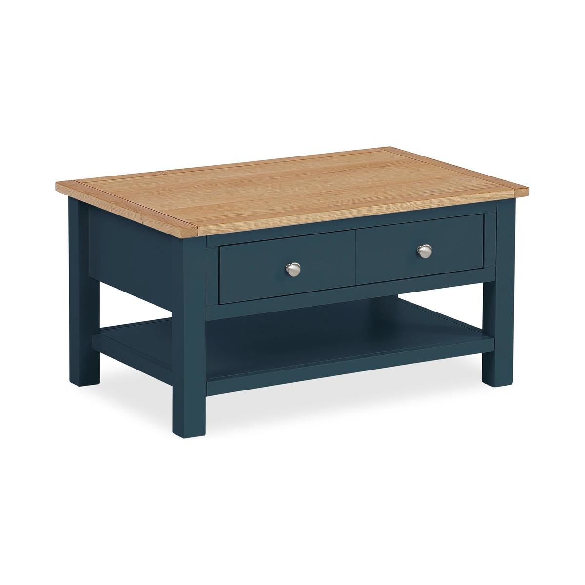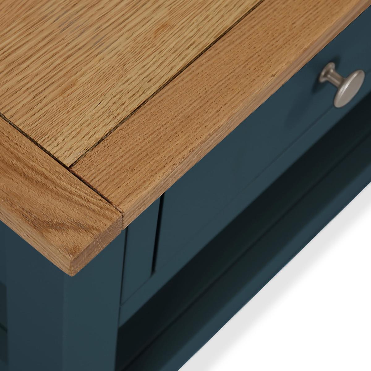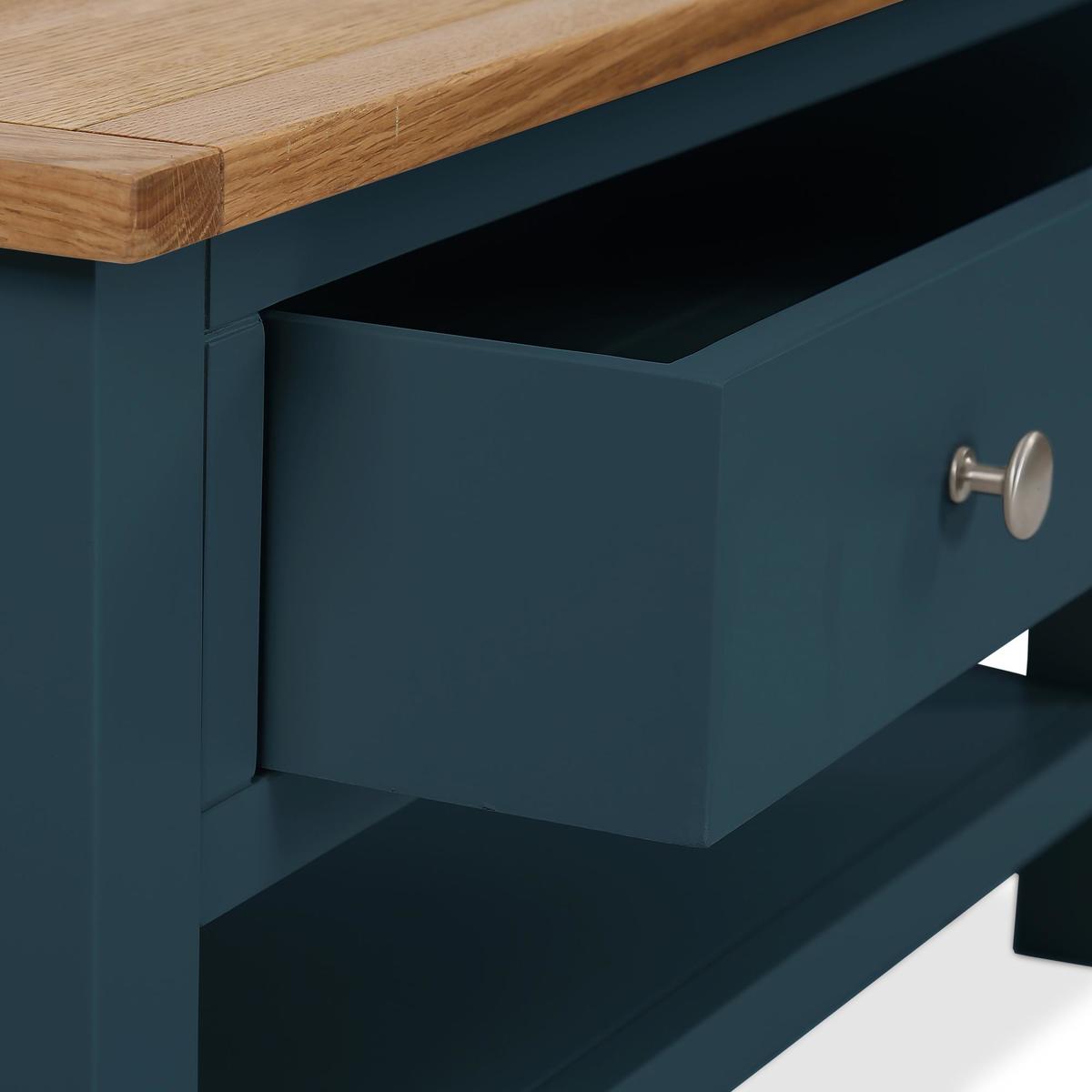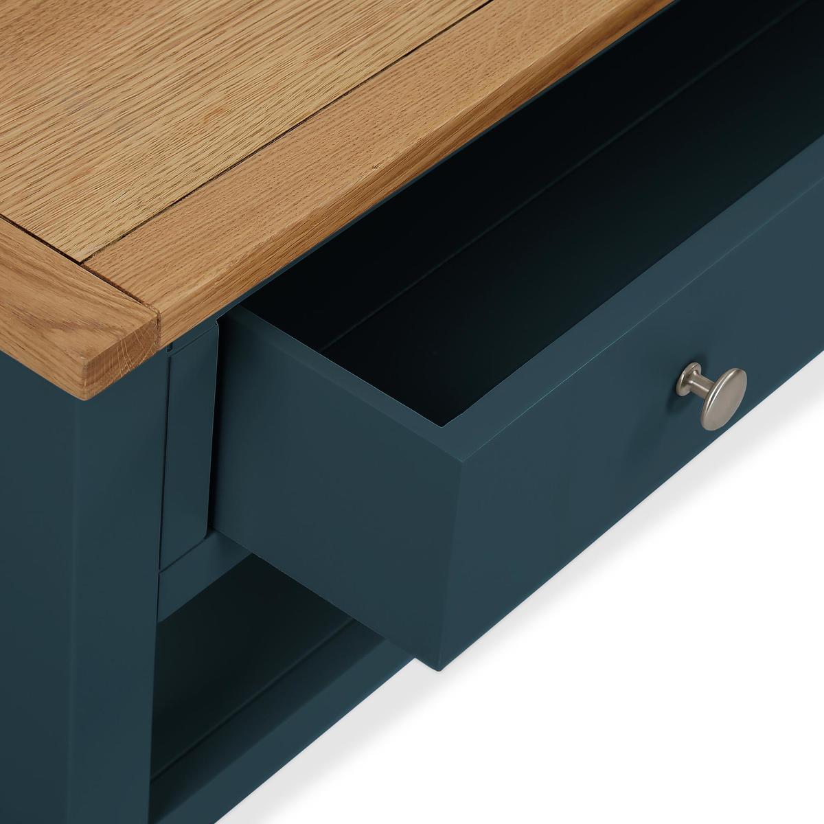 Dunelm Exclusive – Designed and Developed by Dunelm. The Bromley range is ideal for adding a country classic touch to your home, whilst having the advantage and flexibility of furnishing the most compact of living spaces. Constructed from a solid wood and oak veneer, each piece features blue paint with a contrasting wax finish. Supplied with smooth sliding drawers, this range comes complete with beautiful silver finished metal handles, perfect for a range of rooms in the home. This classic and stylish Bromley coffee table features a fixed shelf and a spacious drawer complete with smooth wooden runners, perfect for maximising storage space.