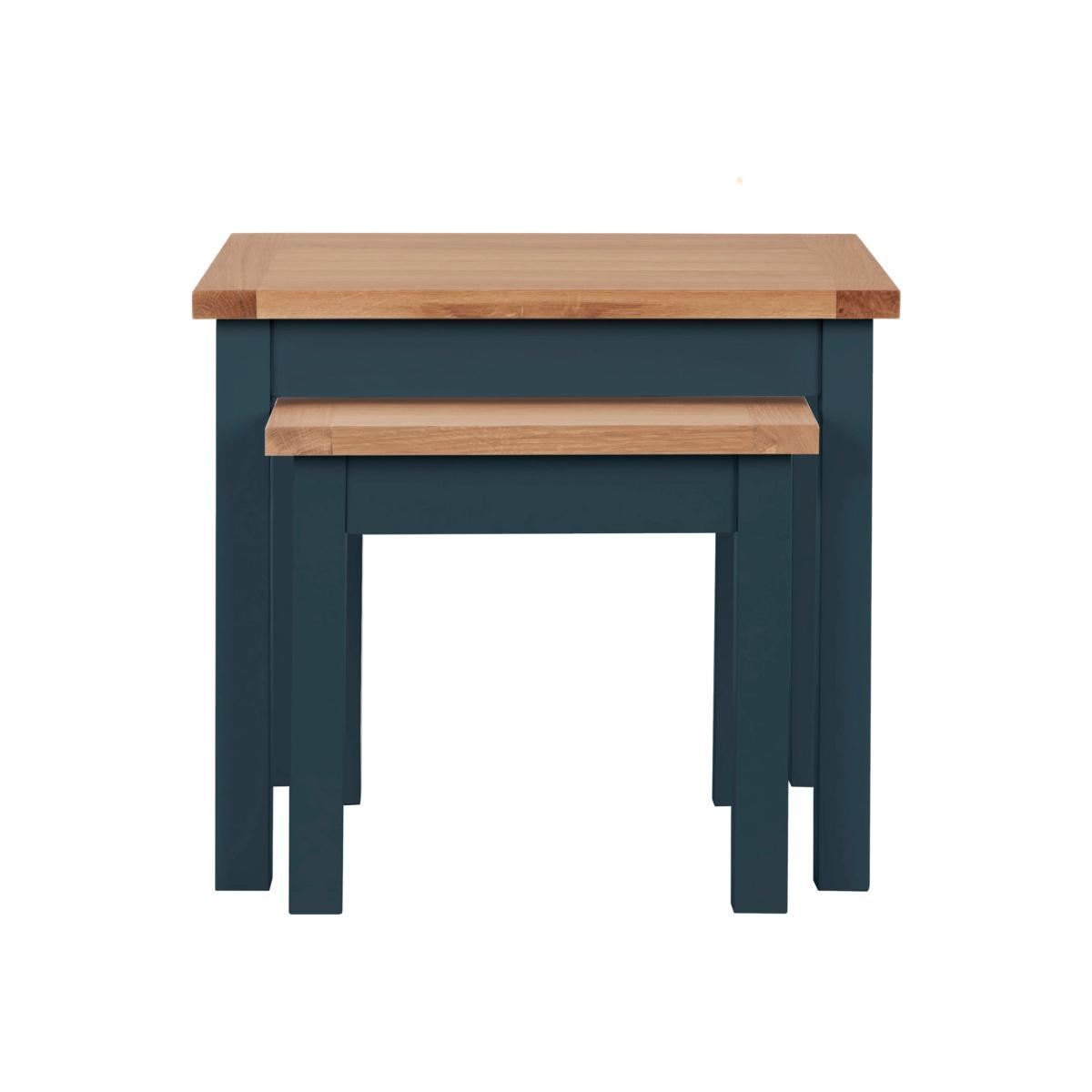 Dunelm Exclusive - Designed and Developed by Dunelm. The Bromley range is ideal for adding a country classic touch to your home, whilst having the advantage and flexibility of furnishing the most compact of living spaces. Constructed from a solid pine and oak veneer, each piece features blue paint with a contrasting waxed oak finish. Supplied with smooth sliding drawers, this range comes complete with beautiful silver coloured metal handles, perfect for a range of rooms in the home. Designed to maximise storage space, this partly assembled nest of tables features a minimalistic finish and comes complete with two assorted size tables that fit together neatly for convenience.