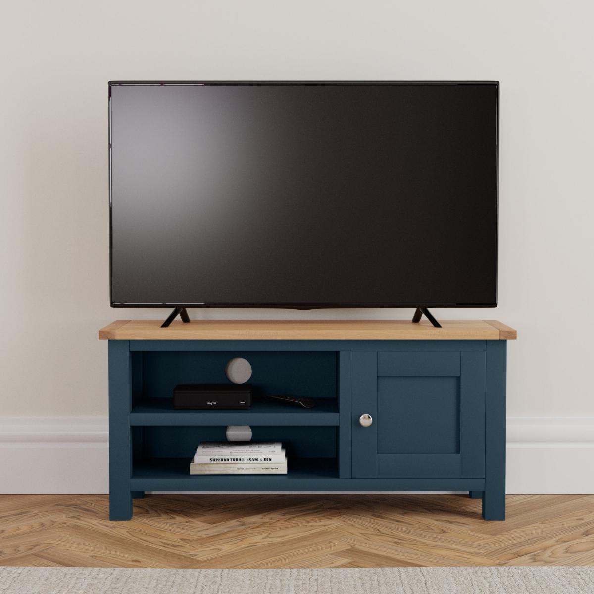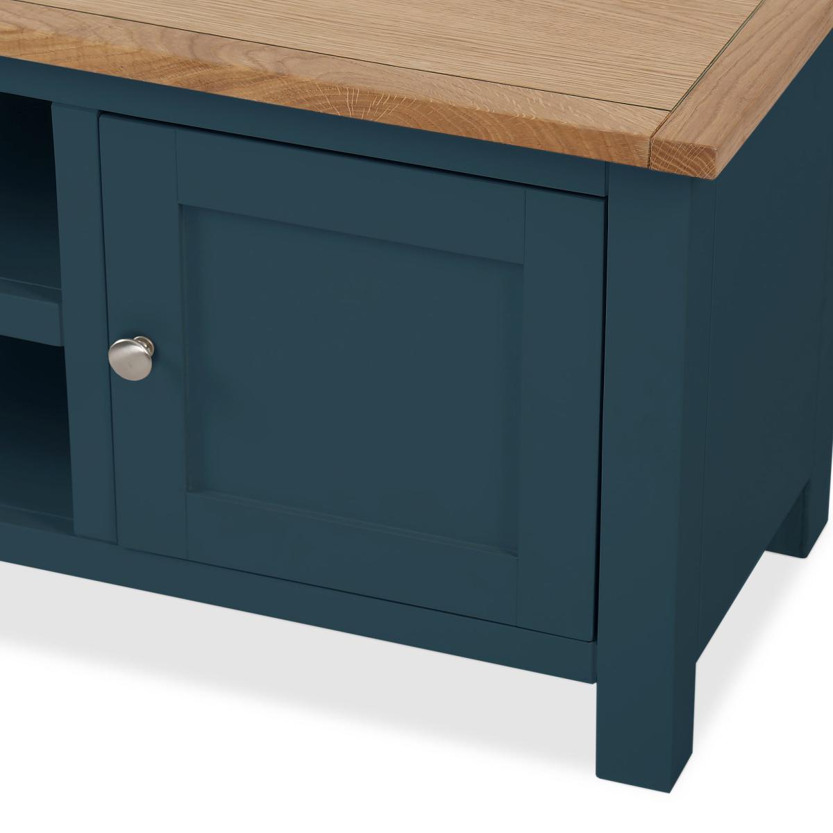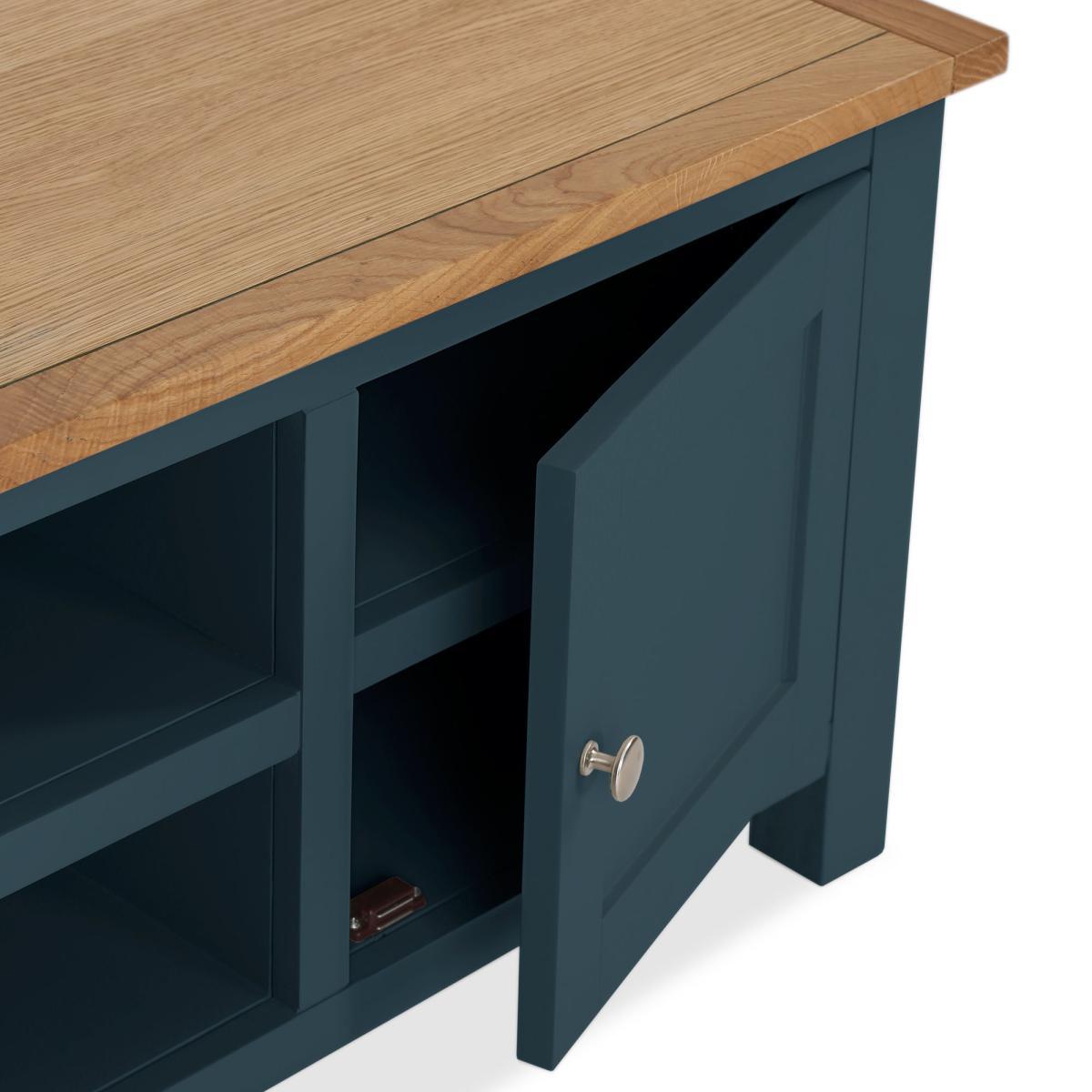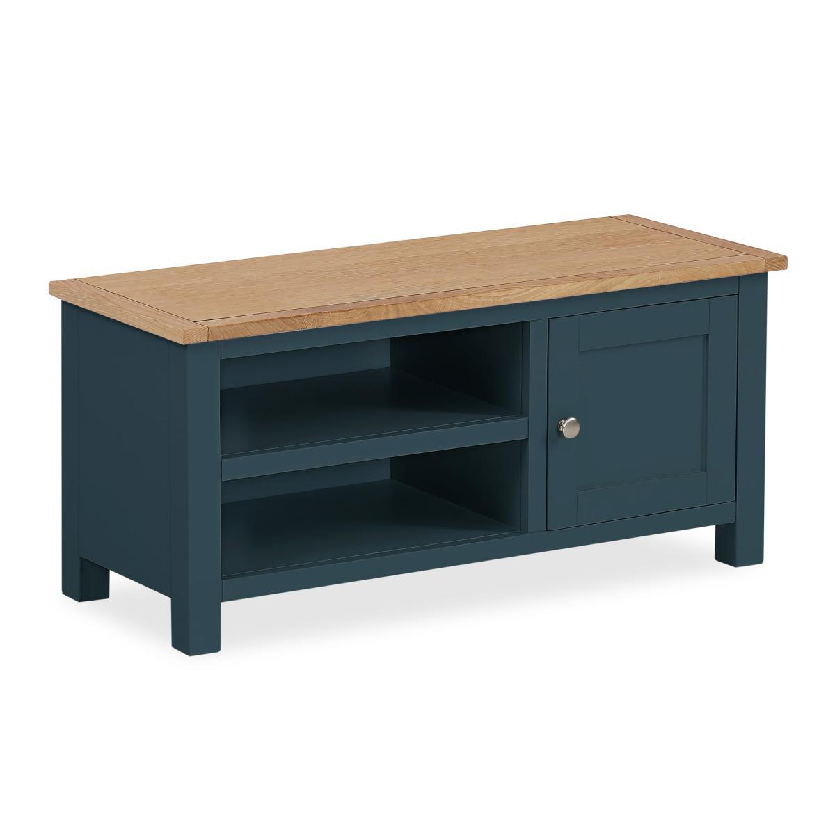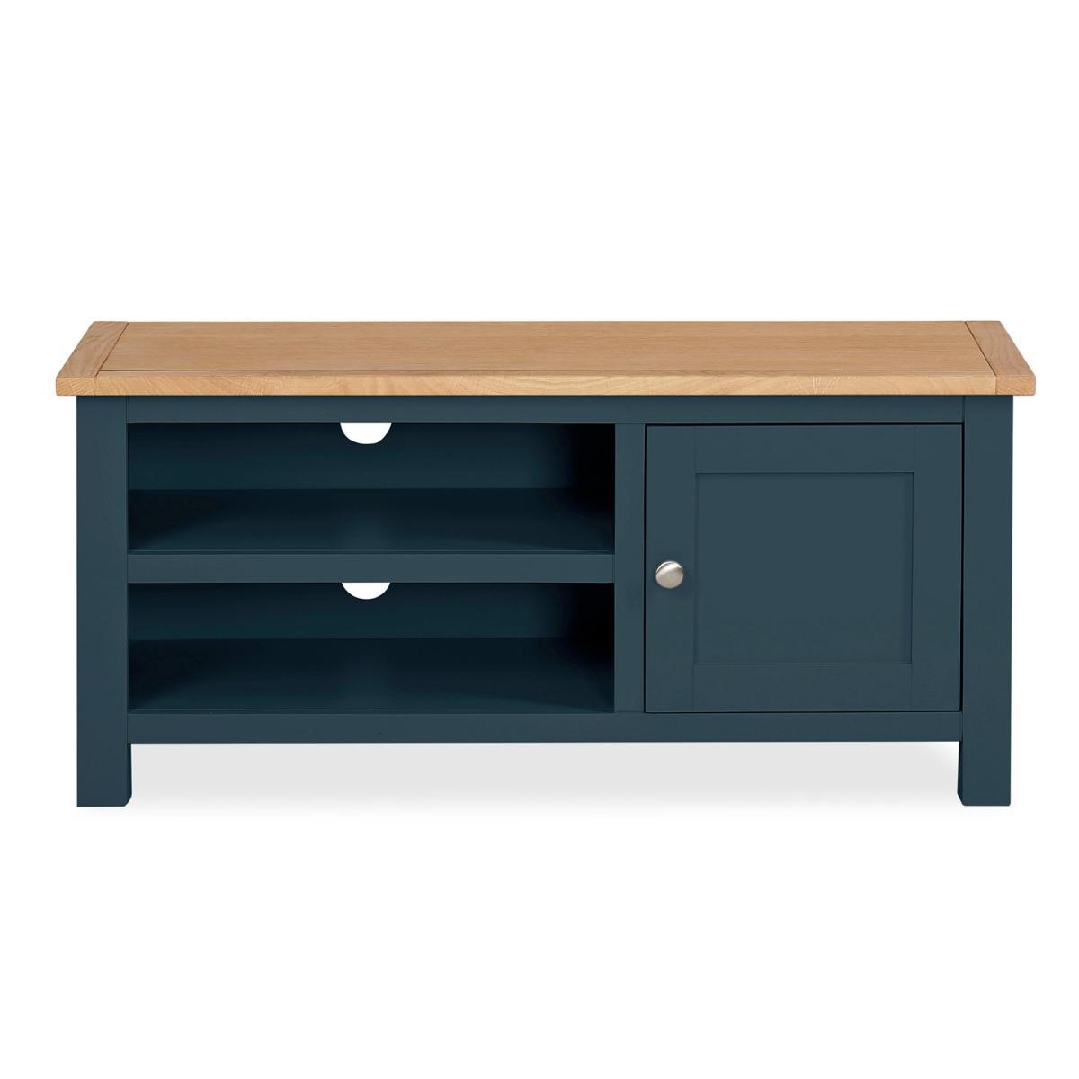 Dunelm Exclusive - Designed and Developed by Dunelm. The Bromley range is ideal for adding a country classic touch to your home, whilst having the advantage and flexibility of furnishing the most compact of living spaces. Constructed from a solid pine and oak veneer, each piece features blue paint with a contrasting waxed oak finish. Supplied with smooth sliding drawers, this range comes complete with beautiful silver coloured metal handles, perfect for a range of rooms in the home. Designed to boasts storage space, this fully assembled TV stand boasts one small cabinet and two shelves with convenient cable apertures. Item fully assembled.