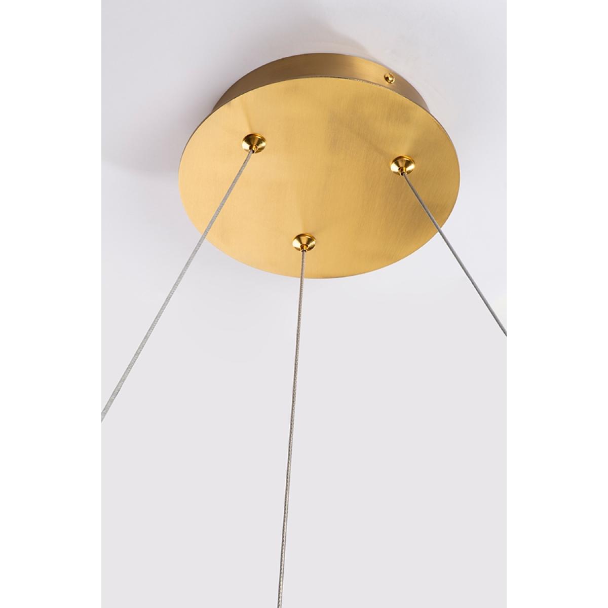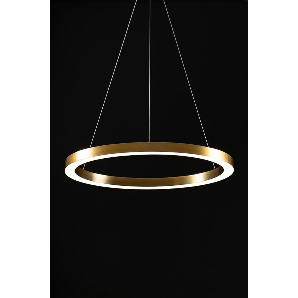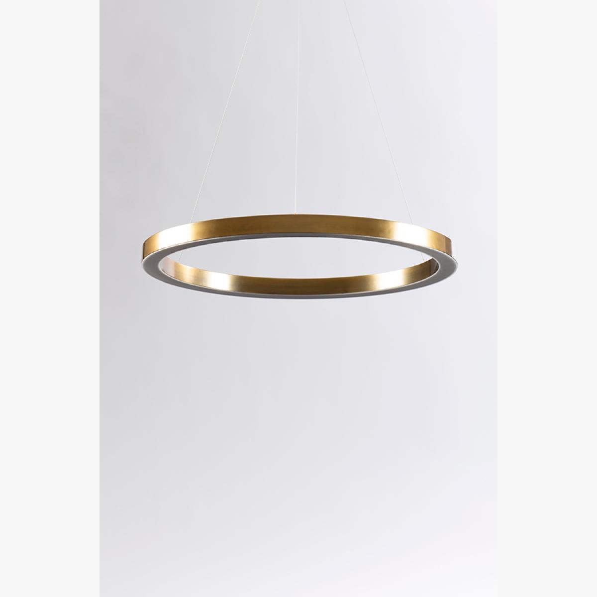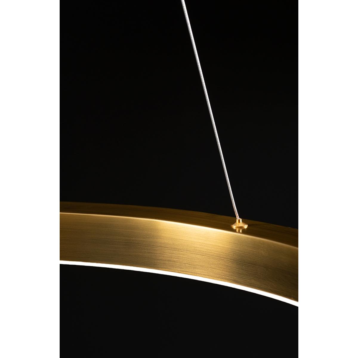 An impressive contemporary pendant light with a graphic, hoop silhouette. Steel with brushed brass finish. Simple height adjustable mechanism. Low energy LED light strip and driver concealed inside the structure. Frosted acrylic diffuser creates a practical yet ambient lighting mood. Supplied fully assembled.