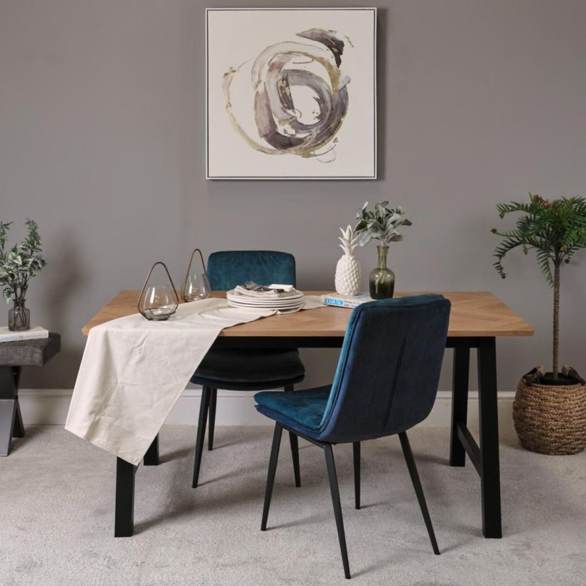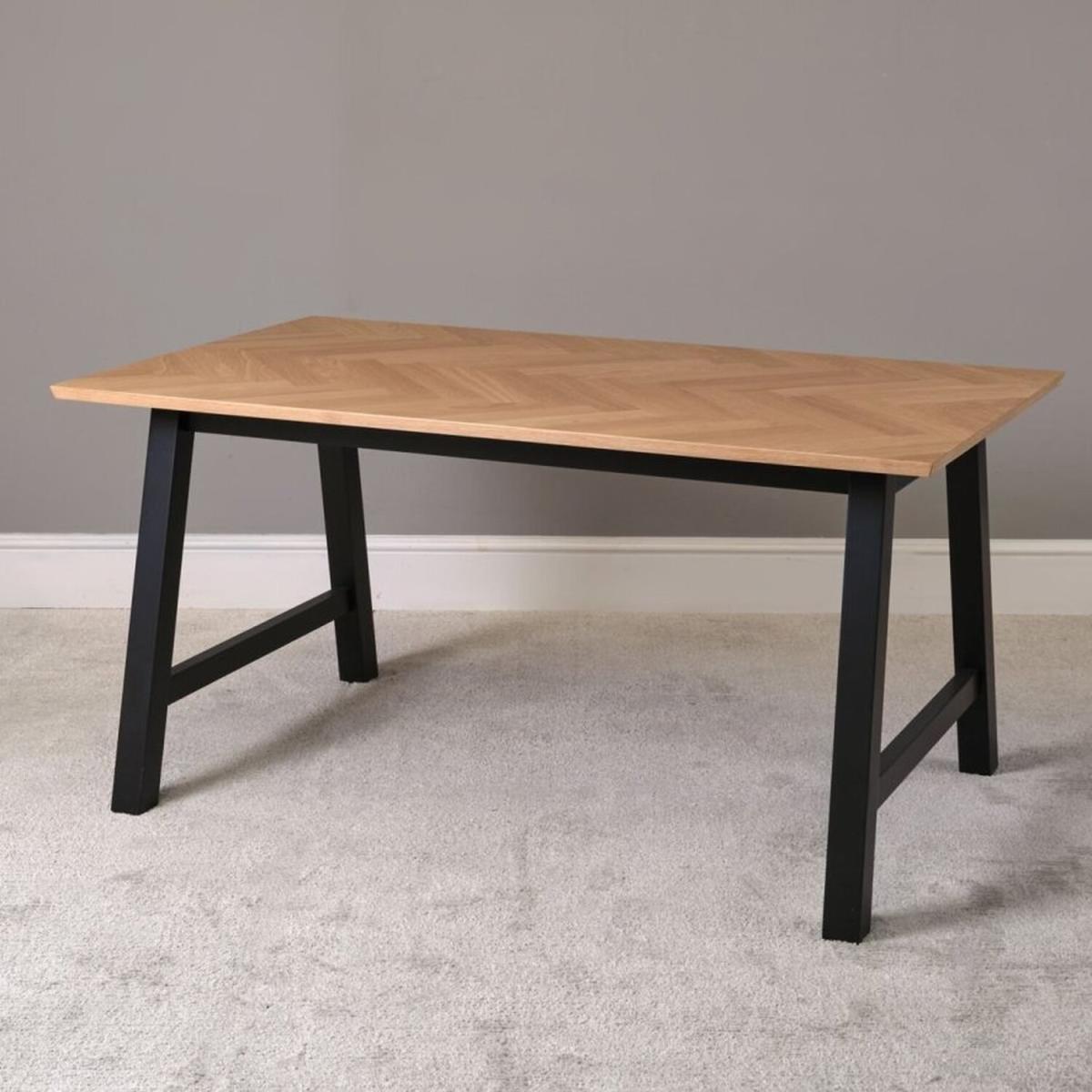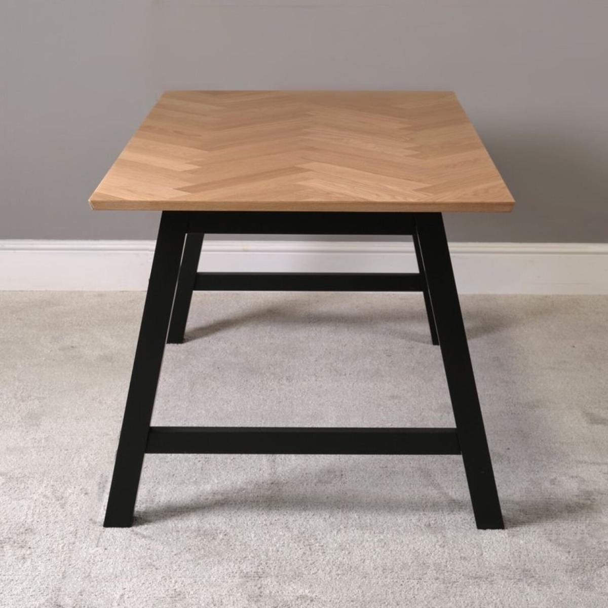 The Bromley Dining Table pairs a beautiful herringbone wood finish on the top with contrasting black painted legs for an industrial look. The table top is solid core with a veneer top, and has an exceptionally high build quality producting a sturdy dining table for any home.