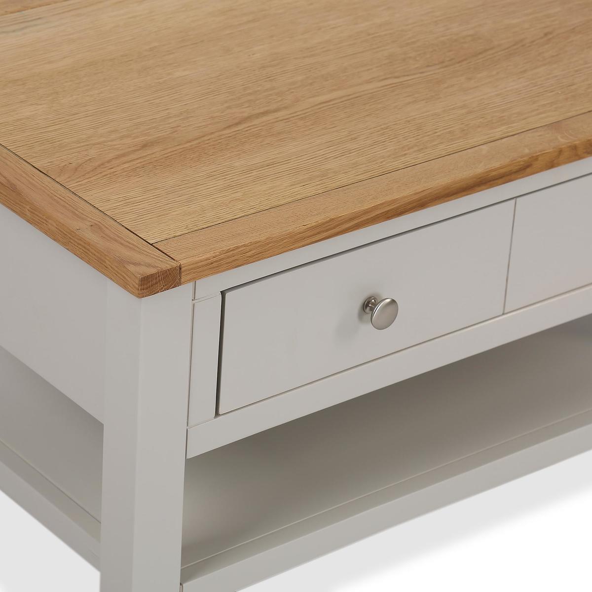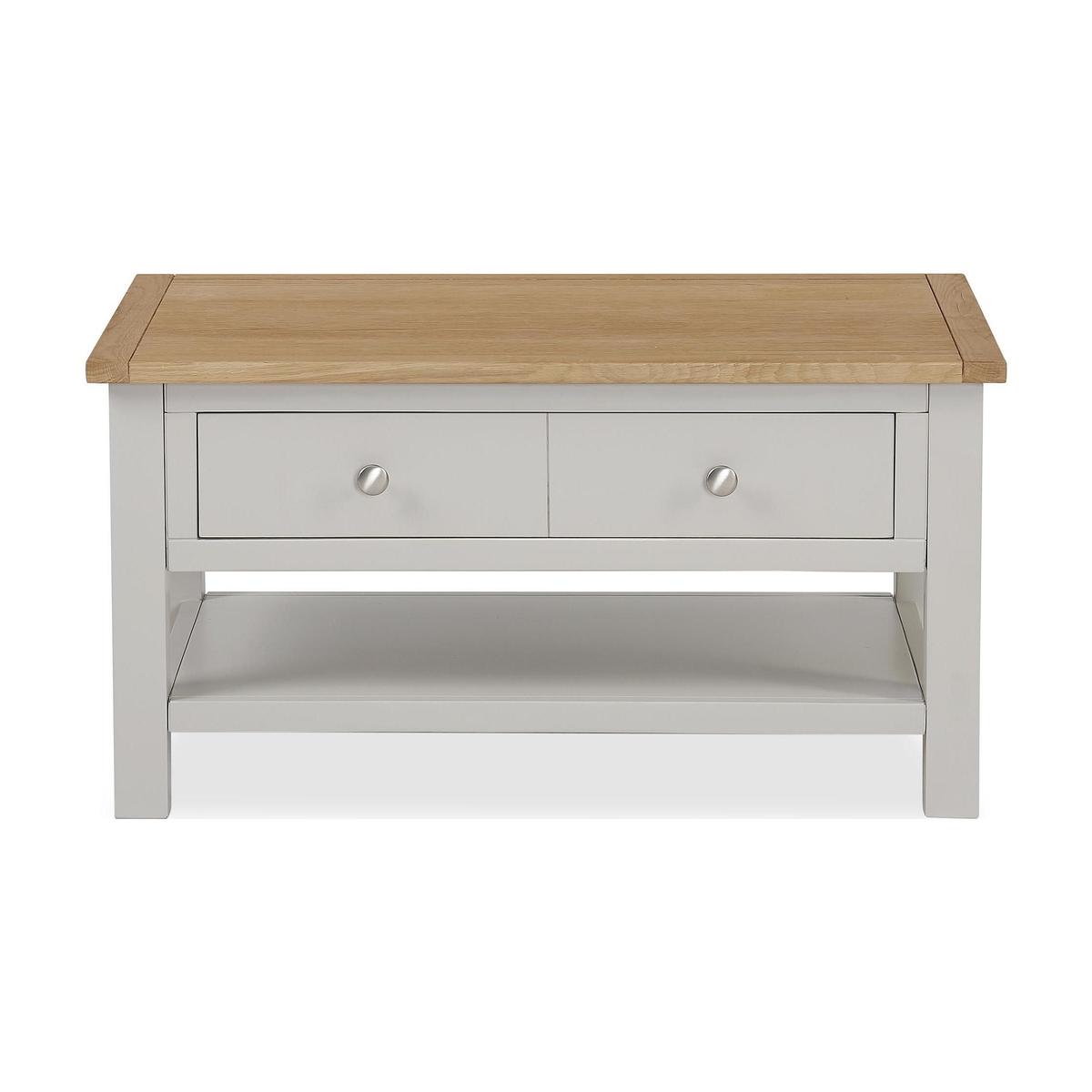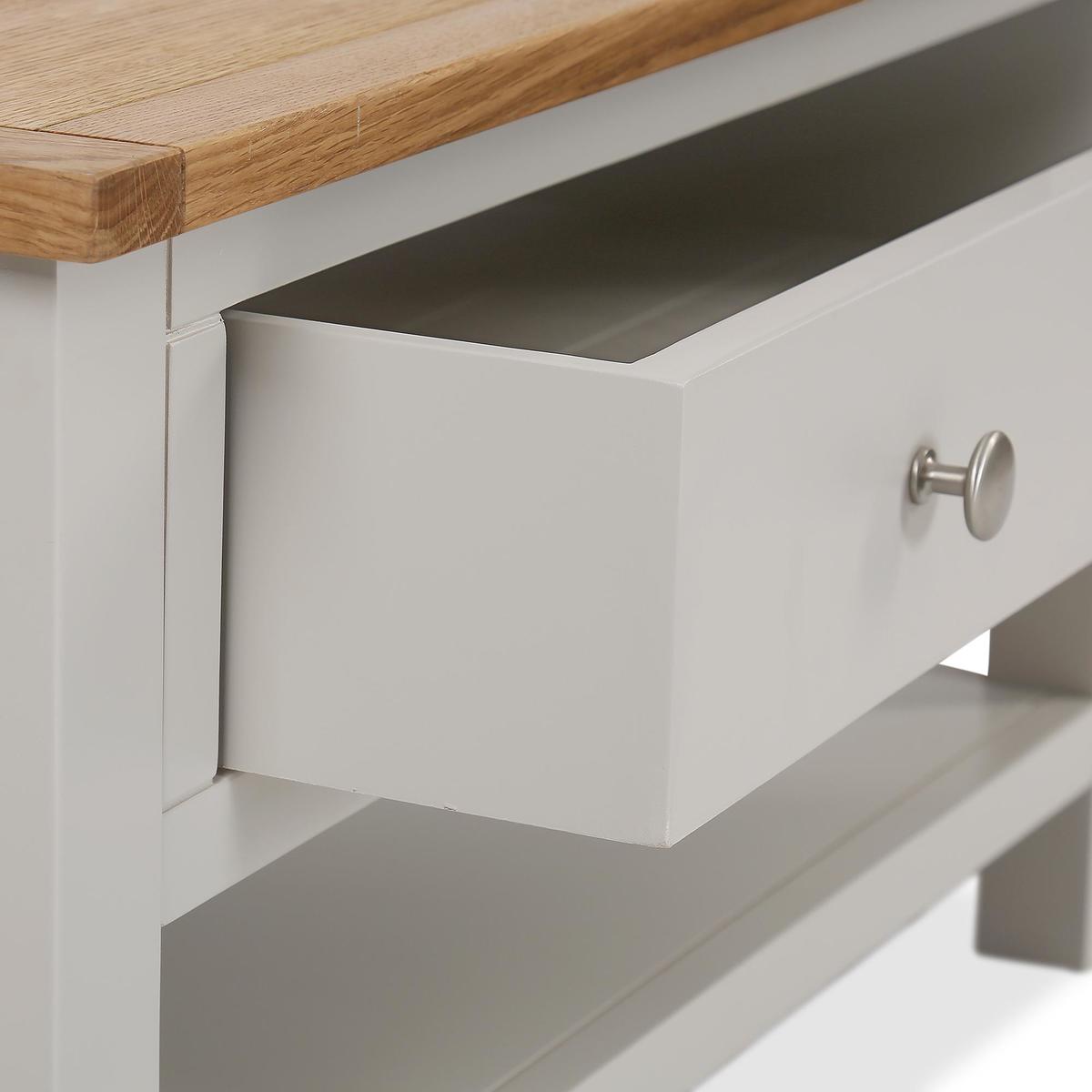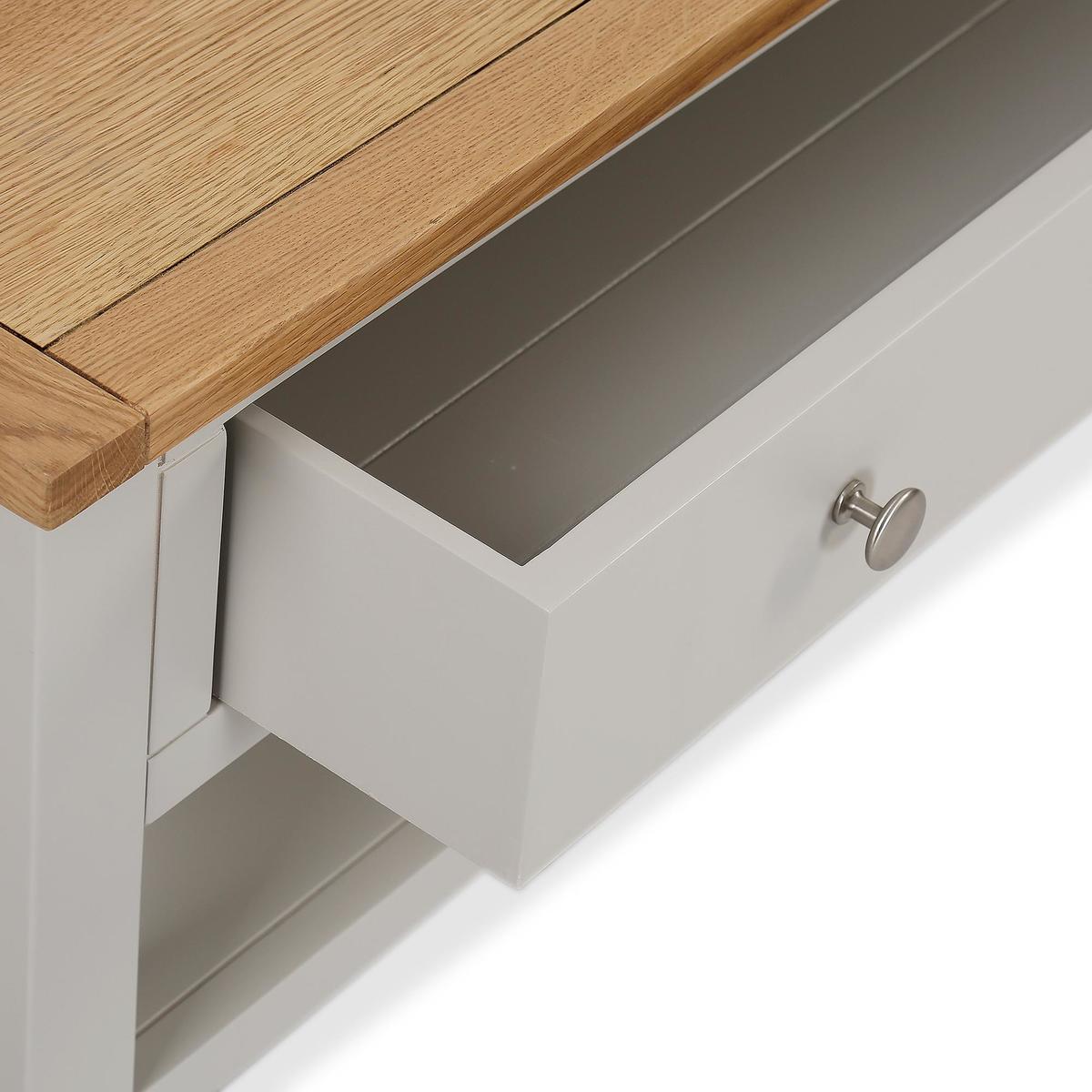 Dunelm Exclusive - Designed and Developed by Dunelm. The Bromley range is ideal for adding a country classic touch to your home, whilst having the advantage and flexibility of furnishing the most compact of living spaces. Constructed from a solid wood and oak veneer, each piece features soft grey paint with a contrasting waxed oak finish. Supplied with smooth sliding drawers, this range comes complete with beautiful silver coloured metal handles, perfect for a range of rooms in the home. Designed to provide ample storage space, this self assembly coffee table features one wide drawer and a low fixed shelf.