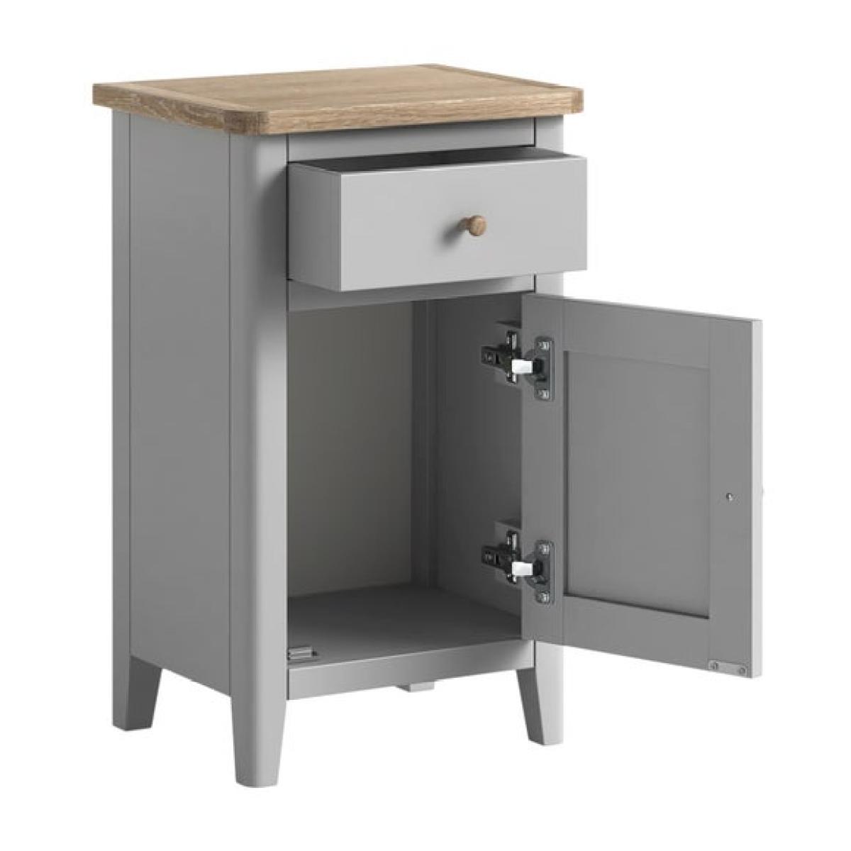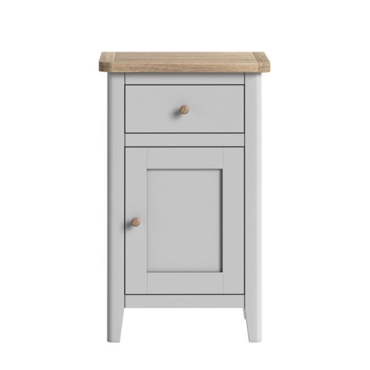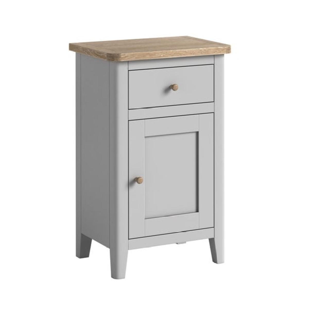 * Updated and improved Design of a Dunelm classic * Solid pine and oak veneer * Rounded wooden handles * Painted and wax finish A beautifully updated version of a much-loved classic, the Bromley 1 Door Bedside Cabinet combines timeless charm with practical function. Crafted from solid pine and oak veneer, this sturdy cabinet features a painted base paired with a contrasting wax-finished top for a warm, country-inspired aesthetic. A single drawer sits above a spacious cupboard, providing ample storage for your bedtime essentials while keeping your space tidy and serene. Rounded wooden handles add a soft traditional touch, making this the perfect companion to any rustic or modern farmhouse bedroom.
